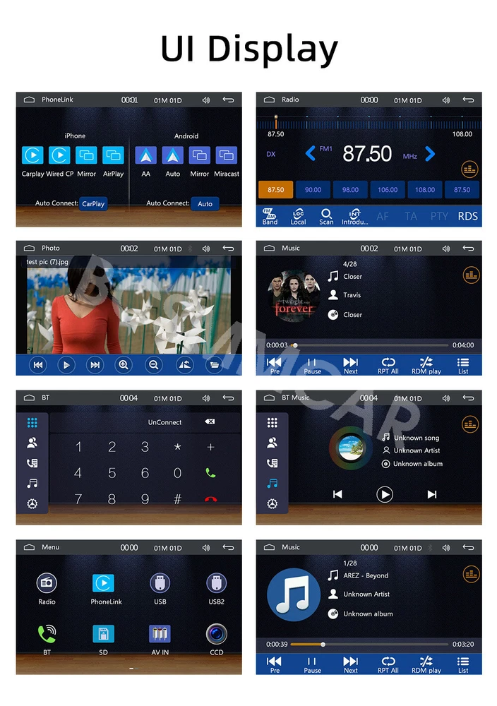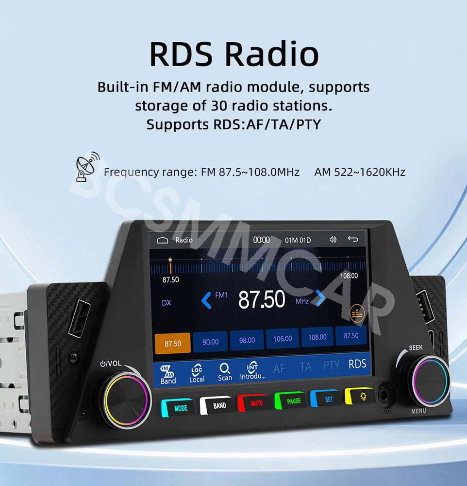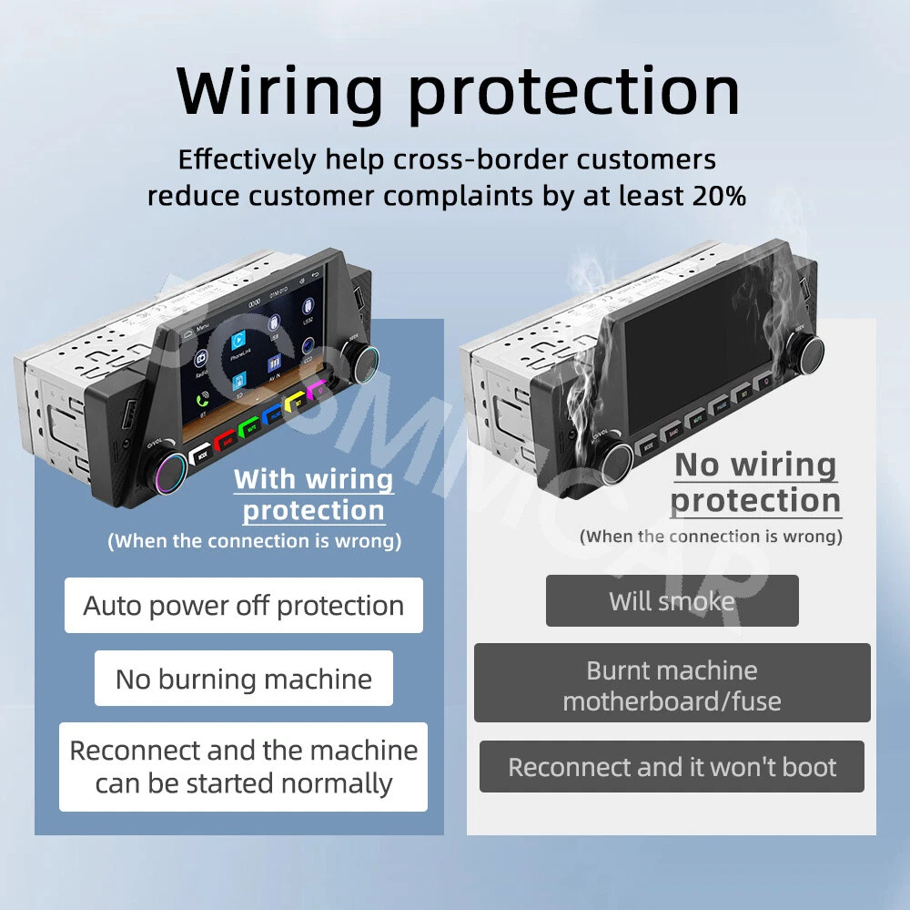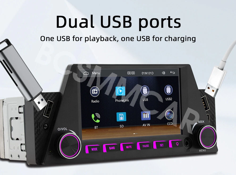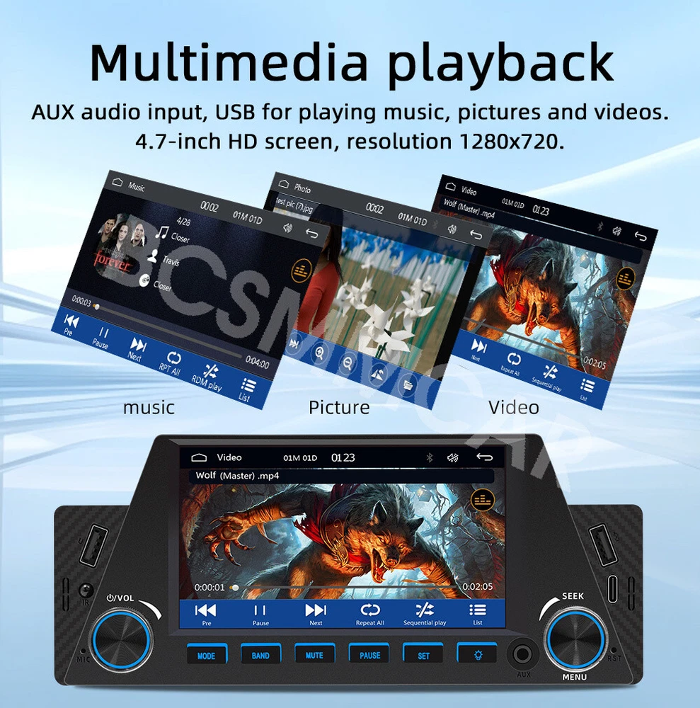 Product View Detail With 4LED Camera 1 Din 4.7inch MP5 Car Radio Multimedia Video Player Bluetooth Mirror Link FM Stereo For Wireless Android Auto Caplay Dual USB Note:Not is universal , Please check with your car panel's size !!! Basic parameters Model :161W Type: Car MP5 System: Overview Melis System Software solution: F133 Radio frequency: FM 87.5~108.0MHz AM 522~1620KHz (switchable between radio frequencies in China, America 1, America 2, Japan, Russia, Middle East, and Europe) Radio IC: SI4732 Amplifier IC: CD7388CZ Output power: 60Wx4 Working voltage: 12~14.4V Working temperature: -10~60 ℃ Bluetooth version: 5.1 (default name: SWL-BT) WiFi frequency: options include 2.4G, 5.2G, 5.8G, and can be used for wireless connections CPU: F133 Running memory: 533M Display resolution: 1280x720 Screen size: 4.7 inches Installation size: 178x52MM Shell size :188x83MM Host depth: 95MM Functional parameters Mobile Internet: Support Reverse image: support (included 4LED camera) Video playback warning: support Steering wheel control :supports button learning Video output: support USB: front USB charging+front USB 2.0 reading+rear USB 2.0 reading Reset button support Audio output: 2 channels (left channel+right channel) Video output :2 channels Rear external microphone input: support (optional external microphone configuration) Video input 1: channel Reverse video input: 1 channel Audio format: MP3/AAC/APE/OGG/M4A/RA/WAV Video format: H263/H264/H265/DIVX HD (720P 1080I 1080P) AVI/FLV/MKV/MPEG/MP4/WMV9/VC/ASF/TS/QT Image format JPEG/PNG/BMP/GIF/TIFF Language parameters:English, Chinese, French, German, Arabic, Italian, Japanese, Portuguese, Russian, Spanish, Hebrew, Polish, Türkiye, Czech, Dutch Factory password: 113266 Accessories 1. Host 2. Manual 3. Power cord 4. Remote control 5. Loading key (accessories, manual, packaging may be updated from time to time, subject to actual receipt) 6.4LED Rear Camera Basic functions 1. Radio 2. USB flash drive (audio/video/image) 3. Bluetooth function 4. RCA audio output can be connected to a subwoofer 5. Reverse rearview function 6. Video input 7. Original steering wheel learning function 8. Wired and wireless mobile phone interconnection; Wired and wireless Android AUTO/Apple CarPlay 9. Colorful lights 10. Rear USB 11. USB charging interface 12. Power supply positive and negative polarity reverse protection function 13. RDS function 14. TYPE-C charging interface Shipping Policy Payment Method Returns Policy Shipping Policy Payment Method Returns Policy Copyright © 2017 DataCaciques Home Payment Shipping About us Contact us BCSMMCAR Store Categories Store Categories Other Product View Detail With 4LED Camera 1 Din 4.7inch MP5 Car Radio Multimedia Video Player Bluetooth Mirror Link FM Stereo For Wireless Android Auto Caplay Dual USB Note:Not is universal , Please check with your car panel's size !!! Basic parameters Model :161W Type: Car MP5 System: Overview Melis System Software solution: F133 Radio frequency: FM 87.5~108.0MHz AM 522~1620KHz (switchable between radio frequencies in China, America 1, America 2, Japan, Russia, Middle East, and Europe) Radio IC: SI4732 Amplifier IC: CD7388CZ Output power: 60Wx4 Working voltage: 12~14.4V Working temperature: -10~60 ℃ Bluetooth version: 5.1 (default name: SWL-BT) WiFi frequency: options include 2.4G, 5.2G, 5.8G, and can be used for wireless connections CPU: F133 Running memory: 533M Display resolution: 1280x720 Screen size: 4.7 inches Installation size: 178x52MM Shell size :188x83MM Host depth: 95MM Functional parameters Mobile Internet: Support Reverse image: support (included 4LED camera) Video playback warning: support Steering wheel control :supports button learning Video output: support USB: front USB charging+front USB 2.0 reading+rear USB 2.0 reading Reset button support Audio output: 2 channels (left channel+right channel) Video output :2 channels Rear external microphone input: support (optional external microphone configuration) Video input 1: channel Reverse video input: 1 channel Audio format: MP3/AAC/APE/OGG/M4A/RA/WAV Video format: H263/H264/H265/DIVX HD (720P 1080I 1080P) AVI/FLV/MKV/MPEG/MP4/WMV9/VC/ASF/TS/QT Image format JPEG/PNG/BMP/GIF/TIFF Language parameters:English, Chinese, French, German, Arabic, Italian, Japanese, Portuguese, Russian, Spanish, Hebrew, Polish, Türkiye, Czech, Dutch Factory password: 113266 Accessories 1. Host 2. Manual 3. Power cord 4. Remote control 5. Loading key (accessories, manual, packaging may be updated from time to time, subject to actual receipt) 6.4LED Rear Camera Basic functions 1. Radio 2. USB flash drive (audio/video/image) 3. Bluetooth function 4. RCA audio output can be connected to a subwoofer 5. Reverse rearview function 6. Video input 7. Original steering wheel learning function 8. Wired and wireless mobile phone interconnection; Wired and wireless Android AUTO/Apple CarPlay 9. Colorful lights 10. Rear USB 11. USB charging interface 12. Power supply positive and negative polarity reverse protection function 13. RDS function 14. TYPE-C charging interface Shipping Policy Payment Method Returns Policy Contact US Shipping Policy All items will be checked before packing. All items are new and of high quality. Item will be shipped within 1 business days upon receipt of payment, excluding weekends and public holidays. If to USA,we will ship your order by USPS,it will take about 8-12 working days to you,and you can track it on line. If to other country,we will ship your order by China Post or Singapore Registered Air Mail,it will take about 14-21 working days to you,you aslo can track it on line. Delivery time is about 14-28 business days and it may take up to 8 weeks . Payment Method We accept payment by PayPal only ! Payment should be completed within 5 days after buyer places the order,or else an unpaid case will be opened in order to cancel the transaction. If you can not pay in time, please contact us. e-check from PayPal will only be processed once the