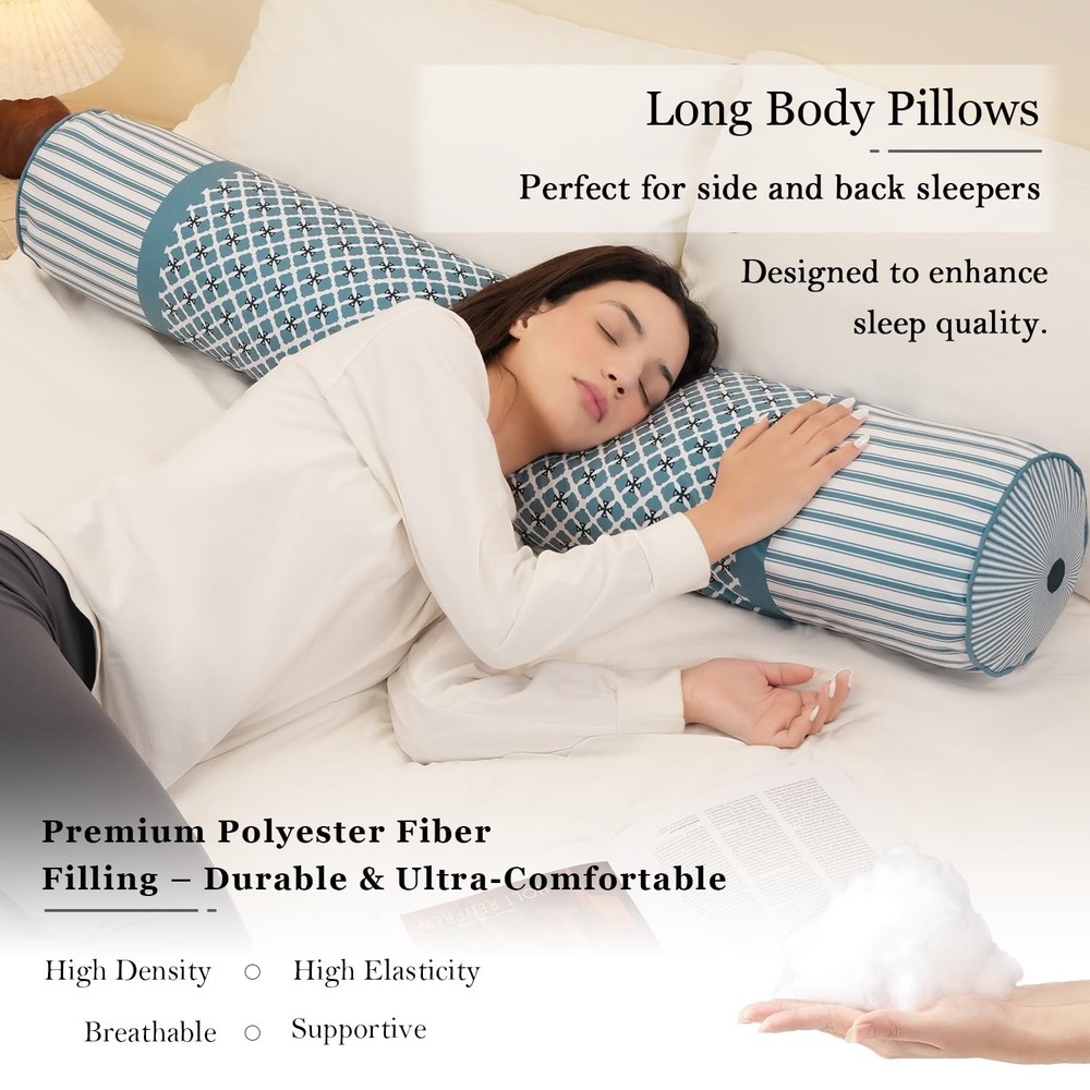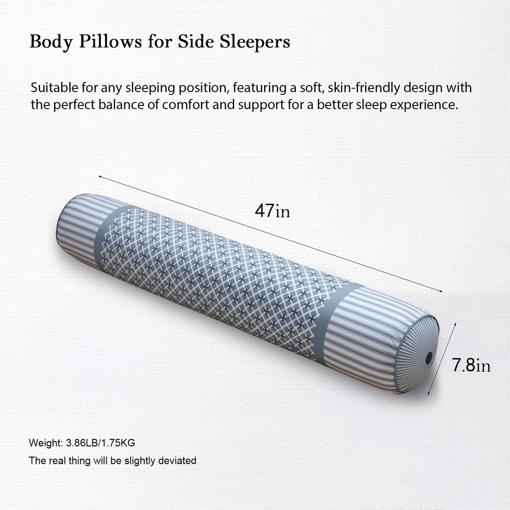 Product Size: Length: 47in, Width: 7.8in Filler Material: Silk Floss Special Feature: Filler Adjustable; Removable Cover Long Round Body Pillows: Our body pillows is long and dimensioned to the size of 47inx7.8in (length of 120cm), and applicable to any sleeping position, appropriate rebound to bring you a better sleep experience. High Quality Material: The cover of the pillow is polyester plush fabric, soft and breathable, and the interior is filled with environmentally friendly polyester silk floss, high density and ultra-high elasticity to make the pillow more suitable for a variety of sleeping positions, while providing proper support. Multi-purpose use: It is also suitable for pregnant women, men, teenagers, etc. It can be used as an upholstered pillow to relieve pressure on your back when sleeping on your side, and as a tube pillow under your legs and feet when sleeping on your back. Designed for Better Sleep Quality: Perfect for side and supine sleepers, it can well improve and relax your, back, neck and abdome, provide a better sleep quality. Instructions for Use: When you receive your pillow, please pat and squeeze it to restore its full and fluffy shape.Detachable cover for easy cleaning. Note: Do not wash at high temperature, hand wash or gentle machine wash, avoid exposure to sunlight. If you have any quation, please contact our customer service support.