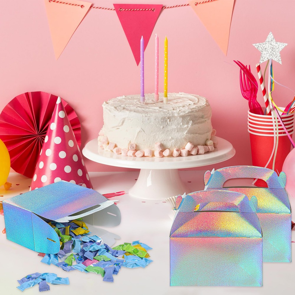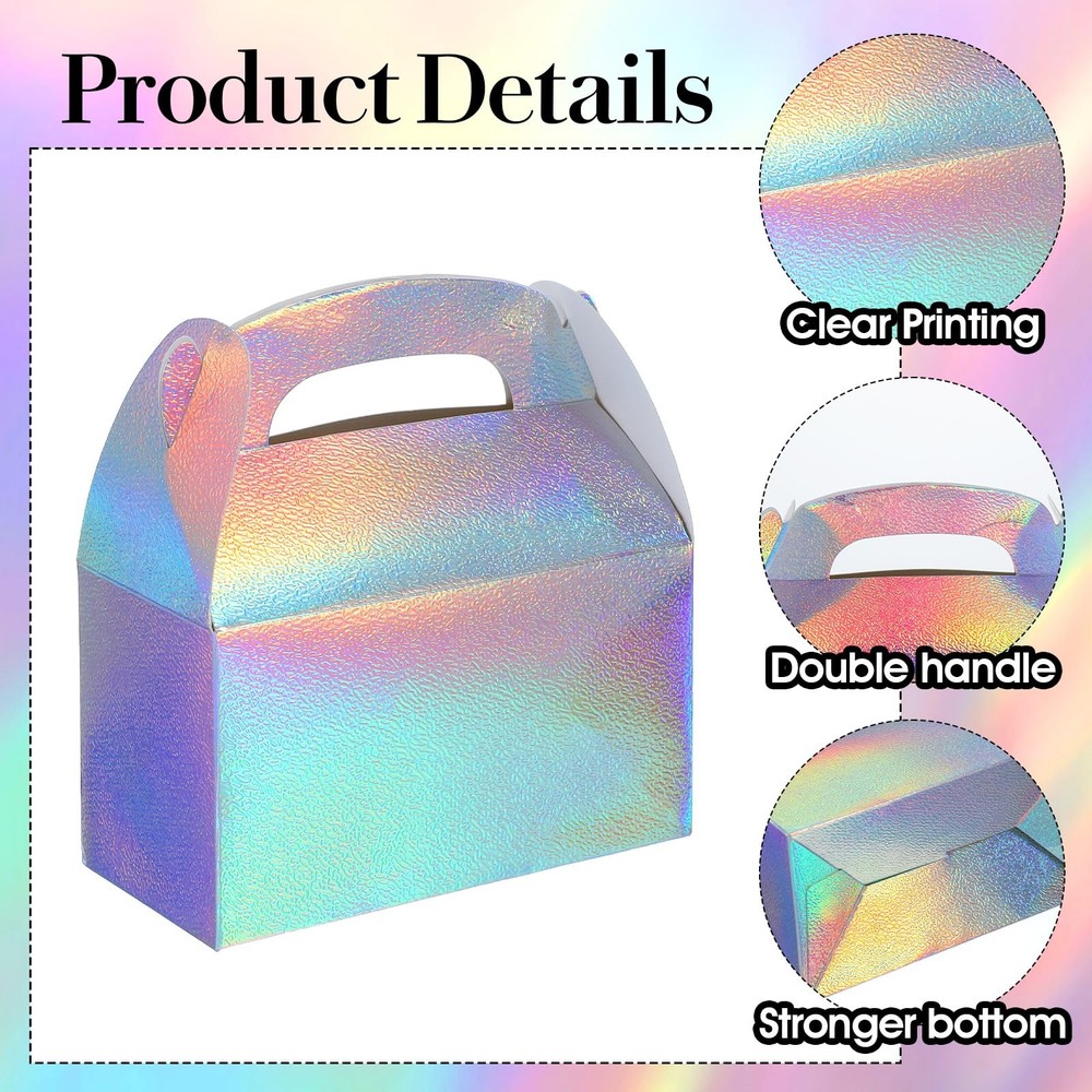 Features: Stunning 48-piece set of iridescent party favor boxes, designed to elevate any celebration with their mesmerizing holographic finish. These gable boxes are perfect for party favors, birthdays, weddings, and more, offering a unique and eye-catching way to present your gifts. The rainbow gift bags are not only visually appealing but also durable, Surface waterproof, and oil-repellent boxes are perfect for securing snacks, desserts, or crafts, ensuring your treats are securely stored. Specifications: Color: Iridescent Material: Cardboard Dimensions: 16x9x8.5 cm/6.3x3.5x3.3 inches Packaging List: 48 x Iridescent Party Favor Boxes Notes: Manual measurement, please allow 1-2cm error exists. The color may have color difference due to different monitors. Sparkling Goodie Boxes: includes 30 piece of iridescent party favor boxes, features a captivating holographic design, perfect for birthdays, weddings, and festive celebrations. Iridescent treat boxes are ideal for snacks, candy, toys or crafting gifts Durable: Each gable measures 6.3" x 3.5" x 3.3", providing ample room for party favors, toys, and treats. These candy boxes are made from sturdy and recyclable cardboard , sturdy and reliable, shiny favor boxes will make your presents stand out Pop-Up Design: Designed with a convenient pop-up bottom, these gable boxes for party favors are easy to assemble, saving time on party setup. Includes handles for convenient carrying, of the best rainbow gift bags for any special event Versatile Treat : These party favor boxes can be personalized with stickers, ribbons, graffiti, draw or tags, allowing you to create unique goodie boxes for your guests. Decor your party with shiny cardboard boxes that everyone will love Celebration Essential: Whether it's a , wedding, Christmas, or any festive occasion, these holographic bags are a must-have for creating memorable party experiences. Elevate your event with these stunning candy boxes, bring a classy and festive touch to your party
