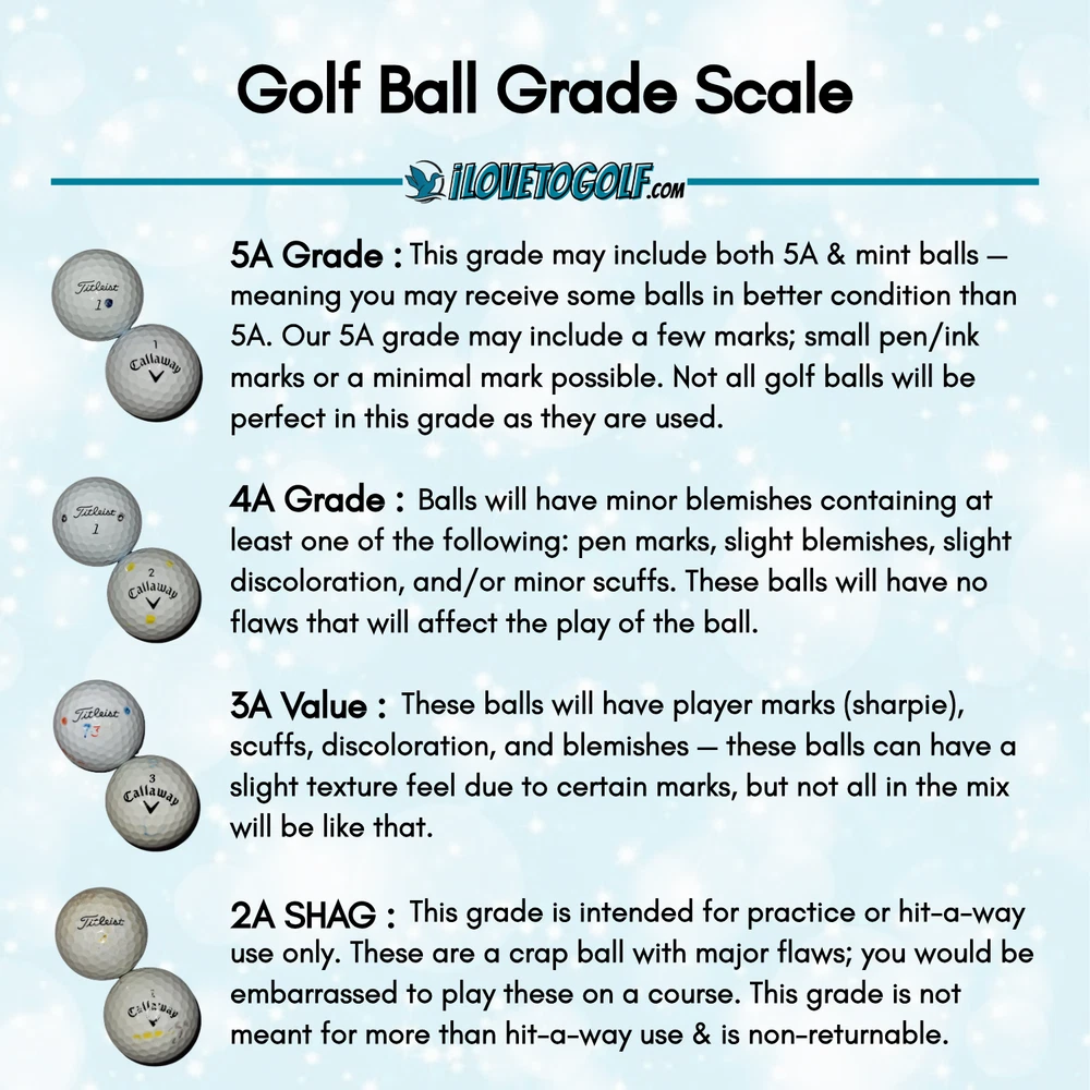 Your announcement bar will show in here. iLove2Golf "Because We All Love To Golf!" Titleist Pro V1 TaylorMade Bridgestone Titleist Callaway Sale Items 48 Vice Mix Used Golf Balls Drive/Tour/Pro/etc - 4A Grade AAAA - Free Shipping USD 47.95 Return Policy See our return policy Buyer Satisfaction Checkout safely with peace of mind FOLLOW US HAVE A QUESTION? CATEGORIES Accessories Adams AVX Bridgestone Callaway Cleveland Clubs Cobra Cutter & Buck Drivers Fairway Woods Gloves Golf Balls Golf Towel Grips Hats Head Covers HONMA Hybrids Irons Kirkland Ladies Ladies Apparel Logo Balls Matte Balls Maxfli / Noodle Men's Apparel Mg Mizuno Nike Odyssey Other Pants / Slacks Ping Pinnacle Polara Practice / Shag / Range Precept Pro V1 Putters PXG Ray Cook Shirts Shoes Shorts Skirts / Skorts Snell Socks Specialty / Truvis / Pix Srixon TaylorMade Tees Titleist Top Flite Tour Edge Under Armor Vice Vintage Balls Volvik Wedges / Chippers Wilson HELPFUL LINKS Add to Favorite Seller Ask Seller a Question View Feedback Visit Our Store About Us Contact Us Stay Updated! Add GolfBallsOnline to your favourites to receive Discount on items and special promotions! SUBSCRIBE PRODUCT DESCRIPTION These balls are just washed and sorted This batch will include 48 golf balls May include any generation and / or model ( unless listing is fo r s pecific year ) Ball Grade Scale: AAAAA (5A): Our best quality recycled golf balls. They play and feel like new balls. Our 5A grade may include minimal mark ing ; small pen/ink mark s. Not all golf balls in this grade will be perfect as they are used. Any ball after one hit is considered used . Will NOT include Practice or X- Out. Th is grade wi ll co nt ain s ome corporate/team logos. AAAA (4A): Our second-best quality recycled golf balls . T hey will feel as if they have been hit a few holes. Balls will have minor blemishes containing 1 or 2 of the following : pen marks, slight blemishes, slight discoloration, and/or minor scuffs that do not affect performance. These balls will have no flaws that will affect the play of the ball. Will NOT include Practice or X-Out. This grade will contain corporate/team logos. AAA (3A): This grade is our bargain C-Grade golf balls that did not make it into our 4A category. These balls will have player marks (sharpie), scuffs, discoloration, and blemishes - these balls can have a slight texture feel due to certain marks, but not all will be like that. These balls do not look new but can still be used for play . Practice, X-Out, corporate/team logos are in this grade . AA (2A) Shag : Our lowest grade golf balls. These are intended for use as practice balls or hit-a-ways. These are crap balls with major flaws; you would be embarrassed to play these on a course. These are crap balls intended for PRACTICE & HIT-A-WAY use only. This grade is non-returnable. Disclaimer: For listings that are model mixes, color mixes, and/or grade mixes - you are not guaranteed specific quantities of models, colors, grades, etc. E ach mix varies. Photos in these listings are stock photos only - meaning that you are not guaranteed every model/color shown. Titles of these listings are to let you, as a buyer, know what you can possibly receive in each batch. This does not mean you are receiving all one color/model/etc - we do try our best to provide the best variety available with our stock at the time. This does not apply to listings that specify the model and/or color . These balls are just washed and sorted This batch will include 48 golf balls May include any generation and/or model (unless listing is for specific year) Ball Grade Scale: AAAAA (5A): Our best quality recycled golf balls. They play and feel like new balls. Our 5A grade may include minimal marking; small pen/ink marks. Not all golf balls in this grade will be perfect as they are used. Any ball after one hit is considered used. Will NOT include Practice or X-Out. This grade will contain some corporate/team logos. AAAA (4A): Our second-best quality recycled golf balls. They will feel as if they have been hit a few holes. Balls will have minor blemishes containing 1 or 2 of the following: pen marks, slight blemishes, slight discoloration, and/or minor scuffs that do not affect performance. These balls will have no flaws that will affect the play of the ball. Will NOT include Practice or X-Out. This grade will contain corporate/team logos. AAA (3A): This grade is our bargain C-Grade golf balls that did not make it into our 4A category. These balls will have player marks (sharpie), scuffs, discoloration, and blemishes - these balls can have a slight texture feel due to certain marks, but not all will be like that. These balls do not look new but can still be used for play. Practice, X-Out, corporate/team logos are in this grade. AA (2A) Shag: Our lowest grade golf balls. These are intended for use as practice balls or hit-a-ways. These are crap balls with major flaws; you would be embarrassed to play these on a course. These are crap balls intended for PRACTICE & HIT-A-WAY use only. This grade is non-returnable. Disclaimer: For listings that are model mixes, color mixes, and/or grade mixes - you are not guaranteed specific quantities of models, colors, grades, etc. Each mix varies. Photos in these listings are stock photos only - meaning that you are not guaranteed every model/color shown. Titles of these listings are to let you, as a buyer, know what you can possibly receive in each batch. This does not mean you are receiving all one color/model/etc - we do try our best to provide the best variety available with our stock at the time.This does not apply to listings that specify the model and/or color. Specifications Number of Items in Set 48 Non-Domestic Product No Custom Bundle No Quantity 48 Letter Grade AAAA Modified Item No Suitable For Match Brand Vice Personalize No Ball Type Recycled Balls Country/Region of Manufacture United States Sport/Activity Golf Custom Block Heading Custom Block Content. ABOUT US Our