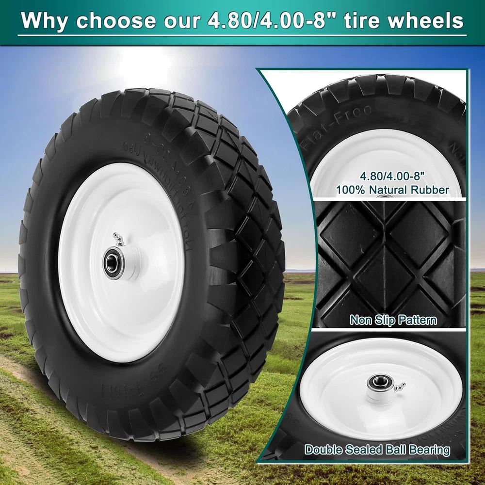 Store New Arrivals Add to Favorite View Feedback Contact 4.80/4.00-8" Tire Wheels 16" Heavy Duty Solid Flat-Free Tire with 5/8" or 3/4" Axle Borehole,3-7" Adjustable Centered Hub for Wheelbarrow Garden Trailer and Trolley by Description Item model number 4.80/4.00-8" Wheel Size 16 Inches Material Rubber Rim Size 16 Inches Color white Item Diameter 16 Inches Rim Width 3.6 Inches Vehicle Service Type Trailer Item Weight 15.32 pounds Manufacturer Part Number E2022000084 Model 4.80/4.00-8 Flat Free Tire Size 4.80/4.00-8" SPECIFIC SIZE: [2-pack] 4.80/4.00-8 tire and wheel 16" Heavy Duty Solid Flat-Free Wheels with Diameter: 16" Tire Width 3"; Axle Bore Diameter: 5/8"; hub offset: 3". Additional extension spacers and 3/4" bearings make our 4.80/4.00-8 tire suitable for almost all flat free wheelbarrow tires with hub lengths between 3" and 7".Please check the size before you buy it To make sure the tires match HEAVY DUTY WHEELS: Each Wheel Maximum load :400 lb (181 kg). Saw tooth tread Heavy Duty Solid tires save you the trouble of pumping air and prevent punctures or air leaks. It is more suitable for dynamic load-bearing, but not static load-bearing. Warm reminder: avoid downloading heavy loads in a static state for a long time. Because of the material characteristics, it is easy to shrink when it is stationary for a long time CUSTOMER SATISFACTION : 12 months warranty! RISK-FREE SHOPPING. Ask us if you have any questions about 4.80/4.00-8 tire and wheel, and we will solve it for you right away. We will strictly carry out the quality-control project,which will enable our customers to buy with confidence and use with satisfaction SUPEREIOR QUALITY :Tires are made of 100% natural rubber and rim are made from highly durable iron. Rubber is 4 times thicker than other brands and these wheels offer maximum shock absorption for a smooth and comfortable ride. Provide a longer service life. Serrated tread and double sealed ball bearing design ensure good tire traction and and equipped with off-highway service (NHS) tires and thick inner tubes even in the most challenging terrain(Not for highway use) WIDE USAGE : The 4.80 4.00-8 wheelbarrow wheels are usable with wheelbarrows, contractor grade unicycles, garden trailers, spreaders, roofing equipment, etc. When a 16 pneumatic tires blowout occurs, there is no need to buy a new Cart. Only need to replace the4.80/4.00-8" tire and Wheel , you can use it normally Product Description ABOUT US We offer the best prices around on high quality products. Our E-store includes media such as books, movies, music and games while offering electronics, toys, sporting apparel, clothing, tools, general home, garden items and more. SHIPPING We are always working hard to ensure your package arrives as soon as possible. Please understand that some factors like weather, high postal traffic, and the performance of shipping companies are outside of our control. We offer free shipping to the lower 48 states and ship within 2 business days of payment, usually sooner. We do not accept P.O. Boxes. Please provide a physical address. For shipping outside of the continental USA, we only use eBay's Global Shipping Program.The item is shipped to KY and then sent to the rest of the world. International customers are responsible for all duties and taxes. Continue to check out in order to calculate costs for shipping the item to your country. Messages regarding eBay's Global Shipping Program MUST be directed at eBay EXCLUSIVELY. RETURNS We offer a 30-Day Return Policy on items which you are not completely satisfied with. You have the option for a full-refund or an exchange of the item. No returns are available on items shipped outside of the USA. PAYMENT We accept PayPal. CONTACT US This page content is yet to come Please ad us to your favorite seller and visit again later Thank You CUSTOMER SATISFACTION We try our very best to make sure every customer is completely satisfied. If there's a problem, message us! We're happy to help. WE ACCEPT Copyright © 2021 AutoDS. | All Rights Reserved