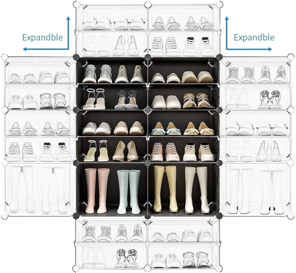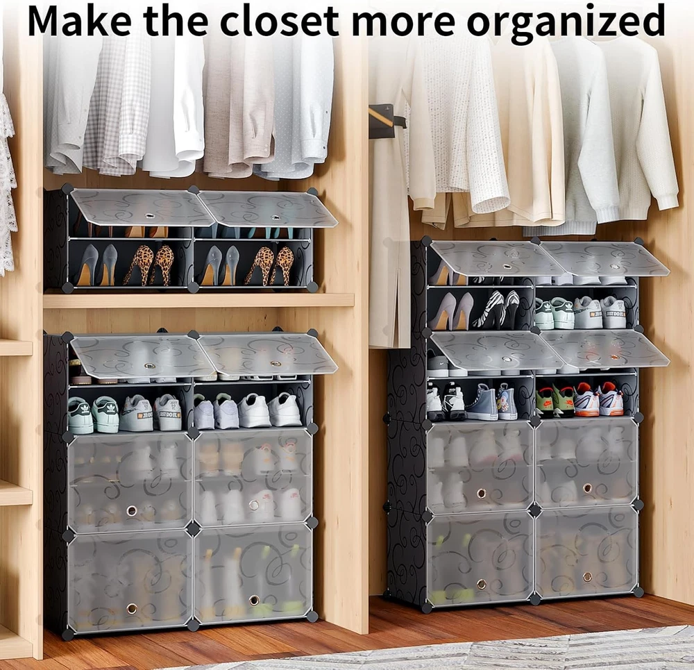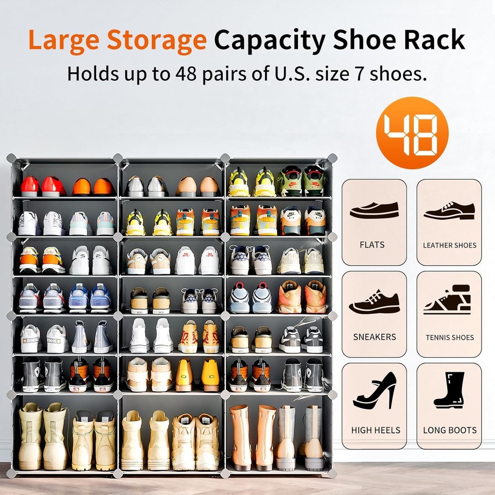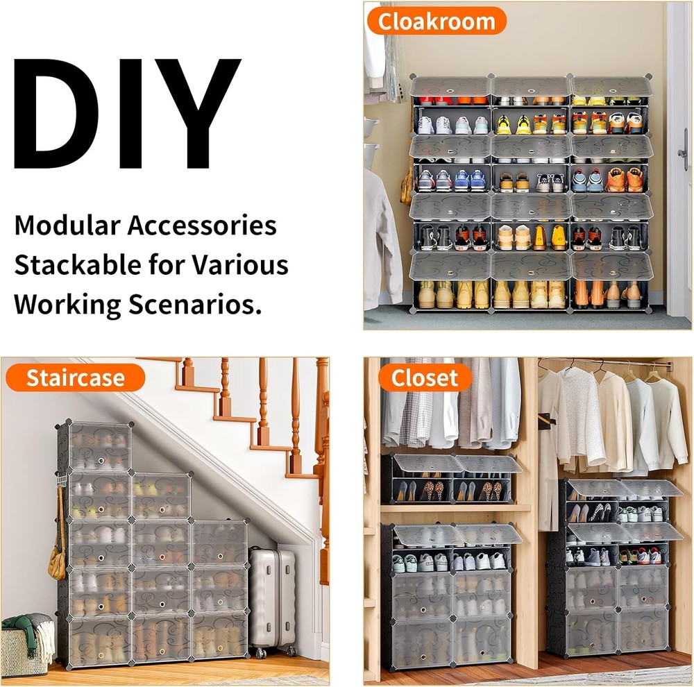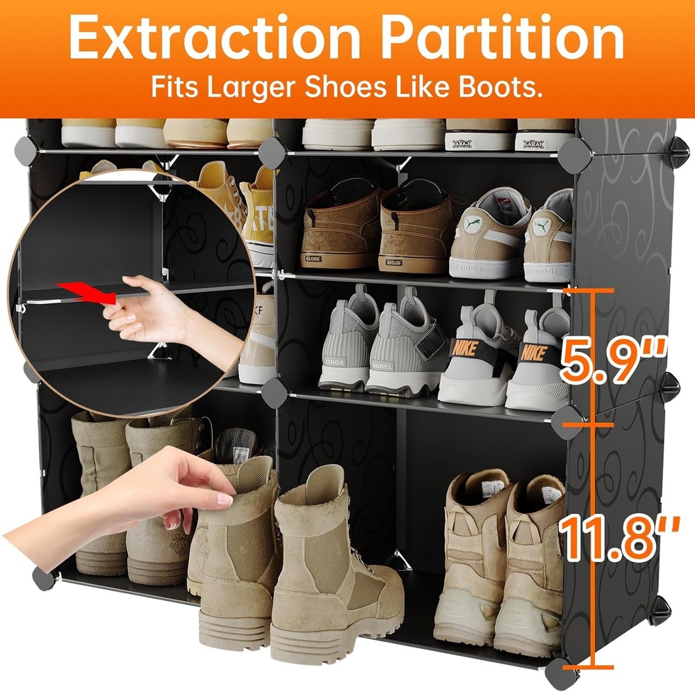 This shoe storage cabinet is a game-changer! It holds up to 48 pairs with spacious cubes, and the removable dividers make it perfect for tall boots. The sturdy resin panels are durable yet lightweight, and the door can be taken off for easy access or display. Super easy to assemble—no tools needed—and it fits neatly behind doors or in closets. Great for keeping shoes organized and dust-free. Love how versatile and well-built it is!