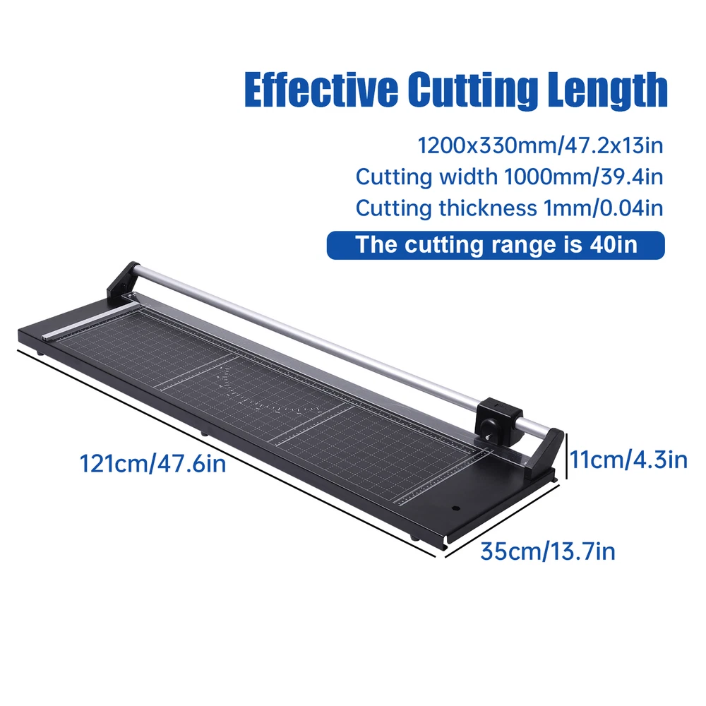 Store category Sign Up Now ! You may also like Product Description Bullet Points: Efficient Cutting: Rotary paper cutter to meet the diversified cutting requirements of the business can handle various materials from paper to metal foil Convenient to Operate: Without adjusting the thickness of the material, you can easily trim the thinnest materials, which helps improve work efficiency Cutting Perfection: Fitted with a layer of grid bottom plate and crosshairs, our rotary paper trimmer ensures precise paper size guidelines using a high-precision cutting guide for perfect cuts every time Metal Construction: Made of metal, the strong metal structure ensures the stability of the rotary paper trimmer, providing long-term durability for consistent, precise cuts Enhanced Efficiency: Equipped with high-quality components and an ergonomic design, this rotary paper trimmer provides wonderful cutting precision and durability, resulting in faster, more efficient project completion This paper slicer cutter is a must-have for easy and accurate cutting. It can handle various materials from paper to metal foil with stable performance and a long service life. Convenient and stable, it ensures the accuracy of each cut you make. Perfect for home, office, or school use. Specification: Product size: about 120x33cm/47.24x12.99 inches Cut width: about 1m/39.37 inches Cut thickness: 1mm Paper press: PE transparent long ruler Tips: The cutter is close to the outside of the cutter body. If the cutter is in the cutter groove, it cannot be cut. You can observe the position of the cutter before using the device. If it is in the cutter groove, it needs to be released before use. Packing List: 1* Rotary Paper Cutter 1* Manual Notes: 1. Due to different lighting and screen settings, the item color may be slightly different from the picture. 2. Due to different manual measurements, please allow a 1-2cm difference in size. Payment Delivery details Terms of sales About us Feedback & DSRs Payment Before you palce an order, please kindly make sure that you have a paypal account. We accept PAYPAL payment only. Payment should be completed within 2 days after auction closed, or unpaid dispute will be filed for an closing auction. An unpaid case will be filled after 4 days. Delivery details We ship to your eBay address. Each package will be shipped to US by UPS Regular Parcel with tracking number. Please check your shipping address carefully before checkout, it can't be changed if order completed. All items will be shipped within 1-2 business day upon receipt of payment.Orders placed on weekend will be shipped within 3 days. If you do not receive your item in 7-10 business days.please contact us immediately for further assistance. We will be responsible for any damages or losses incurred in the shipping process. About us We maintain high standards of excellence FIVE STAR and strive for 100% customer satisfaction! Positive Feedback is very important to us. We hope that you contact us immediately Before you give us neutral or negative feedback, so that we can satisfactorily address your concerns. We promise to offer the lowest price and high quality produce. Our working time: From Monday to Friday(9:30 am to 18:00pm), we don't working on holidays ,hope you can understand and know that , thank you. Please always talk to us via ebay Message. We appreciate your business and look forward to growing our e-Bay sales with satisfied customers. Feedback Contact us If you have any questions, please feel free to contact with us by ebay Message during our business hours ( 9:30a.m. to 5:30 p.m.), or email us through eBay, we will try our best to help you to resolve it. For any presale or after-sale questions,please do feel free to email us! Due to the time difference, each email will be replied within 1 working day,and weekend will be delayed a bit. Feedback