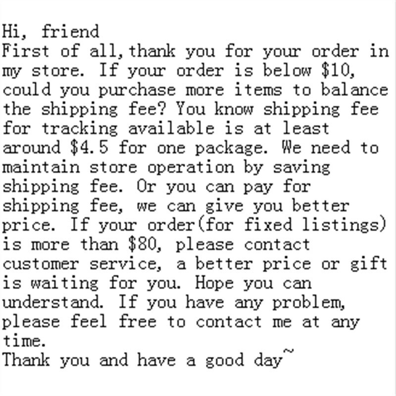 Note: it is hard to keep everyone is same,so these may happen: The size & weight of everyone always is different,it's normal for the difference. The color may also have some difference with the product,it is normal. The pictures often look larger than real product,pls refer the product size. If you mind these,pls don't place an order,thank you for your assistance! Shipping 1.All The Items Will Be Shipped Out To You in Time(1-3 Work Days For Overseas Warehouse,1-7 Work Days For China Warehouse). 2.If You Have Not Received Your Item After Estimated Delivered Days, Please Do Not Hurry To Open Case To Us. 3.We Would Recheck The Shipping Status For You And Decide Refund Or Something in Your Request. Return 1.If You Are Not 100% Satisfied With Your Item We Will Gladly Accept It Back For A Full Refund Provided Your Initial Request To Return The Item is Within 30 Days From The Date Of Purchase. If Your Initial Request To Return The Item is After 30 Days From The Date Of Purchase Unfortunately We Would Be Unable To Accept The Return Request. 2.All Returns Must Be Received in Perfect Resalable Condition in Order For Refunds To Be Granted. If The Item YouReturn Does Not Arrive in Perfect Resalable Condition We Cannot Offer Any Refund. 3.All Returned Items Must Be Include a Copy Of The Original Sales Invoice.Once Your Item Has Been Returned To Us, Your Refund Will Be Processed Within 72 Hours. About Tax 1.Customs Duty is Obligation And Liability Of A Citizen in Your Country, So Buyer Should Be Responsible For AnyTax And Custom Duty Incurred. 2.Please Double Check Your Local Customs Policy Carefully Before Purchase. Or, We Will Not Be Responsible For Any Failure Delivery Related Destination Customs Issue. Contact us 1.If You Have Any Problem,Pls Feel Free To Contact With Us By Online Email First,We Will Try Our Best To Solve You Problem.We Will Provide With You The Professional Customer Service!Hope We Can Have A Good Cooperation.Best Wishes!