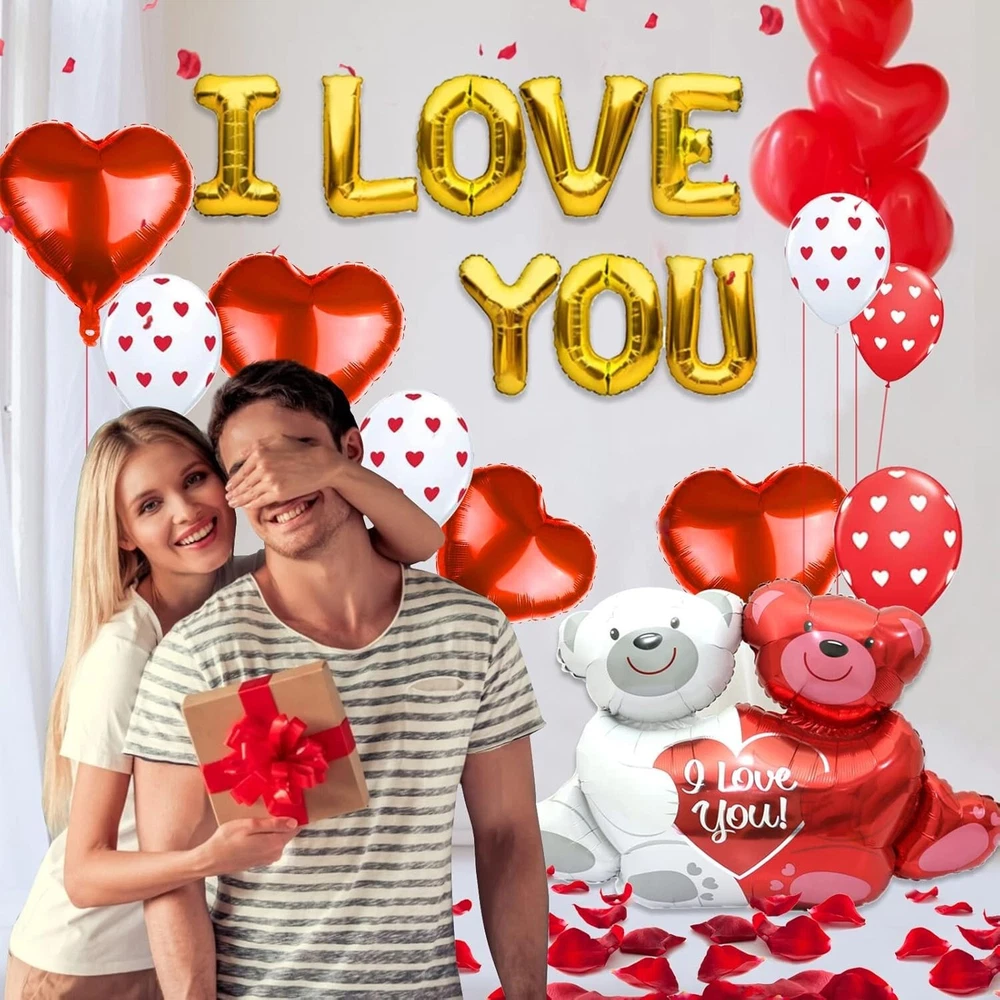The product is a set of 49 Valentine's Day balloons and a teddy bear, featuring a romantic theme perfect for decorating for the occasion. The balloons are made of aluminum, latex, and polyester in a red color, measuring 8.9 x 7.68 x 2.2 inches. The set also includes a teddy bear character, adding an adorable touch to the decorations. This item is lightweight at 8.4 ounces, making it easy to set up and display in your home for a romantic Valentine's Day celebration. Romantic Decorations for Special Night - Do you want to organize a surprise party on Valentines Day to show your love to her/him? Light up the event with this I love you balloons and heart balloons set! Create a romantic moment for your lover enjoy a sweet anniversary! Valentines Day Balloons Set - Include I LOVE YOU Letter Foil Balloons, 1PCS 23’’ Big Teddy Bear Balloon, 6PCS 18’’ Red Foil Heart Balloons, 2PCS 36’’ I Love U Foil Balloons, 20PCS 10’’ Red Heart Balloons, 6PCS 12’’ Red Balloons, 6PCS 12’’ White Balloons, 4 Rolls Red Ribbons and 1000PCS Silk Rose Petals. Meet your romantic decor needs and start a deluxe Valentine's Day party. 1000 PCS Silk Rose Petals - Made of high quality polyester silk material. Petal measure is 2'', Durable and not fade. Realistic Rose Petals is important supplement to your Valentine's Day, anniversary, wedding, and romantic special night, enhancing the romantic atmosphere even more. High Quality Balloons - These Valentines Day balloons are made of reliable aluminum film or latex material that will not leak easily. All balloons support helium gas filling. Red ribbon is used to tie the balloons, Heart-shaped balloons float on the ceiling to create an unforgettable romantic special night for you. I Love You Balloons and Heart Balloon Set perfect for Valentines Day, romantic special night, wedding, anniversary or proposal decoration. With heart balloon and petals to realize your planned romantic party space to surprise her/him.
