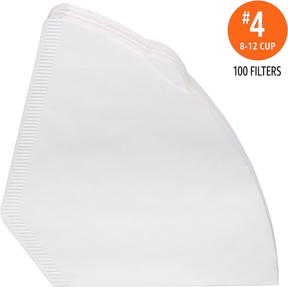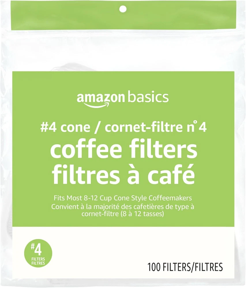 100 white #4 cone coffee filters; fit most 8-12 cup cone coffeemakers Provides superior coffee filtration and eliminates gritty sediment, while allowing the great coffee taste to come through Filters are Compostable* Made in the USA of imported and domestic components If you like Melitta #4 cone coffee filters, we invite you to try Amazon Basics Cone Coffee Filters Alexa voice shopping enabled: to place your next order, just say, “Alexa, reorder Amazon Basics Cone Coffee Filters" 100 White #4 cone coffee filters that fit most 8-12 cup cone coffeemakers. Filters contain 100% plant-based fibers and are compostable*. Made in USA of imported and domestic components. *Filter meets ASTM D6868-11 standard and can be composted where municipal or industrial composting facilities exist. Appropriate facilities may not exist in your area. Check with your local community as to availability.