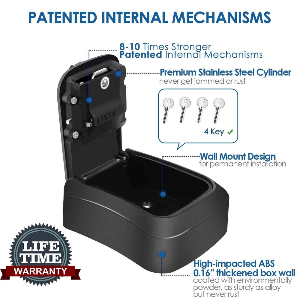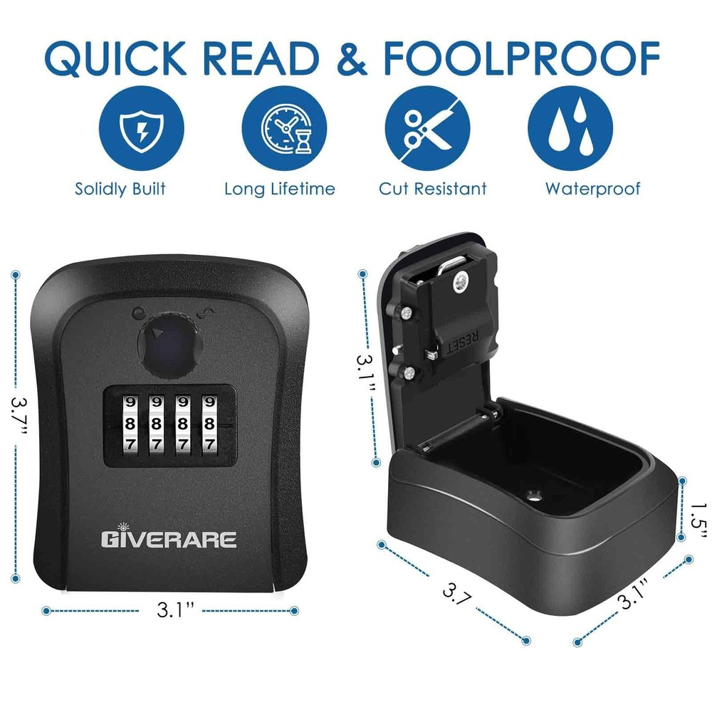 4-DIGIT COMBINATION: This 4-digit combination key lock box offers 10,000 combos, easy to read, remember and reset, adopts patented internal mechanisms, 8-10 times stronger than original ones, never get jammed or rusted. No need to hide your keys anymore HIGH SECURITY: Every key lock box is solidly built with High-impacted ABS (0.16” thickened box wall) and sturdy alloy locking cylinder, coated with premium powder, as sturdy as alloy but never rust, resistant to hammering, sawing and cutting LARGE CAPACITY: Compact sized & dust-proof, providing large internal space for up to 4 house keys (shorter than 3”), just set your mind at rest when traveling, this key hider will help assure all your house keys, car keys are safely locked EASY TO INSTALL: Our key hider can be mounted on any solid surface by our installation accessories, the whole process only takes a few minutes! Won't freeze up even after years of use, ideal for storage keys, fob, credit cards and USB thumb drives NO RISK PURCHASE: These resettable lock boxes are unbreakable, suitable for long-term everyday outdoor use. Perfect for emergency access for family, pet sitters and friends to your apartment, factory, company, store, college, dorm, vacation home and more
