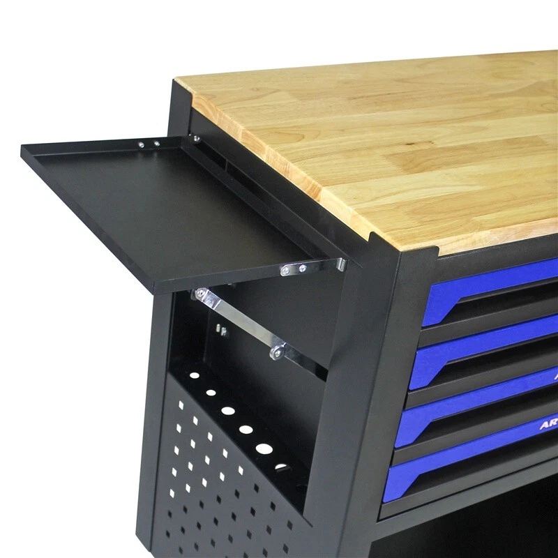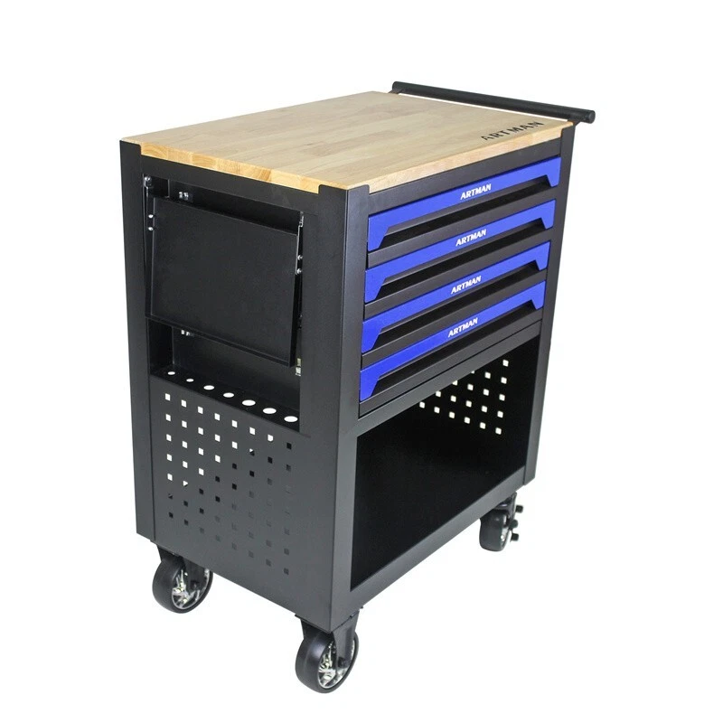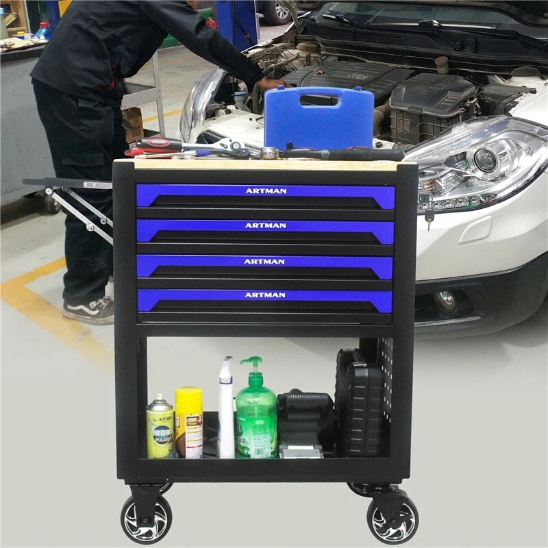About this item: Garage Organizer Cart with 4 Drawers Tool Chest High Capacity Large Storage Cabinet Adjustable Shelf, for Warehouse, Workshop 4 drawer utility vehicle with wheels and wooden top Specification: Color: Black+Blue Material: Metal Product Size: 35.4*26.9*17.9 inch Side of the Drawer: 20.9*15.7*2.2 inch Size of the Shelf: 7.9*12.2*0.6 inch Weight (lbs.): 93.00 Thickness of the Metrial: 0.6~0.8MM