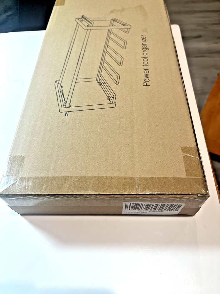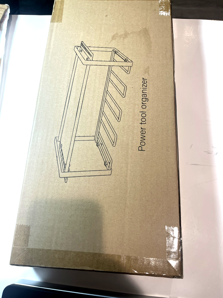 This power tool organizer is designed to store power tools in workshops or garages. It can hold up to 4 drills and can be used on pegboard. It also stores several small tools and has a shelf for other supplies. Assembly is required to set up the storage rack. Stock photo was used because I didn't want to open it and take it out of its original packaging.