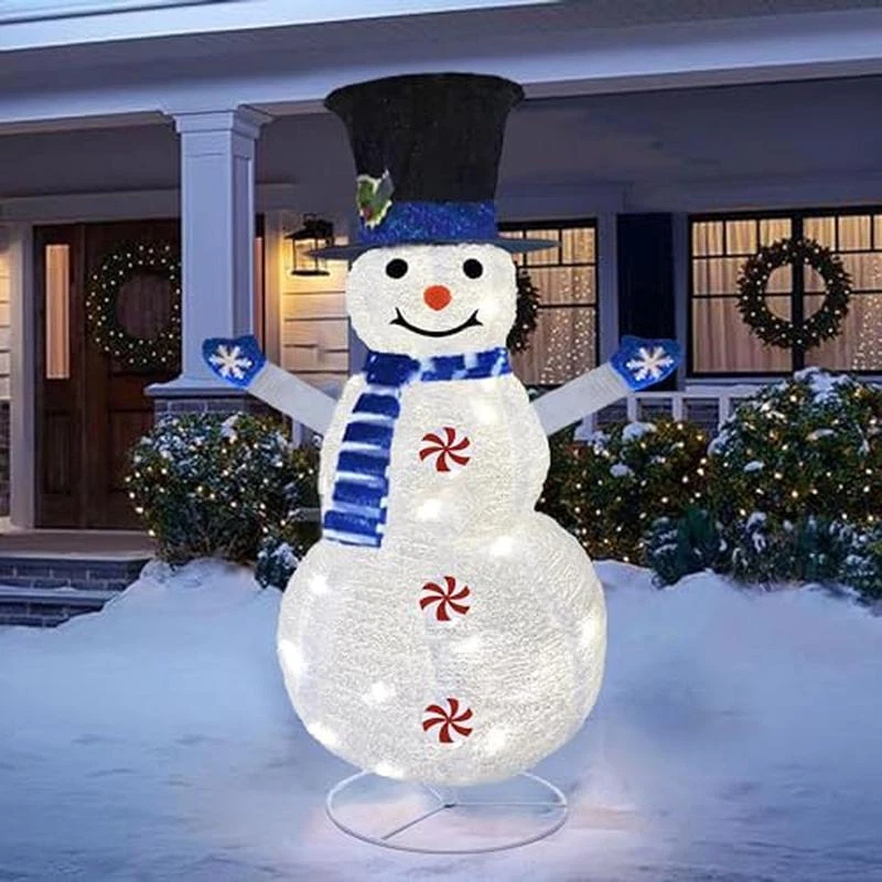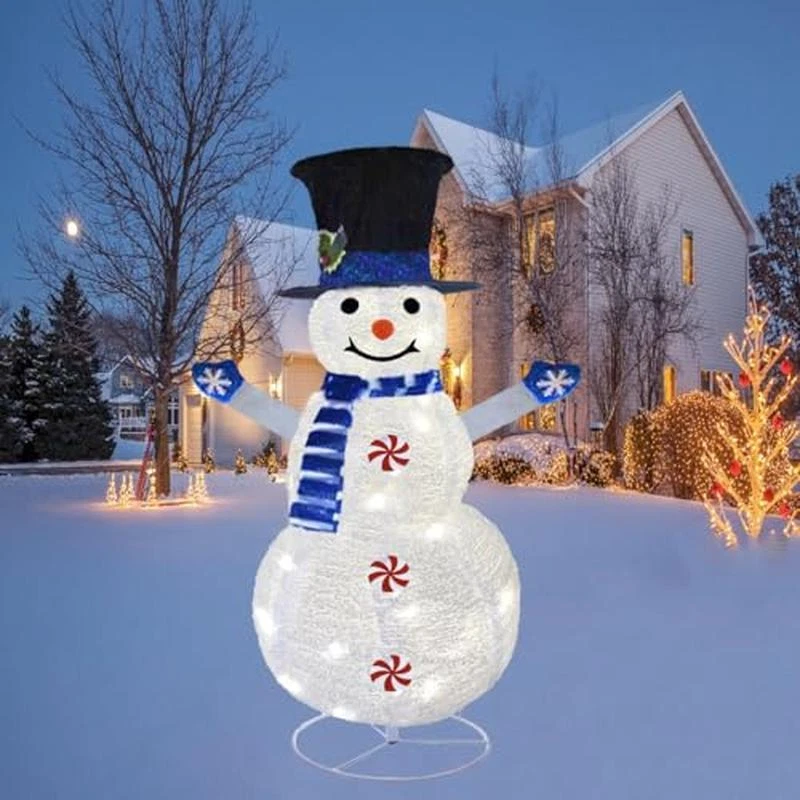 About this item Attractive Christmas Decor:Our lighted snowman is 4 ft tall, which is perfect decoration in Christmas season. With pre-lit lights,the outdoor snowman brings rich Christmas atmosphere. The Lighted hands say hello to everyone who visit your family. Lighted Collapsible Christmas Decoration - The 4FT snowman decorations with 120LT white light bulbs, wearing black top hat,Blue and white stripes scarf, carrot nose, bring warmth to families, creating a warm Christmas atmosphere Easy to Install - Collapsible structure makes easy assembly and storage. Christmas collapsible decoration no tools or specialized skills are required, you can use the ground stake to fix firmly if displaying outdoors in fine weather. (Please refer to the instructions for more details) Great Christmas Decoration - Suit for Christmas outdoor yard garden decorations, Christmas themed party, indoor & outdoor decorations, Christmas event decoration, Christmas Eve night décor, pop-up Christmas decor, winter decoration, party favor Christmas prop, classroom decorations and more. It is also an ideal and considerable Christmas gift for friends, family or relatives Safe and Durable - Pre-lit pop up Xmas decor Certified plug with built-in fuses meet US electricity standard, Low voltage provides the steady current during for steady and long-term operation. The stand is made of durable and high quality metal, and the surface is made of soft and thickened fabric, not easy to damage and can be used for years. ractical Application – Light up Christmas decoration are suitable for home, patio, lawn, garden, bistro, pub, cafe, restaurant, shopping center, supermarket, New Year, birthday, gathering, disco ball party, dinner party, evening party and wedding.