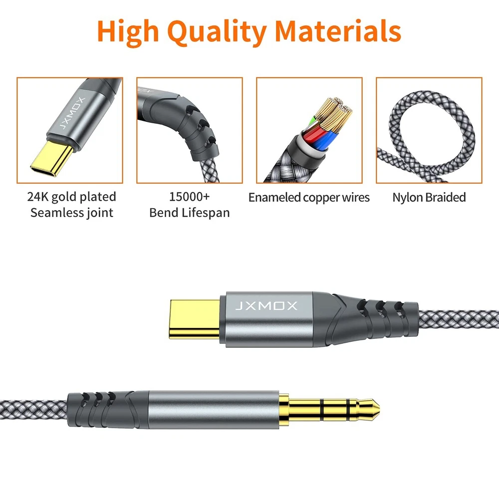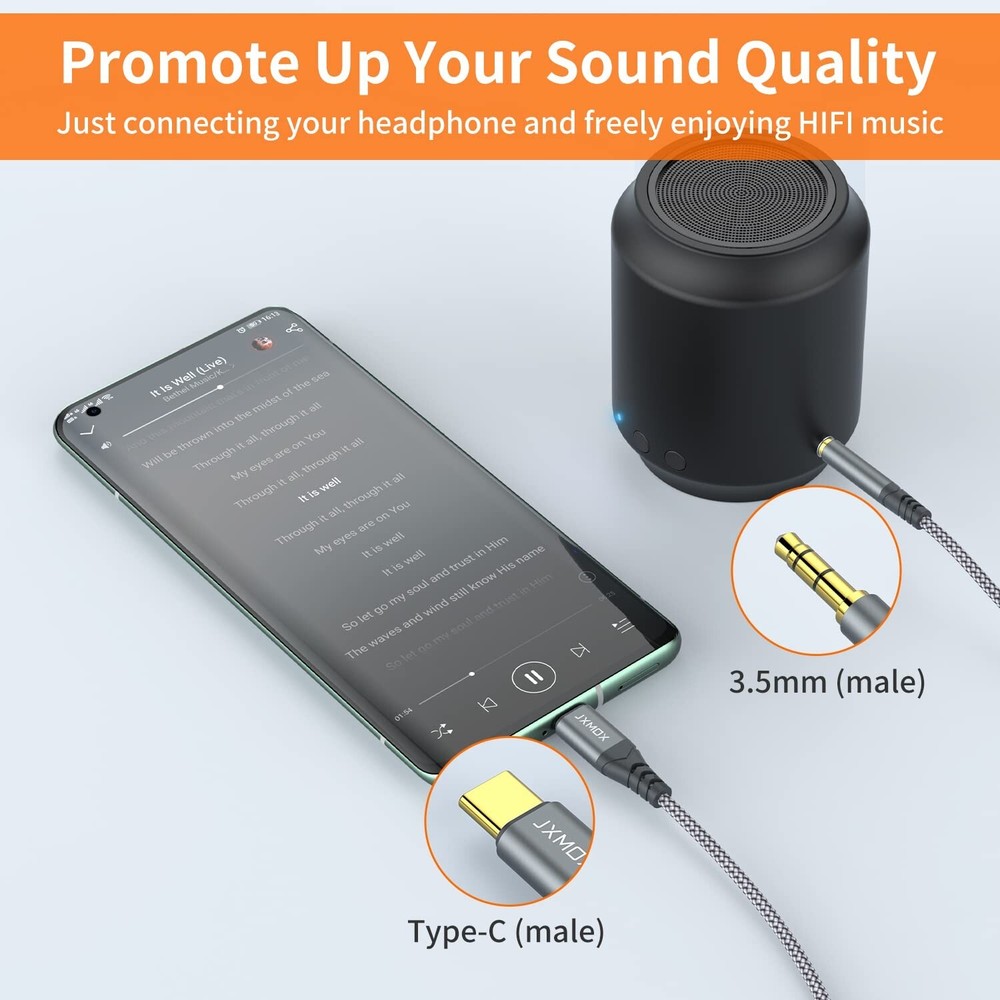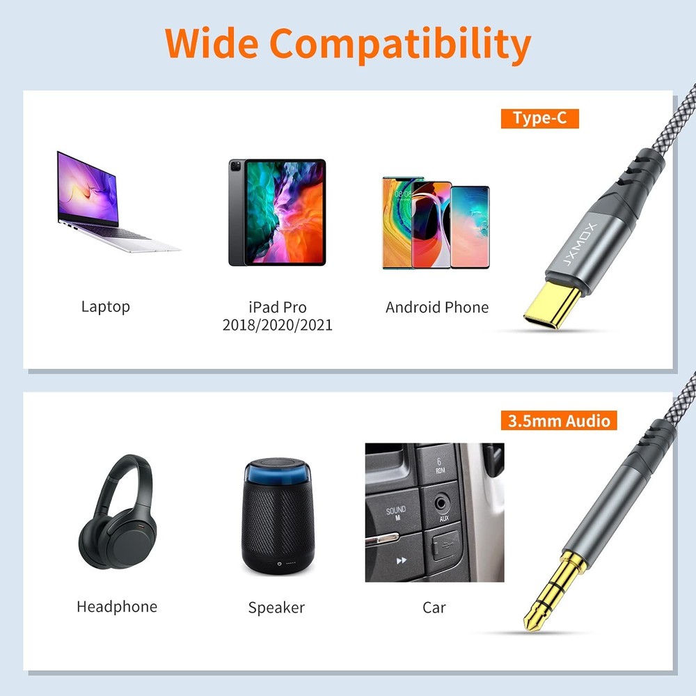 USB C to 3.5Mm Audio Aux Jack Cable (4Ft 1-Pack), Type C to 3.5Mm Headphone C... 【Multi-function Dongle】This USB C to 3.5mm aux cable cord can easily connect your Type C devices to car stereo, home stereo, speaker, headphones or any device with standard 3.5mm audio jack or Aux-in port and offers you the freedom of listening to music. 【Hi-Fi Sound Quality】This usb c to 3.5mm aux cable cord adopted an advance DAC Smart Chip, offer high-definition audio, powerful noise reduction, you can get higher fidelity sound from it. 【Relief Strain Design】This Cable Can withstand More Than 12000 Bending Tests, Nylon Braided style not only let it look upscale and attractive but also provids maximum's durability. 【Wide Compatibility】 Wider compatibility than others type c to 3.5mm adapters, compatible with most of the type c phones : iPhone 16 16 Pro 16 Plus 16 Pro Max, iPhone 15 15 Pro 15 Plus 15 Pro Max, iPad pro, iPad Air, iPad mini 6, Mac book, Samsung Galaxy S24 S24+ S24 Ultra, S23 S23+ S23 Ultra, S22 S22+ S22 Ultra, S21 S21+ S21 Ultra, S20 Ultra S20 Z Flip S20+ S10 S9 S8 Plus, Note 20 10 10+ 9 8, Google pixel 4 3 2 XL, One plus 6T 7 7Pro and more. 【Plug and Play】This Type C to 3.5mm aux cable cord No need to install software, drive, or complex connection mode, plug and play. You may encounter compatibility issues when using this product. Please contact our customer service for technical support.