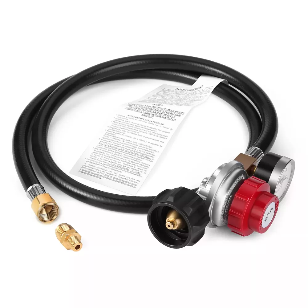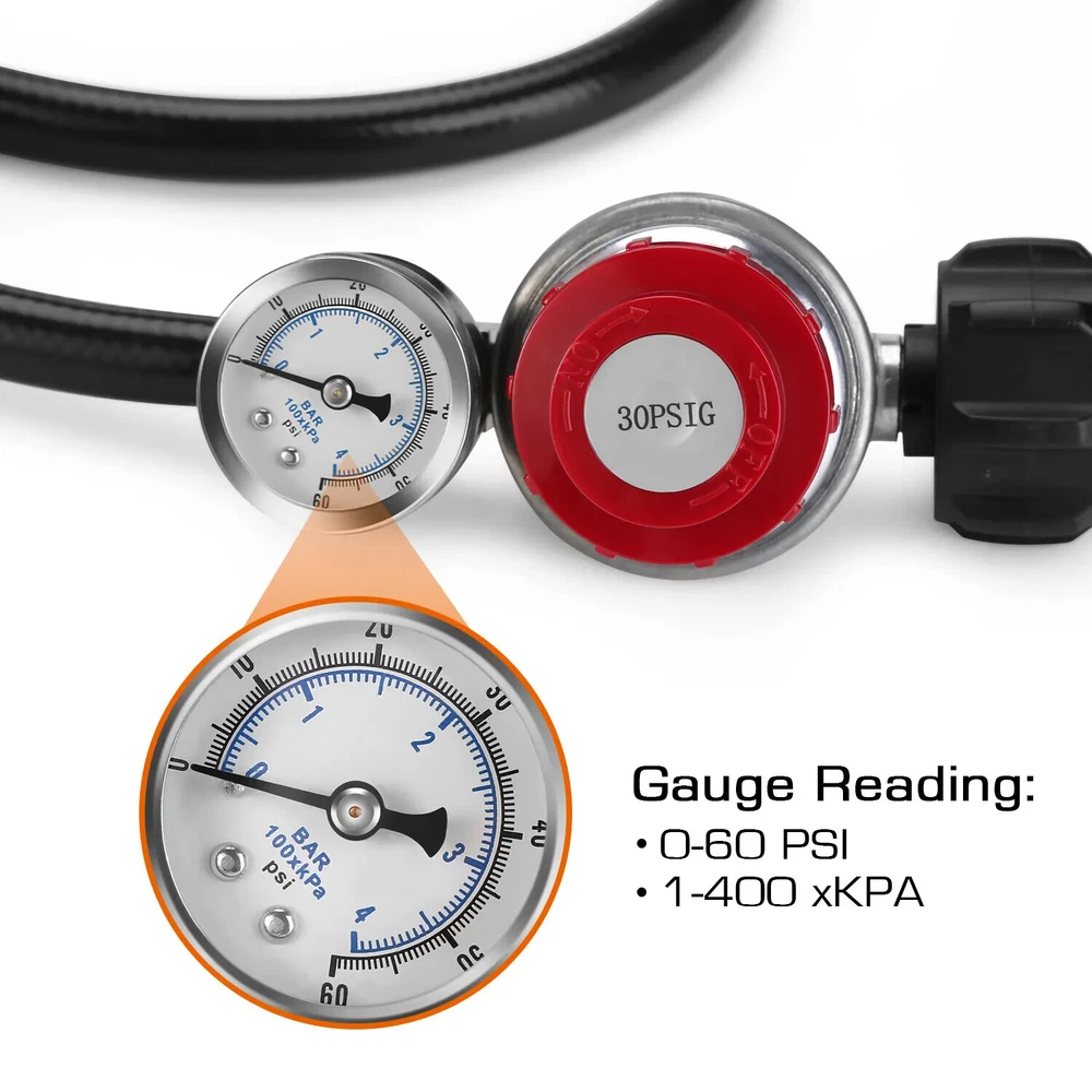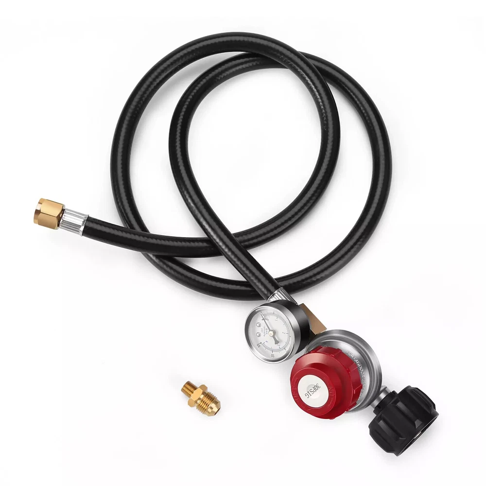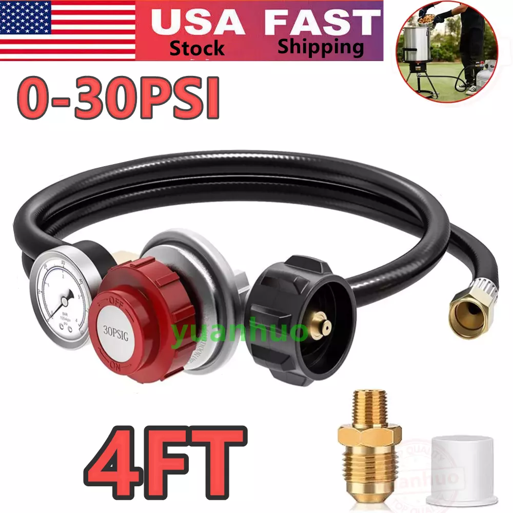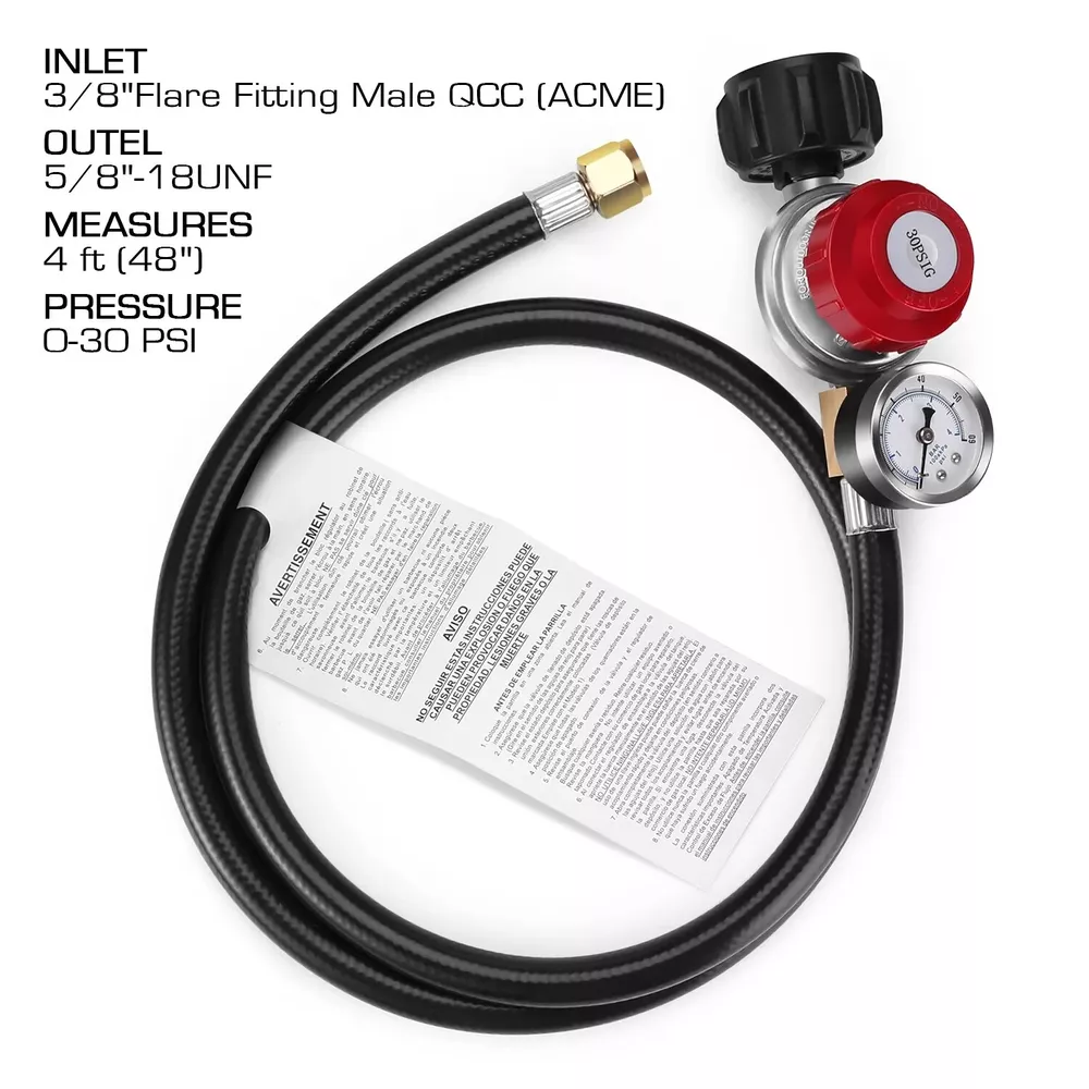 This Regulator Hose 0-30 PSI adjustable output is must have item for your propane burners, turkey fryers, heaters, smokers and all other propane appliances, Easy to use and good for secure gas flow, No gas leak, Simply connect and go, Extremely reliable. Output pressure 0~30 PSIG adjustable regulator .Hose measures 4 Feet long.Measuring from 0- 60 psi (as well as 1-4 100xKPA), the Pressure Gauge lets users control their heat with a precise level of accuracy. Easy and quick to install. Type 1(QCC 1) tank end connector & 5/8"-18 UNF outlet connection (3/8 inch female flare fitting has an outside diameter of 5/8 inch). 3/8" female flare fitting, fit for gas grills, gas stoves, turkey fryers, burners, smokers, cooker, fire pit, hot water heater, as long as your appliance connection is 3/8" male flare connector. 3/8" Female Flare Fitting has an outside diameter of 5/8", come with pipe fitting 3/8" flare M x 1/8" MNPT. Specifications: Material: PVC + Cuprum Length:approx. 123cm/ 4Feet Inlet Pressre: 25~250 PSIG Outlet Pressure: 0~30 PSIG adjutable Gauge reading: 0~60 PSI (1- 400 x kpa ) Adjustable Range: 0~30PSI Inlet connection: 3/8" Flare Fitting Male QCC(ACME) Outlet Connection: 5/8"-18 UNF Female flare swivel fitting (3/8" SAE) Max. flow capacity: 130,000 BTU/hr. Works with QCC1/ Type 1 propane tank. Note: For safety, please adjust it to 0 PSI (shut off the regulator.) Please do not apply this regulator to an appliance which supposed to equipped with a LOW PRESSURE regulator. What's included: 1 x Propane Regulator 1 x Adapter(3/8" flare M x 1/8" MNPT)
