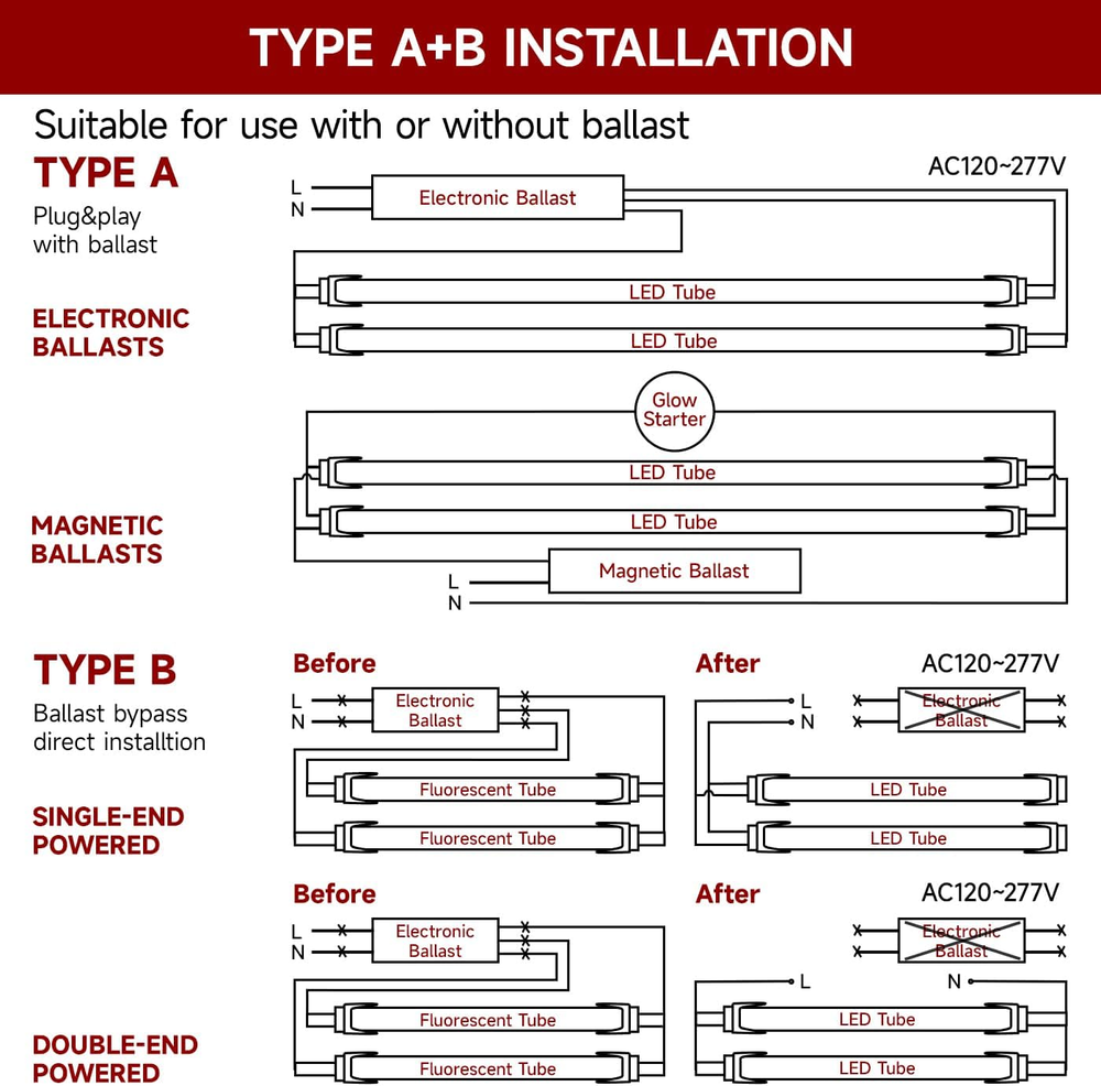 Store New Arrivals Add to Favorite View Feedback Contact T8 Led Bulbs 4 Foot Type A+B Tube Light, 24W, 3120LM, 6000K Led Tube Lights 4Ft, Plug and Play or Ballast Bypass, T8, T10, T12 Led for Fluorescent Tubes 4 Pack Description Item model number INWT80902465Bc Light Source Type LED Number of Items 4 Power Source Corded Electric Incandescent Equivalent Wattage 264 Watts Control Method Touch Theme led bulbs Batteries Included? No Controller Type Push Button Unit Count 4.0 Count Batteries Required? No Light Type LED Bulb Shape Size T8 Average Life 50000 Hours Material Aluminum, Polyacrylate Efficiency high Model Name Item Type Specific Uses For Product Indoor Item Package Quantity 1 White Brightness 3120 Lumens Indoor/Outdoor Usage Indoor Light Source Wattage 24 Watts Brightness 3120 Lumen Light Color Daylight White Item Weight 3.19 pounds Connectivity Technology power cable Special Features Energy Efficient, Eye-Friendly, Long Lasting Special Feature Energy Efficient, Eye-Friendly, Long Lasting Color Rendering Index 85 Part Number INWT80902465Bc Color Temperature 6000 Kelvin Color 6000k Super Bright Wattage 24 watts Accepted voltage frequency 100 to 120 Volts and 60 Hertz Bulb Base G13 Shape Tubular(T) Power Consumption 24 Watts Voltage 120 Finish types Aluminum Included Components No Product Dimensions 48"W x 1.3"H Install With or Without a Ballast: These led tube lights 4ft can be installed with a ballast (plug and play) or without a ballast (direct installation). Making it easier and reduce your time in installation Single or Double-Ended Connection: Kihung 4ft led bulbs are made with both single-ended or double-ended connection. You can install this tubes directly into your fixture’s original sockets or tombstones, no need to retrofit your fixture, making it easy and fast installation Compatible Information: These T8 4ft LED tubes are suitable for replacing your old T8, T10, and T12 fluorescent bulbs, and are compatible with existing T8, T10, and T12 fixtures High Brightness Fluorescent Tube :These led for fluorescent tubes feature 2 rows of LED chips, producing over 3120 lumens (>130lm/w) for bright and energy-efficient lighting. Long Lifespan: With a high-strength aluminum housing, our t8 led bulbs are shatter resistant and offer efficient heat dissipation for extended durability. Suitable for use in grocery stores, Kitchen lighting, office, hospitals lights, School buildings, classrooms, hallways,Supermarket, Garage, Shops, etc. Product Description Installation Method with Ballast Installation Method without Ballast Why does the bulbs not work when I install it with ballast? Please ensure to check for any damage to the ballast before installation. And remember to fully rotate the light until it is securely in place to ensure proper light emission. What is the difference between these led bulbs and fluorescent tubes? The led tubes are brighter and more energy conservation. ABOUT US We offer the best prices around on high quality products. Our E-store includes media such as books, movies, music and games while offering electronics, toys, sporting apparel, clothing, tools, general home, garden items and more. SHIPPING We are always working hard to ensure your package arrives as soon as possible. Please understand that some factors like weather, high postal traffic, and the performance of shipping companies are outside of our control. We offer free shipping to the lower 48 states and ship within 2 business days of payment, usually sooner. We do not accept P.O. Boxes. Please provide a physical address. For shipping outside of the continental USA, we only use eBay's Global Shipping Program.The item is shipped to KY and then sent to the rest of the world. International customers are responsible for all duties and taxes. Continue to check out in order to calculate costs for shipping the item to your country. Messages regarding eBay's Global Shipping Program MUST be directed at eBay EXCLUSIVELY. RETURNS We offer a 30-Day Return Policy on items which you are not completely satisfied with. You have the option for a full-refund or an exchange of the item. No returns are available on items shipped outside of the USA. PAYMENT We accept PayPal. CONTACT US This page content is yet to come Please ad us to your favorite seller and visit again later Thank You CUSTOMER SATISFACTION We try our very best to make sure every customer is completely satisfied. If there's a problem, message us! We're happy to help. WE ACCEPT Copyright © 2021 AutoDS. | All Rights Reserved