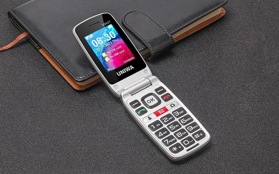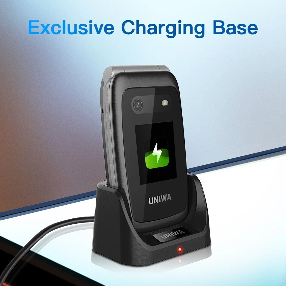 BASIC INFO Model No. UNIWA V202T Operating system RTOS (not smart) Style 4G flip senior phone Dimension 104*55*19.8mm Weight 113g (include battery) Material Plastic Color Black, blue, red Languages Multi-language HARDWARE Display Double screens: 2.4 inch QVGA inner screen, 320*240px; 1.77 inch, 160*128px outer screen Processor Unisoc T107 Cat.1 (T117 Cat.4 optional for OEM) RAM 48MB RAM ROM 128MB ROM, support TF card up to 32GB maximally Camera Single Camera: 0.3MP front camera Battery Removable 4.35V/1450mAh Li-ion battery Speaker 2030 BOX speaker (HAC support) Vibrator Support NETWORK & CONNECTIVITY Bands 2G: GSM 850/900/1800/1900MHz 3G: WCDMA 850/900/1700/1900/2100MHz 4G: FDD-LTE B1/B2/B3/B4/B5/B7/B8/B12/B17 B20/B28a/B28b/B66; TDD-LTE: B38/B40/B41 BT V5.0 WiFi & Hotspot Optional for OEM order GPS Positioning Optional for OEM order I/ O INTERFACES SIM slots *2 (Nano+Nano) TF card slot *1 3.5mm earphone port *1 USB Type-C port *1 OTHER FEATURES SOS Emergency Button Support preset 5 SOS emergency contacts and 1 emergency SMS Phonebook Number 2000 Torch light Support Wireless radio Support ACCESSORIES Battery *1 Charger *1 User manual *1 Charging Dock *1