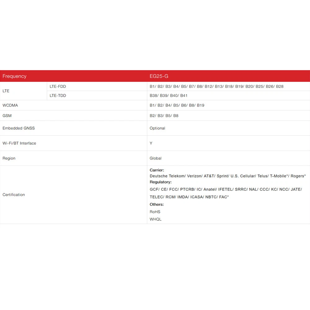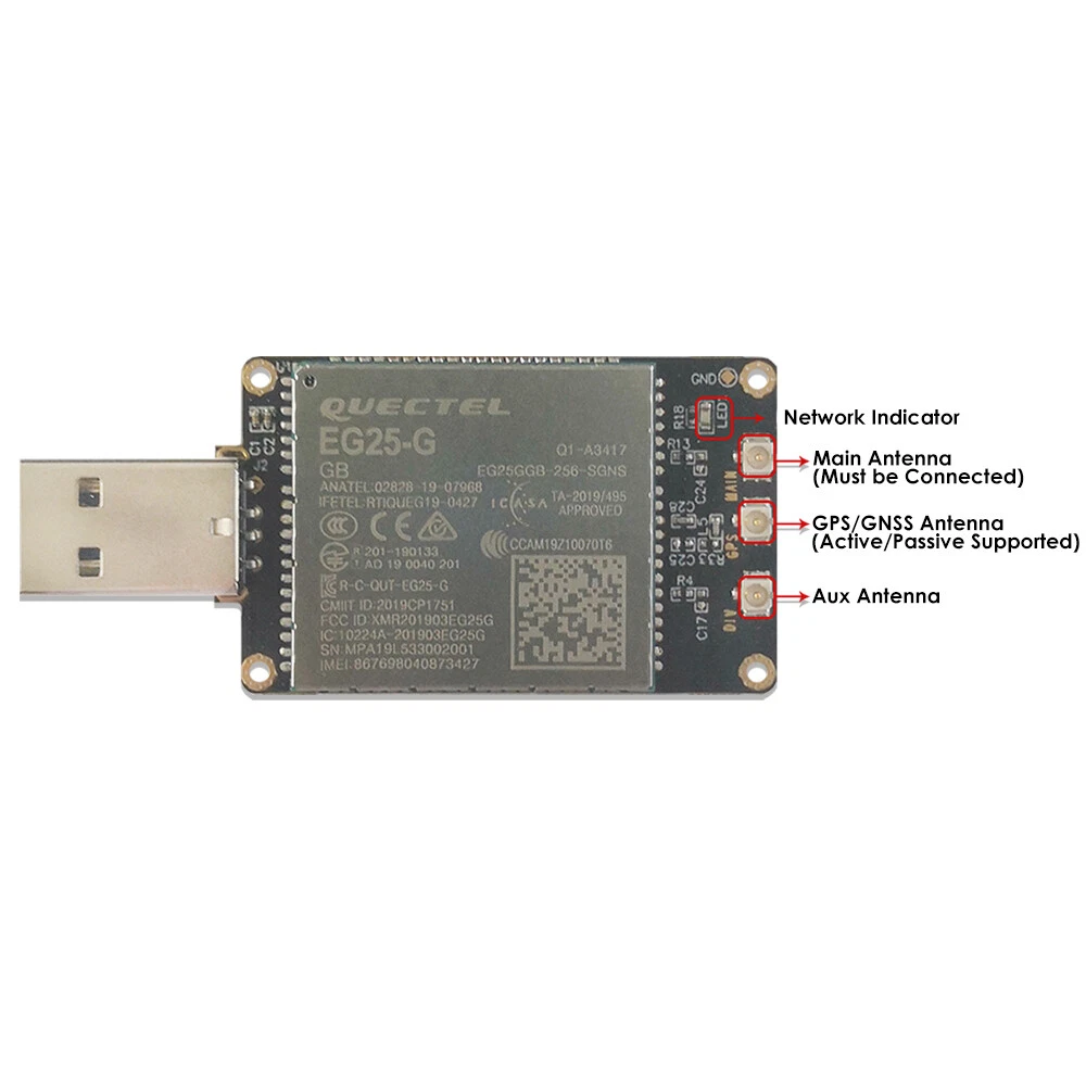 Store Categories Store Categories ENCODER Basic Encoder WiFi Encoder PoE Encoder EXTENDER 1080P Extender 4K Extender IP CAMERA 2MP IPC 3MP IPC 5MP IPC 8MP IPC DONGLE M.2 to USB Adapter PCIe to USB Adapter 4G LTE USB Dongle 4G IoT USB Dongle 5G LTE USB Dongle 5G IoT USB Dongle MODULE 5G IoT Modules 4G IoT Modules ROUTER 5G IoT Routers 4G IoT Routers Other 4G IoT USB Dongle w/LTE Cat 4 Module EG25-G LCC SIM Card Slot Global Version Product Description Overview This 4G LTE dongle is equipped with 4G USB Dongle W/Quectel EG25-G Series IoT/M2M-optimized LTE Cat 4 LCC Module, which enables it be able to delivers maximum data rates up to 150Mbps downlink and 50Mbps uplink. It also can be used for Windows, Linux, Android after installing the corresponding drivers. This dongle adopts the industrial level electric circuit design and DC-DC power chip. The maximum current for this dongle is 3A, which can ensure it can working all fine even under severe environment. It has Micro SIM card slot(Corner facing outside when plugging in the SIM card). TTL(3.3V for RX, TX) Antenna Connector Diagram: 4G Main Antenna(FPC Antenna x1 Attached), Aux Antenna, GPS/GNSS Antenna(Active/Passive Antenna Supported). LED Indicator depends on 4G Module(Power On-Slowly Flash, Search Signal-Quickly Flash, 4G Connected-Quickly & Stable Flash). Specification Dimension: 49.9mm(L)x30mm(W). USB is compliant with international criteria for USB2.0 For bands available for this dongle, please refer to the specification of EC25. LED indicator will be always on when it it working. Drivers needed, please contact us for corresponding drivers after placing the order. Package Contents 1x 4G USB Dongle W/Quectel EG25-G Series IoT/M2M-optimized LTE Cat 4 LCC Module Only 1x FPC Antenna Attached Operation Band LTE Cat 4 EG25-G Mini PCIe Region/Operator Global Dimensions(mm) 30.0 x 51.0 x 4.9 Temperature Ranges Operating Temperature -35¡ãC to +75¡ãC Extended Temperature -40¡ãC to +85¡ãC Frequency Bands LTE-FDD B1/B2/B3/B4/B5/B7/B8/B12/B13/ B18/B19/B20/B25/B26/B28 LTE-TDD B38/B39/B40/B41 WCDMA B1/B2/B4/B5/B6/B8/B19 GSM/EDGE B2/B3/B5/B8 GNSS GPS/GLONASS/BeiDou (Compass)/ Galileo/QZSS (Optional) Certifications Carrier Europe : Deutsche Telekom America : Verizon/AT&T/U.S. Cellular Canada : Telus/Rogers* Regulatory Global : GCF Europe : CE UK : UKCA North America : PTCRB America : FCC Canada : IC Brazil : Anatel Mexico : IFETEL South Korea : KC Taiwan(China) : NCC Japan : JATE/TELEC Australia & New Zealand : RCM South Africa : ICASA Others RoHS/WHQL Data Transmission LTE-FDD Data Rates (Mbps) 150 (DL)/ 50 (UL) LTE-TDD Data Rates (Mbps) 130 (DL)/ 30 (UL) DC-HSPA+ Data Rates (Mbps) 42 (DL)/ 5.76 (UL) WCDMA Data Rates (kbps) 384 (DL)/ 384 (UL) EDGE Data Rates (kbps) 296 (DL)/ 236.8 (UL) GPRS Data Rates (kbps) 107 (DL)/ 85.6 (UL) Interfaces (U)SIM x 1 UART x 1 USB2.0 x 1 Audio Digital(PCM) x 1 LED_WWAN# x 1 W_DISABLE# x 1 UART x 1 PERST# x 1 Voice Speech Codec Modes HR/FR/EFR/AMR/AMR-WB Echo Arithmetic Echo Cancellation/Noise Suppression VoLTE Digital Audio and VoLTE (Voice over LTE) (Optional) Enhanced Features DTMF ¡ñ DFOTA ¡ñ QMI/RmNet ¡ñ Audio Playback*/Audio Recording* Optional QuecLocator? ¡ñ QuecFile? ¡ñ (U)SIM Card Detection ¡ñ Drivers USB Serial Driver Windows 7/8/8.1/10, Linux 2.6¨C5.4, Android 4.x¨C9.x GNSS Driver Android 4.x¨C9.x RIL Driver Android 4.x¨C10.x NDIS Windows 7/8/8.1/10 MBIM Windows 8/8.1/10, Linux 3.18¨C5.4 GobiNet Driver Linux 2.6¨C5.4 QMI_WWAN Driver Linux 3.4¨C5.4 Electrical Features Supply Voltage Range 3.0¨C3.6V, 3.3 V Typ. Power Consumption 1.9 mA @ Sleep, Typ. 23.4 mA @ Idle Payment Policy Shipping Policy Returns Policy Payment Policy PayPal accepted only, all forms like Mastercard, Visa, Discover, American Express and eCheck included. Please ensure you have a valid PayPal account before bidding. Shipping Policy All items will be shipped out within 1~3 business days. Estimated Time of Arrival: Via Standard International Shipping: 8 to 20 business days. We'll only ship the parcel to the confirmed address generated by eBay. Therefore, please ensure your shipping address is correct in eBay before checking out and processing payment, because we won't change your address by email. If you have not received your parcel(s) within 30 days from payment, please contact us timely. We will track it accordingly and get back to you ASAP. Buyers should be responsible for all taxes or VAT. Any problem caused by Custom Clearance in your local country, we won't be responsible for that. Returns Policy Warranty: 1 year only. 30 days return/refund accepted (but misused or damaged items excluded). However, the shipping cost might be borne by buyers if you don't like the product and expect to return/refund. If the item were faulty, damaged or incorrect when arrival, you could return it for replacement or refund, please contact us on eBay within 14 days of receipt. For DOA (dead on arrival), please contact us immediately and send us an email with related photos, we will offer you the best solution. Copyright © 2021 Dianxiaomi