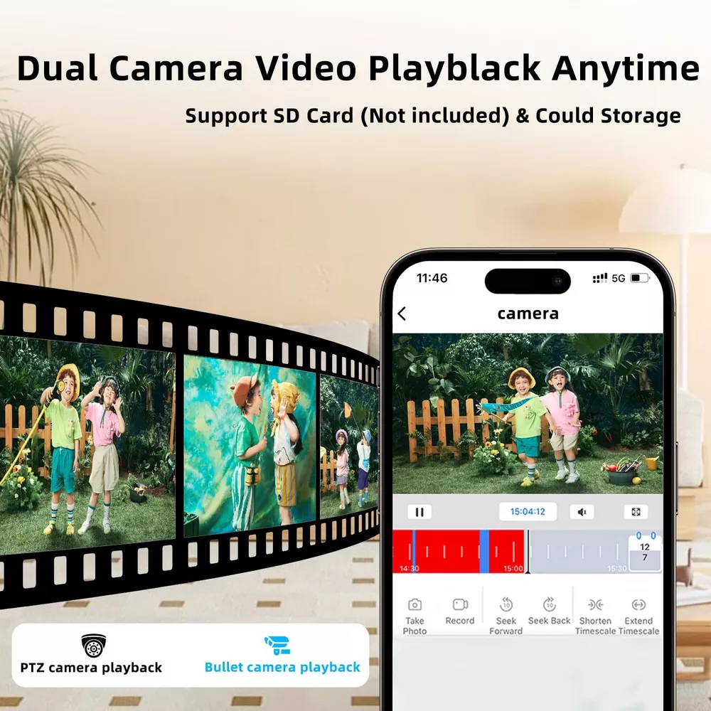 【4K HD Image & Color Night Vision】Outdoor solar security camera gives you 4K (3840 x 2160) Full HD, 8MP images and videos, sharper than other 2K or 1080P security cameras,You can Choose from 3 night vision modes. This outdoor camera was built-in CMOS sensor and IR lamp automatically detect ambient light and switch to color night vision mode for sharper detail and color images, even up to 65 feet of darkness. 【Dual Lens & 360°Coverage】This wireless outdoor wifi surveillance camera is equipped with two lenses that support 360° horizontal and vertical 90° PTZ rotation, providing you with 360° full protection with few blind spots. You can also manually rotate the security camera to see in different directions and remotely monitor any corner via the app to protect your belongings and family! 【2.4Ghz WiFi & Solar/Battery Powered】solar security cameras wireless outdoor supports 2.4Ghz Wi-Fi connection (5GHz not supported). With the solar panel, just connect the camera to the solar panel for continuous power supply. Built-in high-capacity battery allows continuous power supply through the battery even in bad weather or low sunlight, providing uninterrupted protection for your home for 365 days. 【2 PIR Motion Detection & Auto Tracking】Built-in sensitive PIR motion sensor effectively distinguishes human from other things and reduces false alarms. Once any abnormality occurs in the monitored area, you can receive a real-time push on your mobile phone. The solar camera outdoor wireless automatically tracks the movement of intruders and activates the alarm sound and spotlight to deter unwanted visitors.Support custom detection areas, only focus on key areas. 【2 Way Talk & IP66 Waterproof】With the latest IP66 waterproof rating, the outdoor camera can be used in extreme weather with a temperature range of (-4°F~122°F) without worrying about extreme cold and heat. In addition, solar camera also supports multi-user connection and multi-person sharing, just share the sharing QR code to your family and friends, then you can realize multi-person sharing to protect your home together.