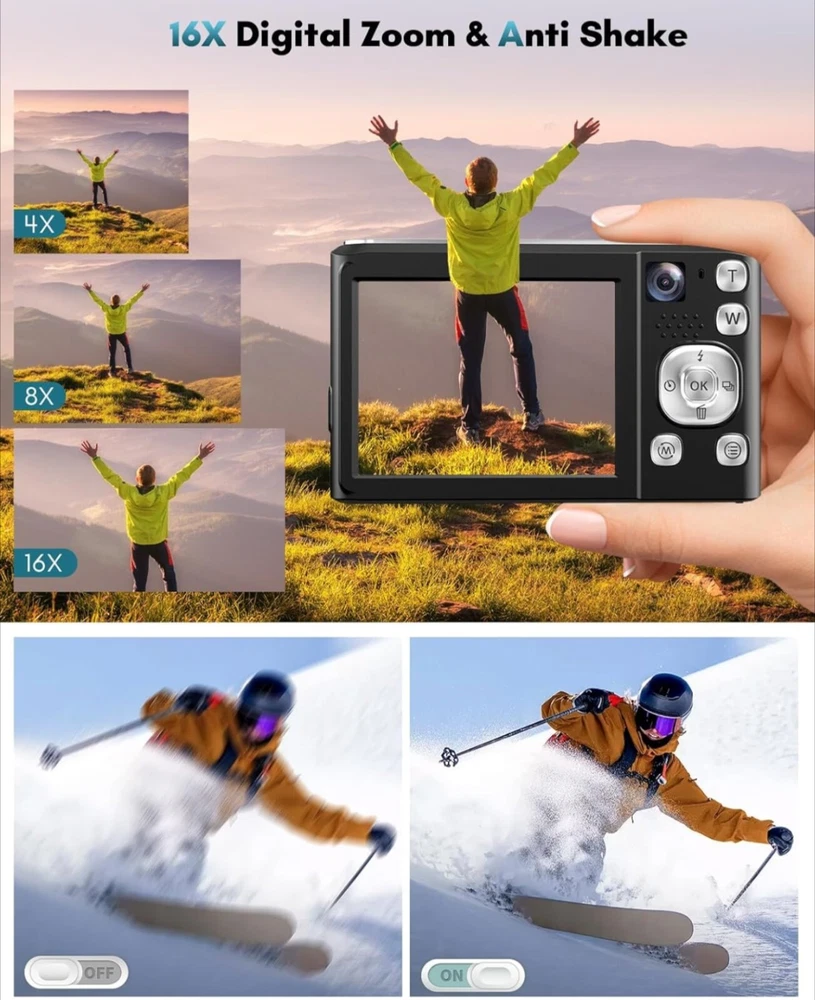 4K Digital Camera, 48MP Autofocus Cameras for Photography,Vlogging Compact Camera with Front and Rear Camera, 16X Zoom Protable Point and Shoot Cameras with 32GB SD Card,Anti-Shake,2 Batteries