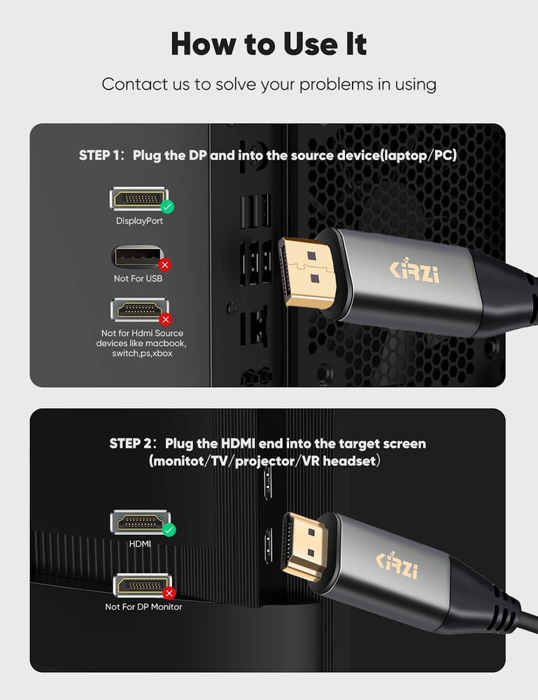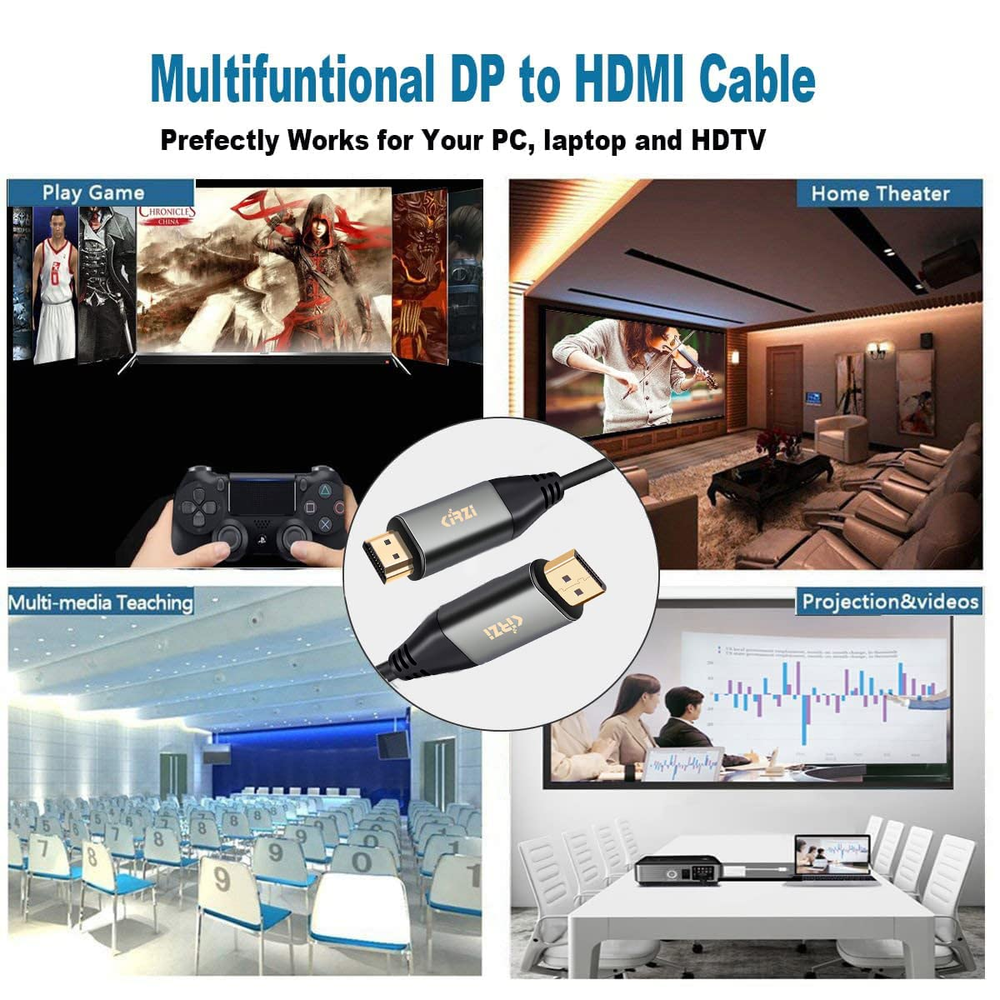 (Note: Unidirectional ) DisplayPort to HDMI cable directly connects a Display Port (DP, DP++, DisplayPort++) equipped computer to an HDTV, monitor, or projector with HDMI input Extended Desktop model and Mirrored Displays model are make you better entertainment experiences from a small or old computer.Suitable for playing game, enjoy home theater, having a report Compatible with DisplayPort equipped computer, pc, notebook, ultrabook, HP, Lenovo, Dell, ASUS,AMD and other brands; Transmits high-definition audio and video from your computer to an HDTV for video streaming or gaming;Supports video resolutions up to 3840*2160 / 4K@60HZ and uncompressed digital 7.1, 5.1 or 2 audio channels. DP-HDMI Cable Latch-free design helps you plug&unplug it easily without damaging the port. Slim shell size frees you from the worry of getting in the way of nearby ports. Product Description High-Speed 4K DP to HDMI Cable High-Speed 4K DP to HDMI Cable · Enjoy the 4K video that your computer and a 4K display can offer · Supports 4K(3840 x 2160)@60hz PHD , 1080P@120hz Full HD · Experience the deep color depths and sharp images · DisplayPort audio support for a full range of digital multi-channel audio · Multiple lengths to choose from, perfectly suited for home or office How to Use this Uni-Directional DisplayPort to HDMI Cable? How to Use this Uni-Directional DisplayPort to HDMI Cable? · This is a Passive cable, not Active. If you want to connect it with a DP dock/hub/KVM, please check whether the device supports dp++. * Docking stations/hubs that do not support dp++ need to use an Active adapter/cable · Uni-directional. Only from a graphics card with DisplayPort to displays with HDMI, thus cannot support PCs that do not have DisplayPort (e.g. Apple products) wide range of application scenarios wide range of application scenarios · 4K DisplayPort cable to HDMI male to male cord provides a cost-effective and easy solution for connecting a computer, desktop, laptop, or other devices with Display Port to HDMI Port display such as monitor, projector or TV, which is your preferred choice for seamless gaming, video streaming or extending a workstation.