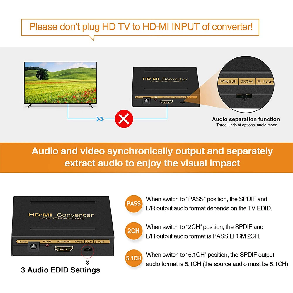 Home Arduino Module Sensor Chips About Us Features The 2-port HDMI Audio Extractor analyzes two HD Display/TVs connected to one HDMI source and also extracts the audio signal from the HDMI source. You can convert the original HDMI audio signal to digital optical or 2-channel analog audio output. This product supports Dolby Digital AC-3, DTS, LPCM and other digital audio formats output, which is a perfect audio extractor. HDMI Audio Splitter Extractor: [Upgraded 4K@60HZ version] avedio Link HDMI to HDMI Audio Extractor Converter can extract audio from digital HDMI signals to amplifiers, Soundbar, speakers, etc. via optical SPDIF or RCA L/R stereo audio output. It allows separate output to an audio receiver without powering up the HDTV/monitor. 4K 60Hz High Resolution: HDMI 2.0 Sound Insertion Extractor supports up to 4Kx2K@60Hz, HDR 10, HDCP 2.2, YUV 4:4:4, 3D, 36-bit deep color and 18 Gbps bandwidth. Gold-plated eco-friendly interface adds audio stability.HDMI audio splitter adapter delivers impressive high quality HD video for a stunning visual experience. Three audio output modes: HDMI audio extractor adapter has three audio modes to choose from PASS, 2.0CH, 5.1CH. RCA L/R output supports PASS, 2CH PCM, LPCM stereo audio; optical SPDIF output supports PASS, 2CH PCM, 5.1CH Dobly Digital, Dobly True HD, DTS-HD, DTS. note: this HDMI sound extractor is not supported. Widely compatible: HDMI to HDMI audio converter works with various HDMI source devices. HDMI input: Blu-ray player, DVD, HD player, cable/satellite box, Apple TV, PS3/PS4/PS5, Xbox, PC/laptop, HD camera, Fire Stick, Roku, HD DVR, etc. HDMI output: Full HD TV, monitor, projector. Audio output: speakers, amplifiers, loudspeakers or other sound systems. Specifications Product name: HDMI Audio Splitter Resolution: 4K 60Hz Interface type: HDM| interface / optical interface / double lotus interface Power input: DC 5V2A Product Size: 8.45*6.18*2.1cm Product material: metal Product Color: Black Packing list 1*HDMI audio splitter 1*USB cable 1*User manual Payment Shipping Refund Payment We accept PayPal only. But we only Accept your Ebay Address ,Please Make sure it's 100% right. Payment must be received in 5 business days of auction closing. Please leave note for your special request (e.g. Colors or Size) in PayPal when you pay the order. Any special request cannot be accepted after 24 hours of payment, because most of orders will be processed instantly and same day dispatched. Shipping Fill your shipping info Refund All package need to wait 30 days (US only n eed 7-10 days) , Please take care it.Less than 30 days,we can't take a refund . If the item is defect when you receive it or you are not satisfied with it, please return it within 14 days for a replacement or money back. But the items must be back in factory condition. Please contact us and double check the return address before you return it. If is item is defective in 12 months, you can return it to us. We will send you a new replacement after receiving the defective item.