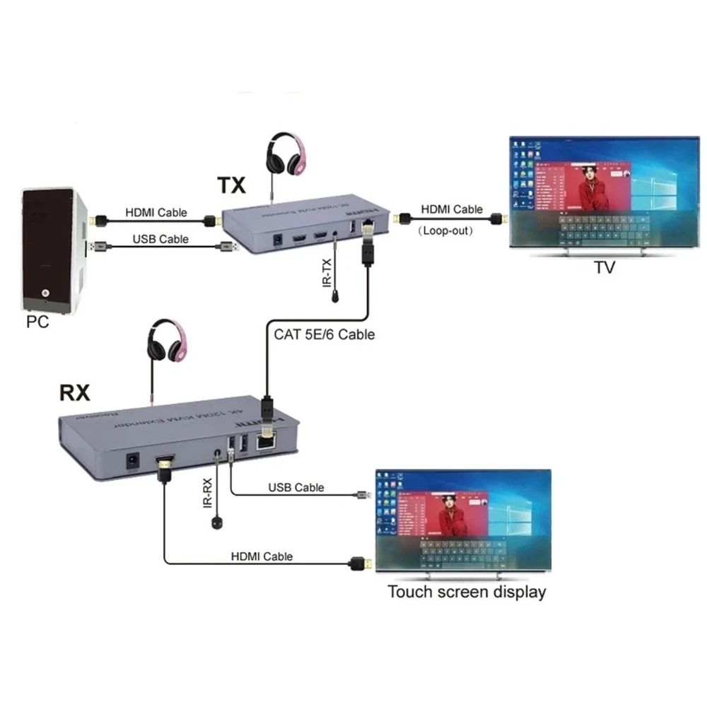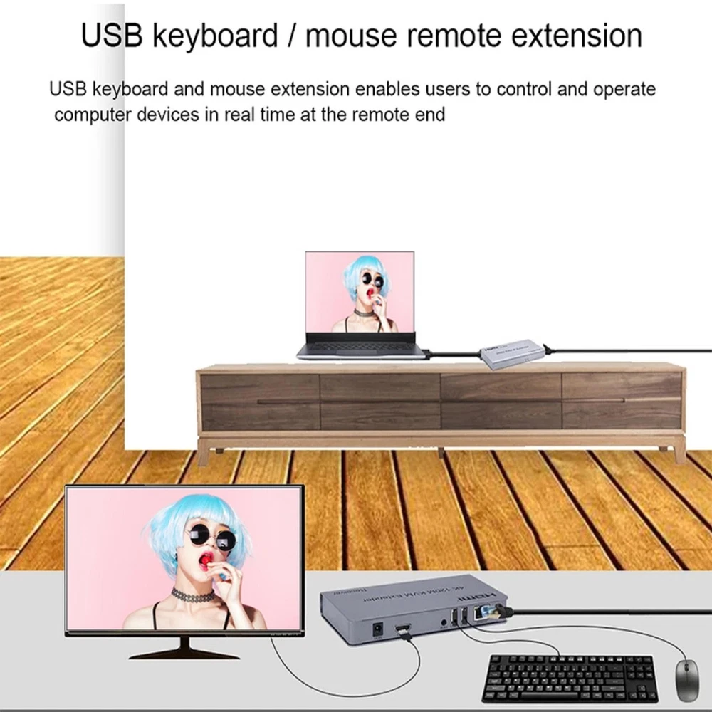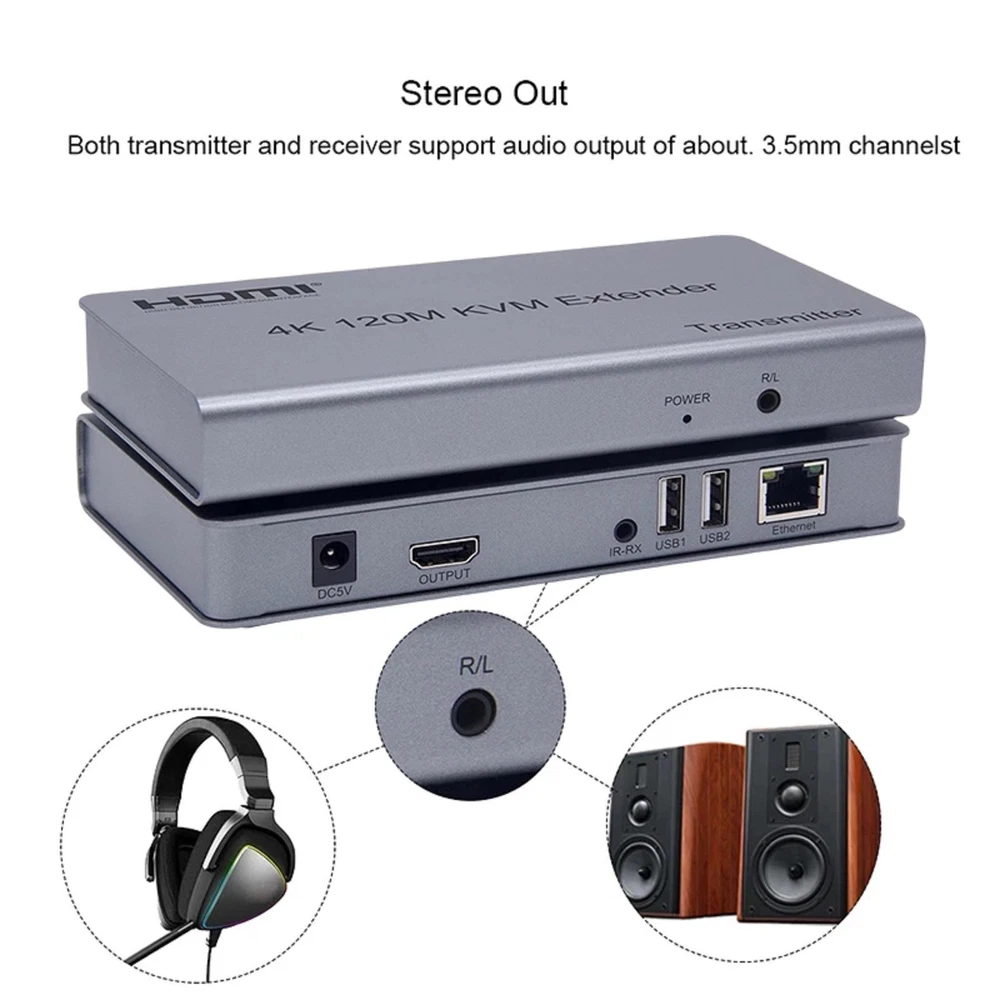 4K 120M HDMI KVM Extender over RJ45 Ethernet Cat5e/6 Cable HDMI USB extender Transmitter Receiver kit Support USB Mouse Keyboard Specifications: Length of CAT5e/CAT6 cable between Rx and TX: 120 meters HDMI Input: 4k 30hz/1080p/720p/576p/576i/480p/480i HDMI Output: 4k 30Hz/1080p/720p/576p/576i/480p/480i Max bandwidth: 340MHz Max baud rate: 3x3.4Gbps Input video signal: 0.5~1.5Volts p-p Output DDC signal: 5Volts p-p (TTL) Input HDMI cable distance: ≤10m AWG26 HDMI standard cable Output HDMI cable distance: ≤10m AWG26 HDMI standard cable TX Max working current: 350mA RX Max working current: 200mA Power Supply: DC5V/1A Operating Temperature range: 0°C to +55℃ Operating Humidity range: 10% to 80%RH (No Condensation) Storage temperature range: -10°C to 70°C Storage temperature range: 5% to 90% RH (No Condensation) Dimension (L x W x H): 163x85x24 (mm) Audio format: Stereo TX Weight: 499g RX Weight: 494g Features: *Support HDMI 1.4/HDCP1.4; *Support local loop-out ; *Support 120m long distance transmission. *Low power consumption, low temperature and high safety; *Both the TX and RX support 3.5MM left and right audio output; *Support IR control; *Support USB mouse and keyboard extension; Package includes: 1x Transmitter 1x Receiver 1x USB cable 1x IR-RX cable 1x IR-TX cable 2x DC 5V/1A selectable Power adapter 1x User manual