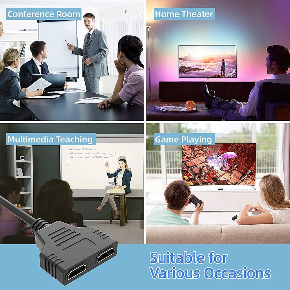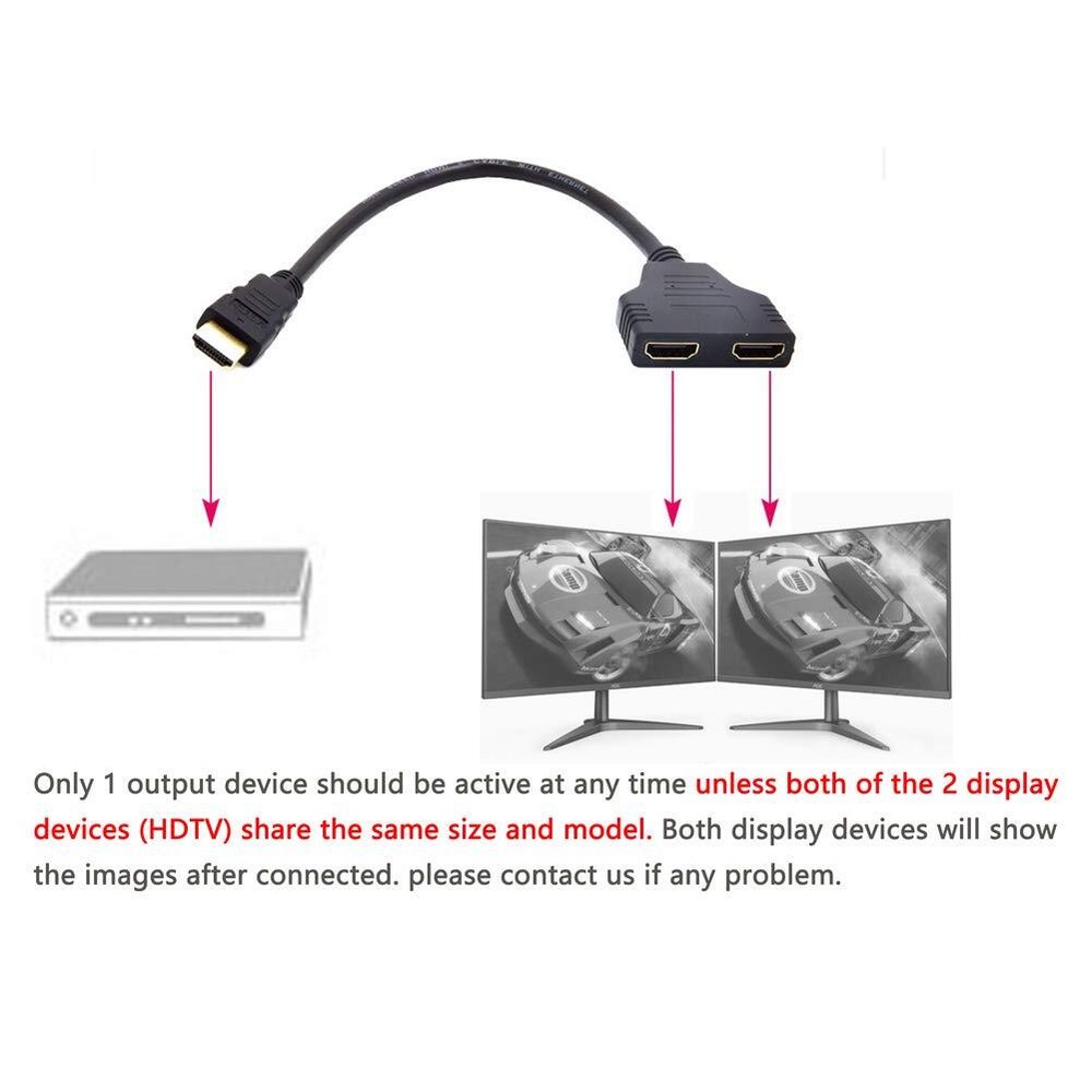 Installation steps: 1. Connect your devices with this splitter cable 2. Turn the signal source on or choose HDMI signal source 3. Turn the first display on first and wait till it works properly 4. Then turn the second display on and enjoy it Specifications: Color: Black Length: 11.8 inch (30 cm) Weight: 52.00g Function:Support Two TVs at The Same Time, Signal One in, Two Out , 24k gold-plated connector. Features: With this HDMI signal splitter,you can connecting one HDMI compatible device (Xbox, Blue ray, DVD players, PS3) to two visual output devises (such as, HDTV, Monitor, etc.). This HDMI Splitter Adapter Cable can transmits the video & audio signal from one HDMI compatible device (such as, a Blu-ray player, etc.) to one of two visual output devices (such as, HDTV, Monitor, etc.) that are plugged into it. If you have two HDTV in two different separate rooms, and you want to let the two different HDTV show the same image. After connected, you just need to turn one TV off and turn the other TV on, this HDMI splitter adapter cable can allow you watch the same image of TV in two rooms. Buyer Note: If you are satisfied with our service, we appreciate you leaving us a positive feedback and 5 star rating review! Your opinion is important to the success of our business. If you are not satisfied with the product or have not received the product for more than 35 days, please contact us to resolve, we will do our best to solve. We are sure to come up with a satisfactory solution. Please contact us first before leaving cold feedback or good feedback of 1-3 stars and opening the case. We'll do our best to solve your problem. Because we believe that everything can be solved through communication. Thank you very much!