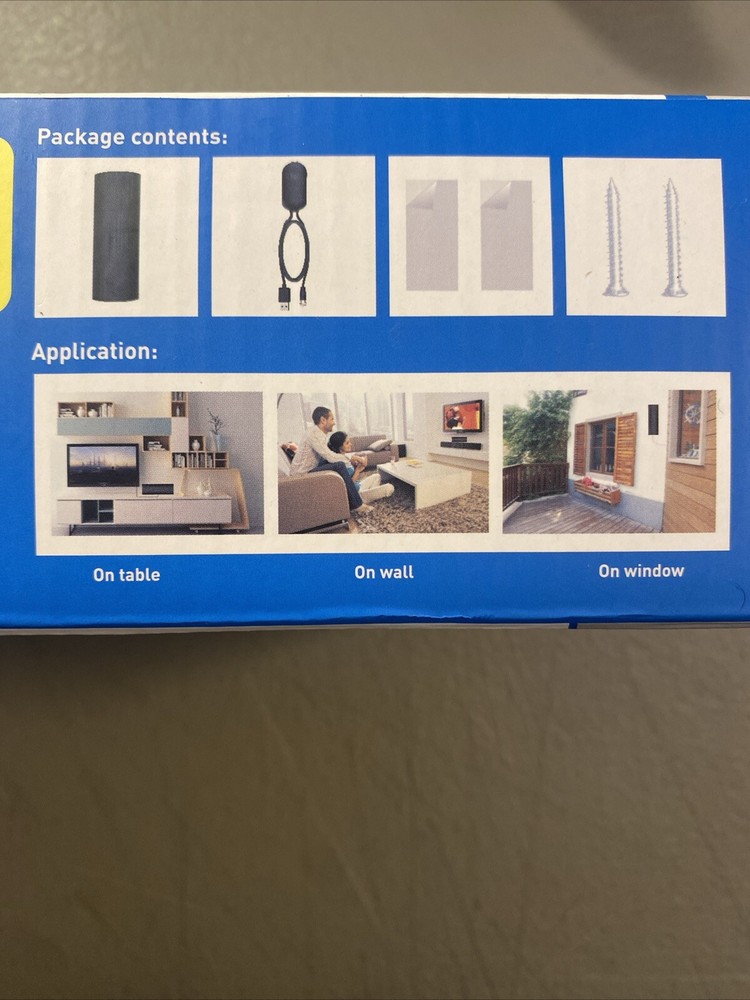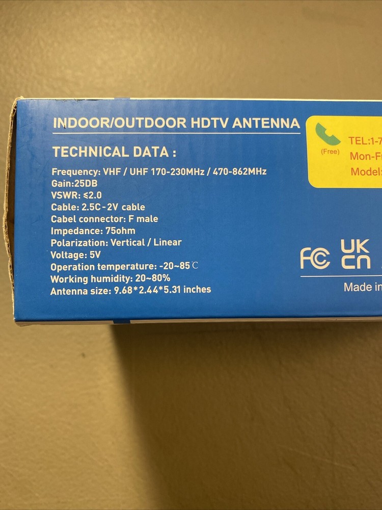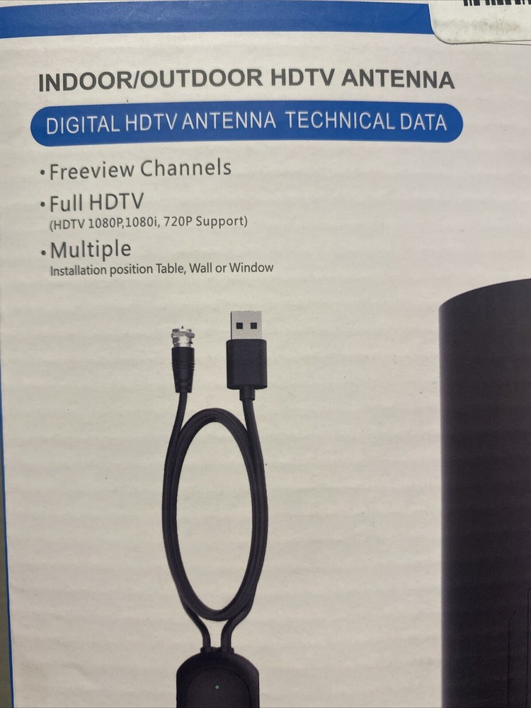 New unit; in box Freeview Channels • Full HDTV (HDTV 1080P,1080i, 720P Support) • Multiple Installation position Table, Wall or Window TECHNICAL DATA: Frequency: VHF / UHF 170-230MHz / 470-862MHz Gain:25DB VSWR: <2.0 Cable: 2.5C- 2V cable Cabel connector: F male Impedance: 750hm Polarization: Vertical / Linear Voltage: 5V Operation temperature: -20~85 C Working humidity: 20~80% Antenna size: 9.68*2.44*5.31 inches