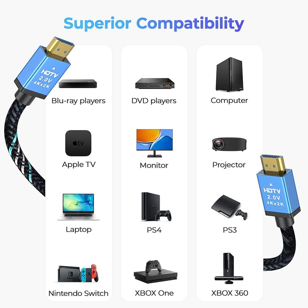 4K High Speed HDMI Cable, Aluminum Shell & Braided Nylon & Gold Connectors, 4K@60Hz UHD HDR HDMI 2.0 Cable, Compatible with Ethernet, PS4, Bluray, Projector, Monitor, HDTV - 10 Feet Meet HDMI specifications: Male to Male HDMI 2.0 Cable with ethernet supports 4K Video at 60Hz, 48 bit/px color depth HDR, Audio Return Channel(ARC), Dolby True-HD, DTS-HD and CEC. It's backwards compatible with earlier versions of HDMI cable (1.4/1.3/1.2/1.1) NOT for 8K. Superior Compatibility: Compatible with all of your HDMI devices DVD/Blu-ray players, Computer, Laptop, Monitor, Projector, Apple TV, PS4, PS3, XBOX One, XBOX 360, Nintendo Switch and more. Made of Premium Materials: The 30AWG copper wire for highest compatibility and transmission performance with modern equipment. Jacket connector part is made of 24K gold-plated material for accurate signal transmission and anti-corrosion. Premium aluminum housing for better thermal insulation. Nylon braided cable for maximum durability. Rigorously Testing: Each cable has been passed signal test, bend test, electromagnetic interference (EMI) test. We ensure that each cable meets the standards to provide high speed and reliable transmission performance. Cable length: 3 feet (0.9 meters) / 6 feet (1.8 meters) / 10 feet (3 meters) / 15 feet (4.6 meters) / 20 feet (6.1 meters) / 25 feet (7.6 meters) / 30 feet (9.1 meters)