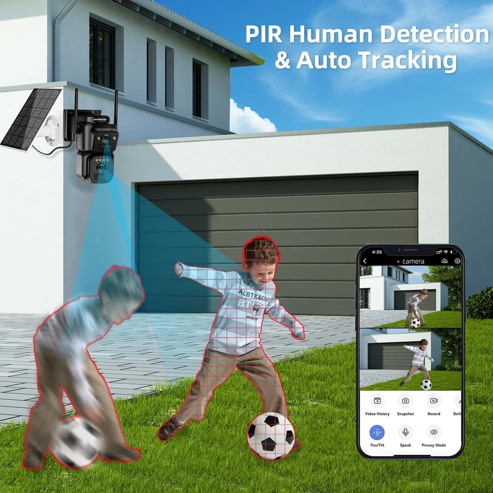 【Dual Lens & Dual Screen】Dual lens design, the wide-angle lens record the panoramic image, while the telephoto lens makes distant objects clearer. Just click on the panoramic screen and the dome screen will detect and move automatically, automatically locating the target. If there is a human in the bullet head or dome camera image, auto tracking will be activated.This innovative design allows for complete protection of the outdoor area, giving you peace of mind. 【Solar Powered & 100% Wire-Free】solar security cameras wireless outdoor with concave and convex panel design solar panel effectively improves the photoelectric conversion efficiency. The built-in high-capacity battery provides full protection even in unpowered environments, and can be connected to the solar panel or cable to recharge the dual lens security camera wireless outdoor to ensure uninterrupted surveillance and prolonged usage time and service life. 【4K 8MP HD & Color Night Vision】The PTZ solar outdoor security camera is equipped with 6 infrared lights and 6 white light lights, providing 4K and 8MP high definition color videos. There are three night vision modes to choose from (infrared, color, intelligent night vision). Dual lens design, panoramic and local view, allowing you to see clearer details in the dark. 【PIR Human Detection & Auto Tracking】Thanks to precise artificial intelligence algorithms, this solar security camera is able to accurately detect human, filter out invalid video content and effectively reduce false positives. Enable automatic tracking function to effectively tracking the movement trajectory of intruders. Push in real time, effectively protecting the security of your family's property. 【2-Way Audio & Intelligent Storage】2-Way Audio, you can communicate with visitors in the surveillance area in real time at any time, support multi-person sharing, just share the QR code to your family and friends. Video can be recorded to micro SD card with maximum capacity of 256GB and cloud storage, encrypted secure data(SD card not included).