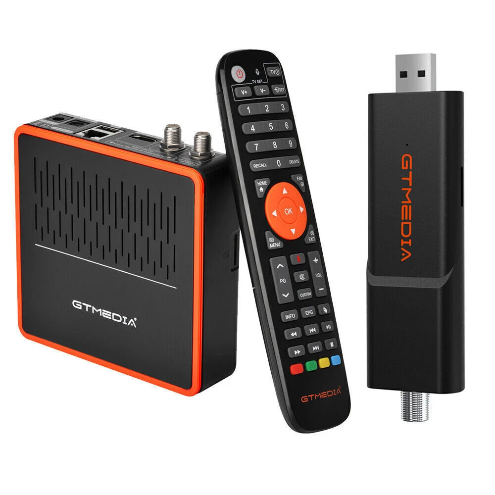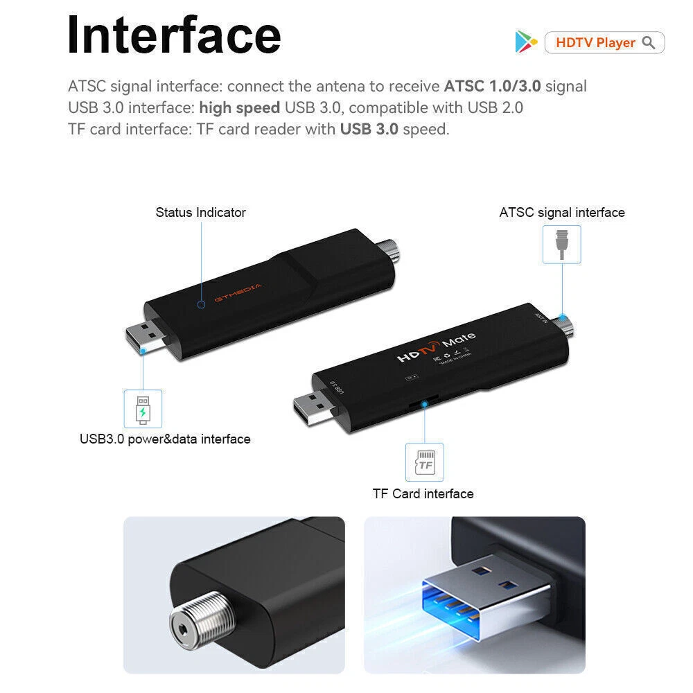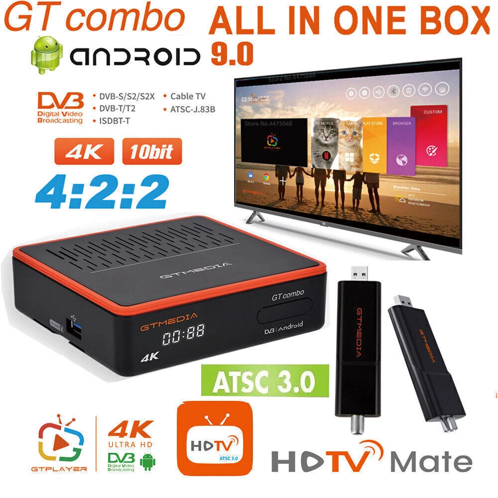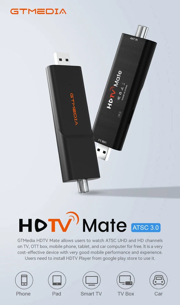 Main Features: ⭐【Combo DVB Receiver+Android 9.0 TV BOX】 ⭐【YUV4: 2: 2 Video Decoding】 ⭐【Remote control with learning function】 ⭐【Supports smart card slot】 ⭐【Support for multiroom function】 ⭐【Pre-installed video application】 ⭐【2.4G /5G dual wifi + bluetooth 4.1 voice remote control】 ⭐【Customize by user】 You can change the wallpaper at any time and customize the remote control function buttons to allow for personalized customization ⭐【DLNA and SAT A IP, EPG and LCN】 Supports the mutual projection of screens of mobile phones and other devices. Support EPG and LCN worldwide and support automatic channel updates. ⭐【PVR recording function】 Support program recording while watching other live broadcasts. Accessories: 1* GTMEDIA GT Combo TV Box 1* Remote Control 1* HDMI Cable 1* Adapter # GT COMBO Main Features: ⭐ 【 Combo DVB Receiver+Android 9.0 TV BOX 】 supports DVB-S/ S2/S2X, DVB+ T/T2/cable/ATSC-C (J.83B)/ISDBT, AVS + ,It supports all signal TV program channels, including satellite TV, terrestrial broadcast TV, and cable TV programs. It also has an Android system. You can experience smart life at any time and download and install your favorite apps at any time. ⭐【 YUV4: 2: 2 Video Decoding 】 The first machine on the market that supports YUV422 , bringing you an unprecedented viewing experience ⭐ 【 Remote control with learning function 】 Easy to copy button setting from other remote controls, you can use one remote control, easy to use ⭐【 Supports smart card slot 】 Support many European smart TV cards like Abertis/Mediaset/Movistar/Tivusat/BBC Satback and other CA cards (see list of supported smart cards below, or you can provide a photo of your card to ask if they are yours can read). ⭐【 Support for multiroom function 】 With the multiroom function, you can divide your card into several boxes (up to 16). When you have a smart card but have two or more boxes. You can put a smart card in a box and configure it as a server. Then define the other enclosures as clients to connect this server over the network. The customer boxes share this smart card. ⭐ 【 Pre-installed video application 】 The system is GT UI, GTStore Addons pre-installed Netflix, Youtube, Prime-Video , Online Movies, etc. ⭐【 2.4G /5G dual wifi + bluetooth 4.1 voice remote control 】 gives you more choice, more sensitive and convenient than the previous infrared remote control, you can solve your worries anytime anywhere ⭐【 Customize by user 】 You can change the wallpaper at any time and customize the remote control function buttons to allow for personalized customization ⭐【 DLNA and SAT A IP, EPG and LCN 】 Supports the mutual projection of screens of mobile phones and other devices. Support EPG and LCN worldwide and support automatic channel updates. ⭐【 PVR recording function 】 Support program recording while watching other live broadcasts. Hardware: CPU: Amlogic S905X3, Quad-Core ARM Cortex-A53, 18.400 DMIPS GPU: ARM Mali-G31 MP2, 850MHz RAM: 2G DDRIII # HDTV Mate GTMEDIA HDTV Mate -- Newest ATSC TV Tuner 4K UHD USB 3.0 ATSC 3.0/1.0 DVR EPG Digital TV Tuner for Android 9.0 and later TV/TV BOX/Car/Phone/ Fire OS 7 or late r system TV ATSC 3.0 is the latest standard for digital terrestrial TV broadcasting. It can improve the television viewing experience with 4K UHD, HDR, WCG, HFR, Dolby AC-4(7.1.4 channel), robust transmission for reception on both fixed and mobile devices, and more accessibility, personalization and interactivity. (Please install HDTV Player from google play store on the corresponding smart device according to your usage scenario, and then you can use this device.) You can watch these two video befor buy it, please feel free to contact us if you have any questions, thank you! https://youtu.be/K1lrzezUwzk https://youtu.be/9SY4lpU_po4?si=sWNT2o5UDxJQ6cUk Support: Android OS ( Android 9.0 or later ) TV Model: For Sony, For Philips, For Hisense, For Sharp Smart TV Box: with built in Android 9.0 system or later Smart Phone: with built in Android 9.0 system or later Fire OS ( Fire OS 7 or late r ) TV Model: For Fire TV Edition, For Fire TV Omni, For Fire TV Cube, For Fire TV 4K, For insignia, For lg, For hisense, For tcl, For ONIDA 4k, For Toshiba, For Funai 4k Roku OS is coming soon! Features: 🏆 GTMedia HDTV Mate is a cost-effective USB Tuner Stick with an ATSC 3.0/1.0 digital terrestrial demodulator. Watch ATSC 3.0 programs at anytime,anywhere with HDTV Player. 🔆 Wide Compatibilit y-- It supports to use with many device . Compatible devices: mobile phones, smart TVs, laptops, tablets, car computers, and TV boxes based on Android 9.0 or above. you can use it at home/car/outside/everywhere. 🎁 Specially designed APP-- HDTV Player -- Support Android 9.0+ HDTVPlayer APP,Google store download . (Please install HDTV Player from google play store on the corresponding smart device according to your usage scenario, and then you can use this device.) Support apple HDTVPlayer IOS,App store download (it doesn't support IOS system now, but will coming soon) 📺 Fully compatible with ATSC digital TV standard, Clear UHD/HD picture and easy to install and use. Watch ATSC 3.0 programs at anytime, anywhere. ( The DRM Channels is coming soon! ) 🎥 DVR Recording and Playback -- Record all your favorite TV shows and movies for future watch with no limited TF card. (TF card is not included in the package) Recording one channel, can view another channel under the same TP. 🔠 Support EPG and CC -- Support 7 days Electronic Program Guide(EPG). Full access to all receivable channels in your local area Closed Captioning (CC) ✅ Portable -- Mini Pocket Size -- the product size is only 4.13*1.26*0.59 inches (10.5*3.2*1.5 cm), and the weight is only 0.26lb (0.12Kg), lightweight and small size, easy to take it to everywhere. HDTV Playe Software Features: 🔴 Fully compatible with ATSC digital TV standard, Clear UHD/HD 