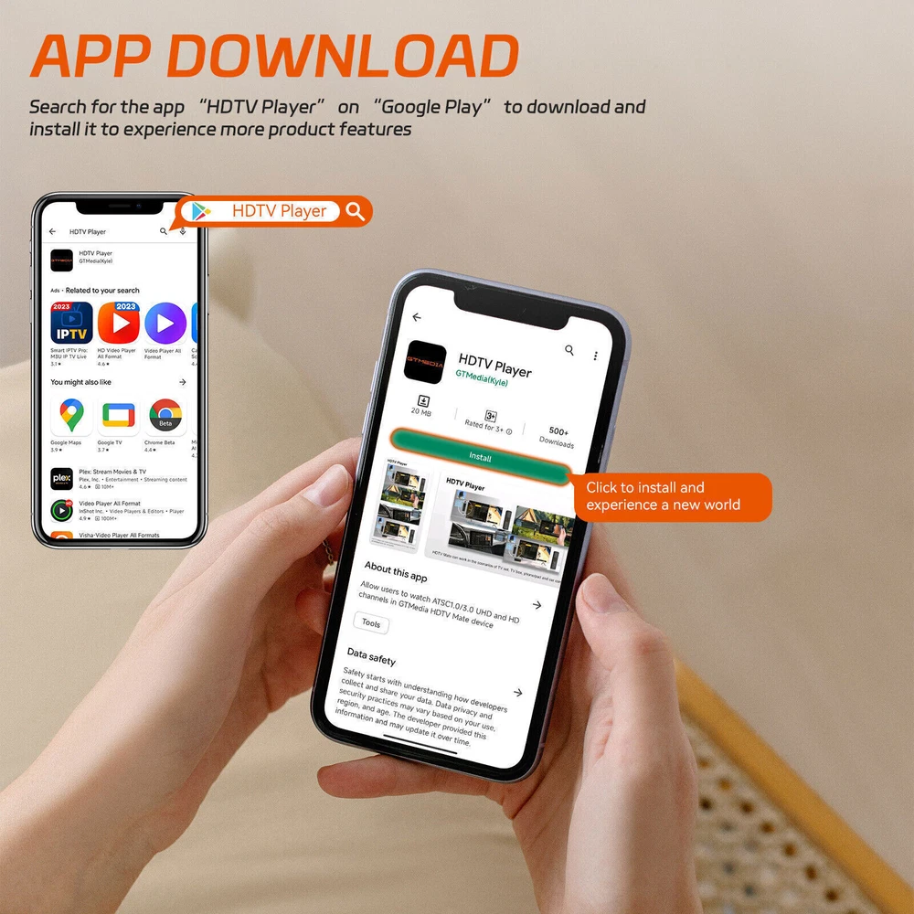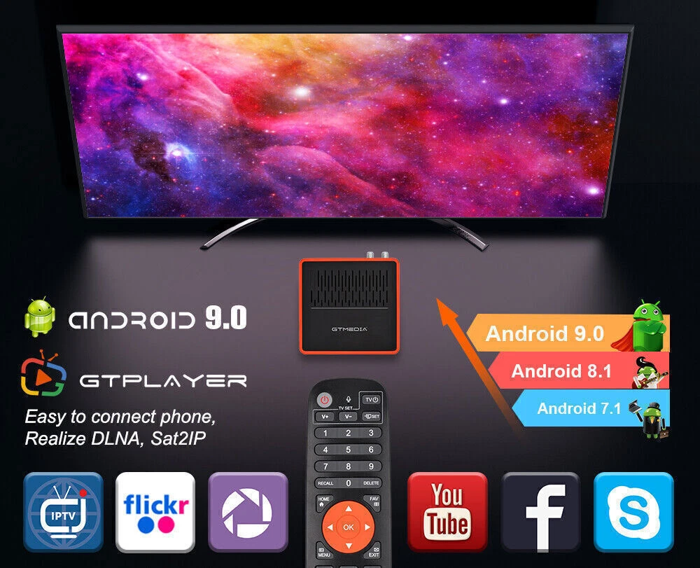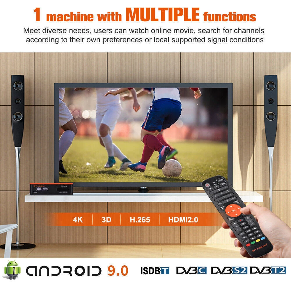Main Features: ⭐【Combo DVB Receiver+Android 9.0 TV BOX】 ⭐【YUV4: 2: 2 Video Decoding】 ⭐【Remote control with learning function】 ⭐【Supports smart card slot】 ⭐【Support for multiroom function】 ⭐【Pre-installed video application】 ⭐【2.4G /5G dual wifi + bluetooth 4.1 voice remote control】 ⭐【Customize by user】 You can change the wallpaper at any time and customize the remote control function buttons to allow for personalized customization ⭐【DLNA and SAT A IP, EPG and LCN】 Supports the mutual projection of screens of mobile phones and other devices. Support EPG and LCN worldwide and support automatic channel updates. ⭐【PVR recording function】 Support program recording while watching other live broadcasts. Accessories: 1* GTMEDIA GT Combo TV Box 1* Remote Control 1* HDMI Cable 1* Adapter # GT COMBO Main Features: ⭐ 【 Combo DVB Receiver+Android 9.0 TV BOX 】 supports DVB-S/ S2/S2X, DVB+ T/T2/cable/ATSC-C (J.83B)/ISDBT, AVS + ,It supports all signal TV program channels, including satellite TV, terrestrial broadcast TV, and cable TV programs. It also has an Android system. You can experience smart life at any time and download and install your favorite apps at any time. ⭐【 YUV4: 2: 2 Video Decoding 】 The first machine on the market that supports YUV422 , bringing you an unprecedented viewing experience ⭐ 【 Remote control with learning function 】 Easy to copy button setting from other remote controls, you can use one remote control, easy to use ⭐【 Supports smart card slot 】 Support many European smart TV cards like Abertis/Mediaset/Movistar/Tivusat/BBC Satback and other CA cards (see list of supported smart cards below, or you can provide a photo of your card to ask if they are yours can read). ⭐【 Support for multiroom function 】 With the multiroom function, you can divide your card into several boxes (up to 16). When you have a smart card but have two or more boxes. You can put a smart card in a box and configure it as a server. Then define the other enclosures as clients to connect this server over the network. The customer boxes share this smart card. ⭐ 【 Pre-installed video application 】 The system is GT UI, GTStore Addons pre-installed Netflix, Youtube, Prime-Video , Online Movies, etc. ⭐【 2.4G /5G dual wifi + bluetooth 4.1 voice remote control 】 gives you more choice, more sensitive and convenient than the previous infrared remote control, you can solve your worries anytime anywhere ⭐【 Customize by user 】 You can change the wallpaper at any time and customize the remote control function buttons to allow for personalized customization ⭐【 DLNA and SAT A IP, EPG and LCN 】 Supports the mutual projection of screens of mobile phones and other devices. Support EPG and LCN worldwide and support automatic channel updates. ⭐【 PVR recording function 】 Support program recording while watching other live broadcasts. Hardware: CPU: Amlogic S905X3, Quad-Core ARM Cortex-A53, 18.400 DMIPS GPU: ARM Mali-G31 MP2, 850MHz RAM: 2G DDRIII # HDTV Mate GTMEDIA HDTV Mate -- Newest ATSC TV Tuner 4K UHD USB 3.0 ATSC 3.0/1.0 DVR EPG Digital TV Tuner for Android 9.0 and later TV/TV BOX/Car/Phone/ Fire OS 7 or late r system TV ATSC 3.0 is the latest standard for digital terrestrial TV broadcasting. It can improve the television viewing experience with 4K UHD, HDR, WCG, HFR, Dolby AC-4(7.1.4 channel), robust transmission for reception on both fixed and mobile devices, and more accessibility, personalization and interactivity. (Please install HDTV Player from google play store on the corresponding smart device according to your usage scenario, and then you can use this device.) You can watch these two video befor buy it, please feel free to contact us if you have any questions, thank you! https://youtu.be/K1lrzezUwzk https://youtu.be/9SY4lpU_po4?si=sWNT2o5UDxJQ6cUk Support: Android OS ( Android 9.0 or later ) TV Model: For Sony, For Philips, For Hisense, For Sharp Smart TV Box: with built in Android 9.0 system or later Smart Phone: with built in Android 9.0 system or later Fire OS ( Fire OS 7 or late r ) TV Model: For Fire TV Edition, For Fire TV Omni, For Fire TV Cube, For Fire TV 4K, For insignia, For lg, For hisense, For tcl, For ONIDA 4k, For Toshiba, For Funai 4k Roku OS is coming soon! Features: 🏆 GTMedia HDTV Mate is a cost-effective USB Tuner Stick with an ATSC 3.0/1.0 digital terrestrial demodulator. Watch ATSC 3.0 programs at anytime,anywhere with HDTV Player. 🔆 Wide Compatibilit y-- It supports to use with many device . Compatible devices: mobile phones, smart TVs, laptops, tablets, car computers, and TV boxes based on Android 9.0 or above. you can use it at home/car/outside/everywhere. 🎁 Specially designed APP-- HDTV Player -- Support Android 9.0+ HDTVPlayer APP,Google store download . (Please install HDTV Player from google play store on the corresponding smart device according to your usage scenario, and then you can use this device.) Support apple HDTVPlayer IOS,App store download (it doesn't support IOS system now, but will coming soon) 📺 Fully compatible with ATSC digital TV standard, Clear UHD/HD picture and easy to install and use. Watch ATSC 3.0 programs at anytime, anywhere. ( The DRM Channels is coming soon! ) 🎥 DVR Recording and Playback -- Record all your favorite TV shows and movies for future watch with no limited TF card. (TF card is not included in the package) Recording one channel, can view another channel under the same TP. 🔠 Support EPG and CC -- Support 7 days Electronic Program Guide(EPG). Full access to all receivable channels in your local area Closed Captioning (CC) ✅ Portable -- Mini Pocket Size -- the product size is only 4.13*1.26*0.59 inches (10.5*3.2*1.5 cm), and the weight is only 0.26lb (0.12Kg), lightweight and small size, easy to take it to everywhere. HDTV Playe Software Features: 🔴 Fully compatible with ATSC digital TV standard, Clear UHD/HD 