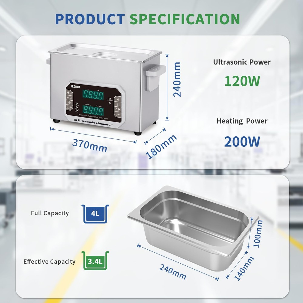 is a professional manufacturer of ultrasonic cleaners and has focused on the R&D of ultrasonic cleaners for more than 10 years. always bears in mind the "quality first, credit first" principle and tries to provide perfect products and great after-sales service. Specifications Control Mode: Touch Control Tank Material: Stainless Steel SUS304 Heating Power: 200W Ultrasonic Power: 120W Frequency: 40kHz&33kHz Power Supply: AC110V/60Hz Tank Capacity: 4L Time Setting: 1~99 Minutes Temperature Setting: Temp Settings within 0~80℃ Transducer Quantity: 2 sets Tank Size (L x W x H): 300*152*100 mm/11.8*6*3.9 in Product Size (L x W x H): 330*180*240 mm/13*7.09*9.45 in Package Contents 1 x Ultrasonic Cleaner 1 x Cleaning Basket 1 x Stainless Steel Cover 1 x Power Supply 1 x Instruction Manual Multiple Cleaning Modes for an Extensive cleaning Range: Fullwave,Semiwave,Degas,Power Sweep Cleaning Modes based on 40KHz ultrasonic frequency make the device applicable for rough surface cleaning and intensive rinse. Generally, fullwave and power sweep cleaing modes are used for making intensive rinse, while semwave is used for rough surface cleaning Touch Control Panel with LED Display and Memory Function: Touch control panel can make the device be operated without any big force and therefore make the device have a long service life; especially the preset cleaning time and heating temperature can be memorized by the device even after power-off unless it is reset manually Die-casting SUS304 Stainless Steel Tank: The inner cleaning tank of the devices is made with SUS304 stainless steel materials, and it makes the device be resistant to weak acid and weak alkali SUS304 Stainless Steel Drain Valve and Die-casting Tank: Both the cleaning tank and drain valve of the device are made with SUS304 stainless steel materials, and it makes the device be resistant to weak acid and weak alkali 0~80°C Heating Range for Degreasing and Dewaxing: Heating function is helpful for reducing the adhesion strength of oil and wax so as to improve the cleaning effect, and generally the best cleaning temperature is among 40~60°C, i.e. 104~140°F