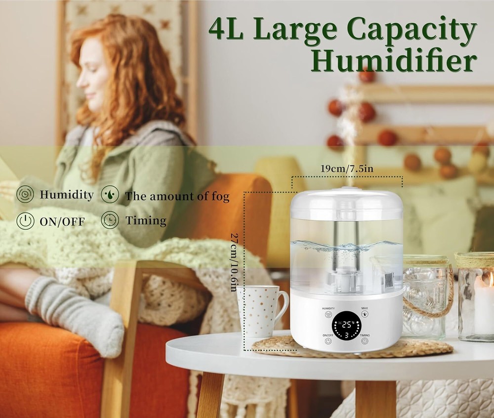 Product Description Humidifiers for Bedroom Home, 4L Top-Fill Cool Mist Humidifier, Easy to Clean, Auto Shut-Off, Quiet Ultrasound Air Humidifier for Home, Baby Nursery, Large Room and Plants 4L LARGE CAPACITY & DUAL SPRAY OUTLET DESIGN: This humidifier for bedroom has a large 4-liter water tank that can be used for a long time without frequent refilling. Our product is upgraded with dual misting ports for fast wetting, ensuring fast and efficient distribution of humidity in large spaces. ULTRA QUIET HUMIDIFICATION: Our cool mist humidifiers operate at less than 30 decibels, you won't even hear a sound when in use, creating a quiet environment for undisturbed sleep. TOP FILL DESIGN & TRANSPARENT TANK: The Top fill humidifier features a large opening top fill design, making it super easy to refill! Easily fill water from the top without spilling any water. Meanwhile, our water tank housing is transparent, monitor the water level at any time, more convenient. POWERFUL WATER MIST OUTPUT: The water mist output is up to 280ml/h, which can easily humidify a room up to 600 feet, and the high mist sprays evenly without wetting the desktop, and at the same time realizes a wide range of humidification. Relieve the dry air problem faster, let you breathe smoothly and healthy. LACK OF WATER CUTOFF: Our humidifiers for bedroom has a built-in lack of water cutoff system, which can accurately sense the lack of water, you don't have to worry about forgetting to add water to cause some problems. About Us We are a reputable seller with many years of experience selling on eBay. Our goal is to provide high-quality products and excellent customer service. Shipping Items will be shipped within 1-3 business days when we received payment. (Orders are not processed on weekends & holidays) Tracking information will be sent once item is shipped. Delivery time depends on destination and other factors Item is shipped to ebay address. Leaving correct address can minimize delay. For international shipping and shipping to Guam, Hawaii and Alaska, Please contact us before placing the order. International buyers please note: Import duties, taxes and charges are not included in the item price or shipping charges. These charges are buyer’s responsibility. We will try our best to reduce the risk of the custom duties. Local pick-up is unavailable at the moment. Contact Us We reply any email messages within 1 business / working days(off-duty at weekend). If you do not get a response from us, then please check your junk or spam mailbox. Our Business hours: Mon-Fri 9:00-18:00, UTC/GMT +8 hours. Please contact us either by clicking "contact seller" in the "purchase history" section or simply click "ask a question" at the bottom of this page. If you are unsatisfied with our item or service, please contact us before leaving any feedback. We are committed to resolve all issues in a friendly and satisfactory manner.