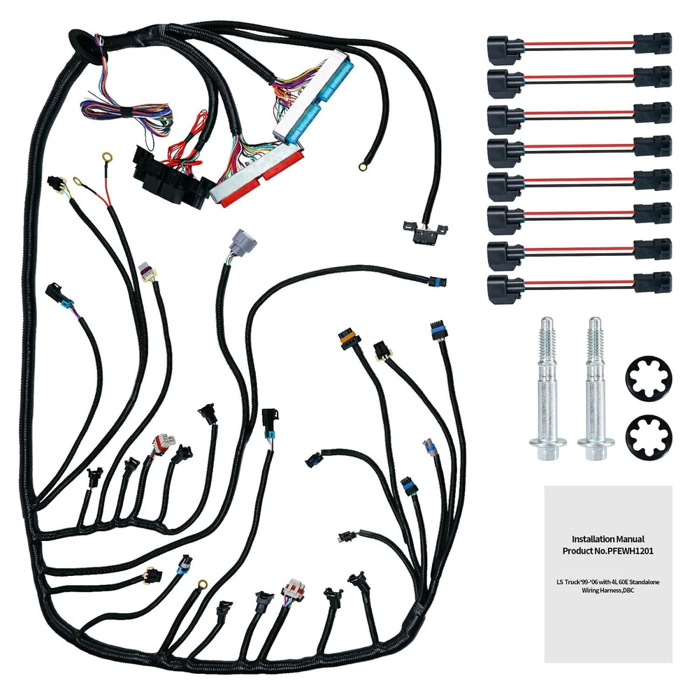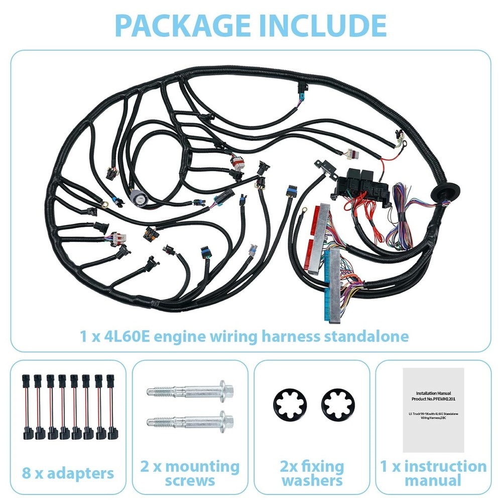 4L60E Engine Wiring Harness LS Swap Standalone Wire Compatible with 1997-2006 GM DBC LS1 4.8L 5.3L 6.0L Vortec Engines W/4L60E Transmission Drive by Cable Item Description About this item Compatible Models:Compatible with 1997-2006 DBC LS1 4.8L 5.3L 6.0L Vortec Engines.Compatible with Chevy GMC Cadillac Hummer Trucks. [Complete Wiring Harness Kit] :This 4L60E Engine Wiring Harness kit all come with the necessary connectors for the dashboard, which include Speedometer, Tachometer, Park Neutral, Malfunction Indicator, DLC ports, etc. [Stable conductivity]:Our 4L60E standalone wiring harness adopts high-quality copper core wire with good conductivity and stability, and is equipped with high-quality washers (which can be slid in and out for installation as needed). [Plug and Play]: Adopting a plug and play design, connecting different colored plugs for easy installation. And accompanied by an instruction manual to guide installation. [Package Include]:1 x 4L60E engine wiring harness standalone, 8 x adapters, 1 x instruction manual, 2 x mounting screws, 2 x fixing washers. › See more product details Payment We accept payment only through PAYPAL Shipping We ship products worldwide through standard express courier service, it will reach within 7 to 10 days to abroad buyers, we ship the product after recieved clear payment and give full information about shipment to the buyer Return We accept product return within 7 to 21 days from delivery date but product should be in original position and not in damaged condition,the return shipping charges will be buyer responsibility