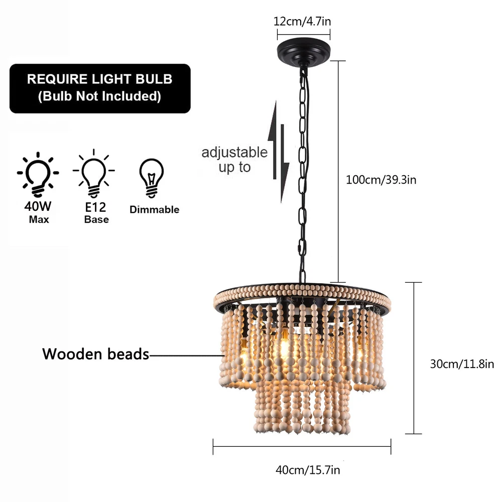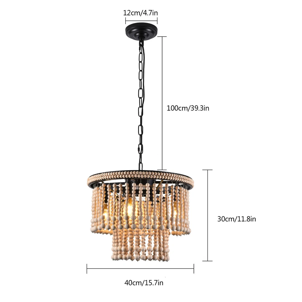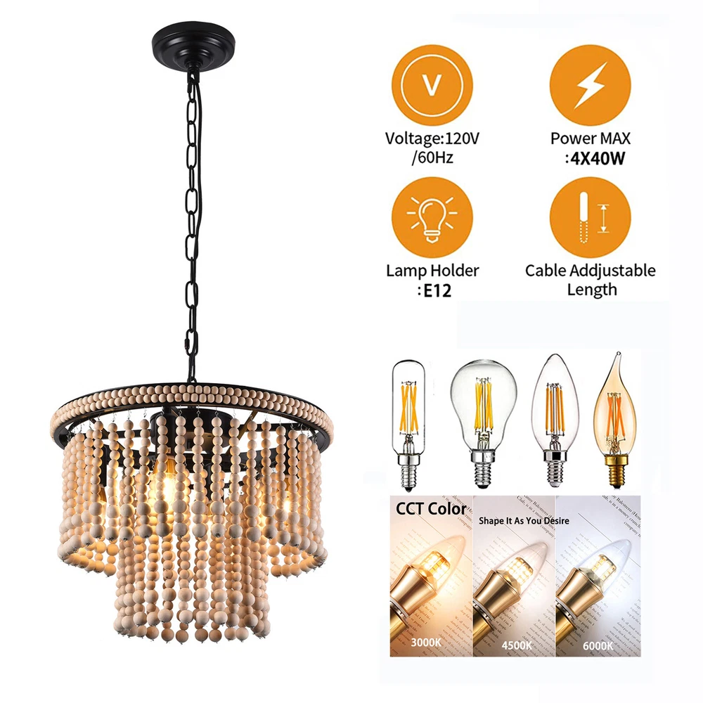 🧡🧡🧡 Welcome to Automaimaimai 🧡🧡🧡 About this item Material Wood, Metal Gold chandelier dimensions: 15.7" Diameter x 11.8" Height Canopy: 4.7" Diameter x 1" Height Adjustable chain: 39.3" Length Bulbs: E12*4 Voltage:110-120V Style:Antique, Classic, Farmhouse, Rustic, Boho Color:Red Bronze Material:Wood, Metal Finish Types Oil Rubbed Number of Lights:4 Maximum Compatible Wattage:40W Installation Instruction: Included Features: 【4xE12 Bulbs】 It works well with any E12 bulb base, Maximum power: 40W (each bulb), LED or CFL or incandescent,Edison bulbs, (Bulbs NOT Included,each bulb is recommended). [INSPIRED DESIGN] With a bohemian-inspired take on the farmhouse chandelier, - The farmhouse light fixture is handmade, wood beads strands are pre-assembly, the bohemian light looks beautiful and casts a gorgeous light when on. The natural beads hanging gracefully from the vintage retro metal frames, eye-catching look that enhances the beauty of the room and casts a warm glow throughout your space. Easy to assemble and put up- The Antique Bead Chandelier is easy to install, This antique bead wood chandelier is compatible with all ceiling types including flat, sloped, slanted and vaulted ceilings. Wide Application : The pendant light is ideal used for indoor kitchen island, Dinning room, Restaurant, cafe, Living Room.Perfect for modern home furnishing and matching with vintage styles. Easy Installation : All mounting hardware required for installation of chandelier are included in the package. Just need to follow the illustrated instructions of the hanging light provided for assembly and installation! What you get: 1 x Unassembed Pendant Light (Bulbs Not Included) 1 xScrews sets 1 xInstruction Manual Tips: -Please make sure the light is securely supported and is disconnected from power when installing. -Installing the light bulbs before hanging the makes the installation easier. Payment Delivery details Terms of sales About us Contact us Payment We accept ebay payment 。 Fees such as import duties, taxes are not included in the item price or shipping costs. These charges are the buyer's responsibility. Delivery details Shipping: 2-9 working days to: USA Terms of sales We maintain high standards of excellence and strive for hundred percent customer satisfaction. Feedback is very important to us. We hope that you contact us immediately before you give neutral or negative feedback, so that we can address your concerns. It is impossible to address issues if we do not know about them! About us Your satis faction is our ultimate goal. We work hard to earn your trust and future business. Our certified technicians have tested each item before shipping. The unit comes with 1 year limited warranty on all manufacturing defects. a) If you receive a defective item, you may return it or ask for a discount. Please contact us within 14 days after you receive the package. b) What you returned must be intact and in its original packaging as re? u. Customer is responsible for shipping costs of the returned item. c) We will cover the cost of shipping back t with the shipping rate indicated in the registration page. We will send you a new unit or refund the full payment you paid. Thank you. Contact us Business Hour Business Hour: Monday To Friday: 8:30 AM to 5:00 PM (Beijing China time) Due to time zones, our reply to your questions may not be immediately. But within above working time, we will reply your email within 24 hours. If it's non-workdays, please kindly be patient and wait till Monday. Please contact us with ebay message. Please feel free to contact us if you have any questions. Monday To Friday: 8:30 AM to 5:00 PM (Beijing China time) Due to time zones, our reply to your questions may not be immediately. But within above working time, we will reply your email within 24 hours. If it's non-workdays, please kindly be patient and wait till Monday. Please contact us with ebay message. Please feel free to contact us if you have any questions. Brand Unbranded Feature 1 Great Durability,Exquisite Appearance,High-quality Features Compact Design and Beautiful Appearance Average Service Life 5~10 Years Model Ceiling fan light MPN Does not apply LED String/Strip Type LED Country/Region of Manufacture China Sensor Type Light Installation Area Indoor Type Ceiling Fan Power Consumption 40W Room Bathroom, Bedroom, Dining Room, Home Office/Study, Kitchen, Living Room Lighting Technology LED Voltage 110-120V Mounting Ceiling Material Metal & Wood Beads Finish Oil Rubbed Manufacturer Warranty 2 Years Number of Lights 4 Power Source Hardwired Item Diameter 15.7" Item Height 11.8" Bulb Type E12 Bulbs (Bulb NOT Included) Style Farmhouse Assembly Required Yes Light Direction Upwards