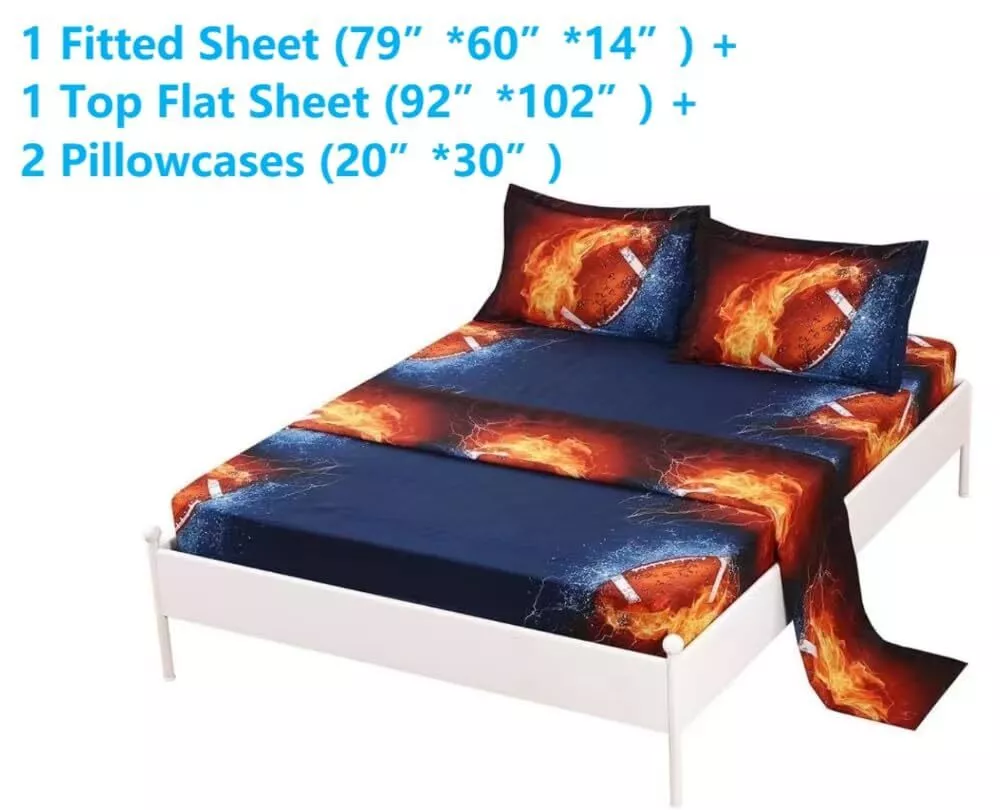 4Pcs American Football Sheets Queen, Bed in a Bag Football Bedding Sheet Set, Soft Microfiber, and Fade Resistant, Sports Sheets for Boys Girls Teens on , Queen Included:The football queen sheet set includes 1 fitted sheet (79”* 60”* 14”)+1 flat sheet (92”* 102”)+2 pillowcase (20”* 30”). Queen sheet set deep pocket with elastic all around, fits mattresses up to 14". Competitive Edge: 3 stitches of work per centimeter make the American football sheets queen size bed set durable. The material used is microfiber, which is soft, fade resistant, lightweight and skin-friendly. Features: Half fiery half watery footballs with a dark blue background has been designed for the football queen size sheets. Our sports sheets set collection will create a new sleeping experience, making you feeling refreshed. Ease of Care: The sports queen size bed sheets are machine washable, simply wash in cold water and tumble to dry. You do not need to iron it. Service: If the football queen size sheets deep pocket are any issue, we are more than happy to solve it for you.