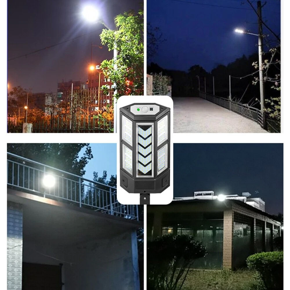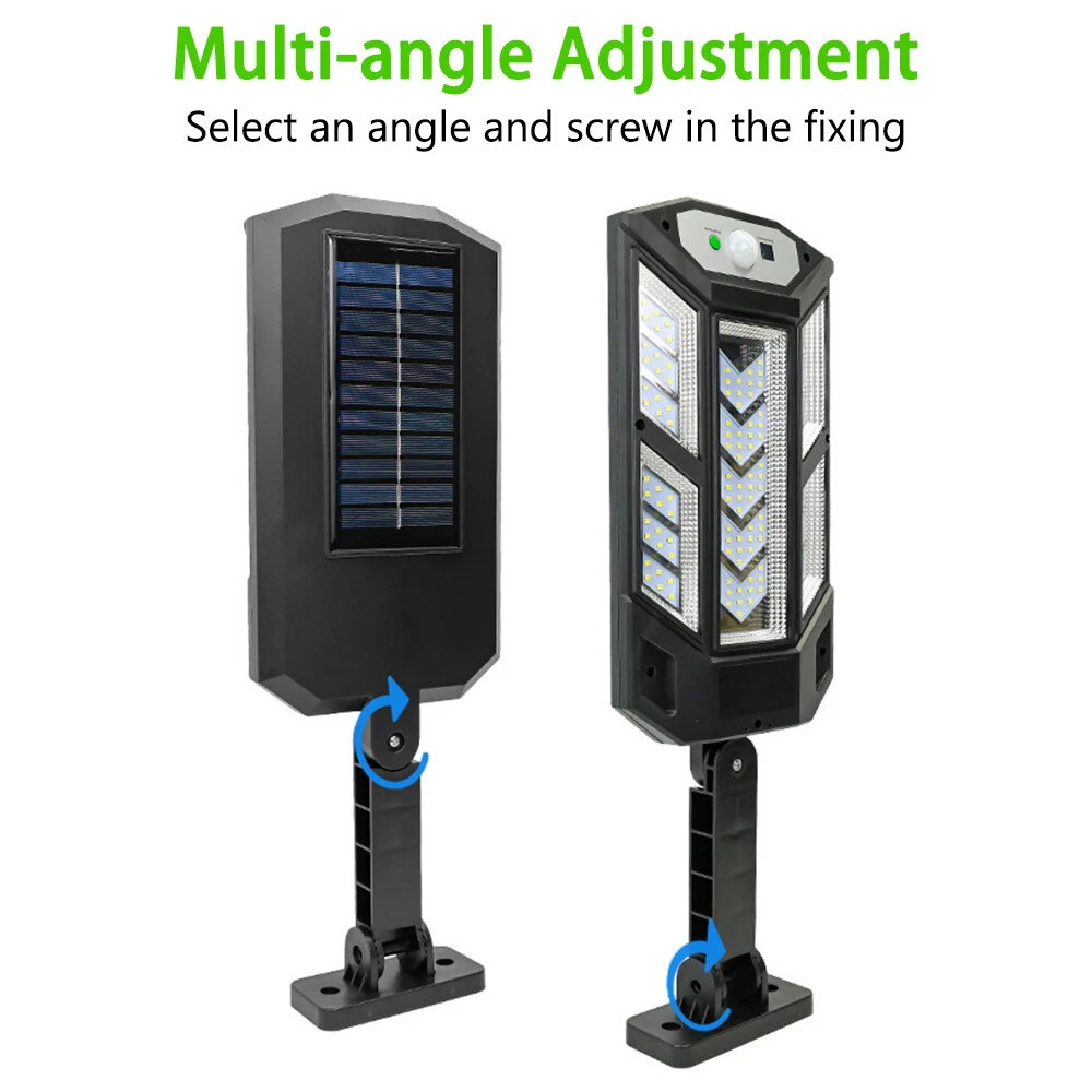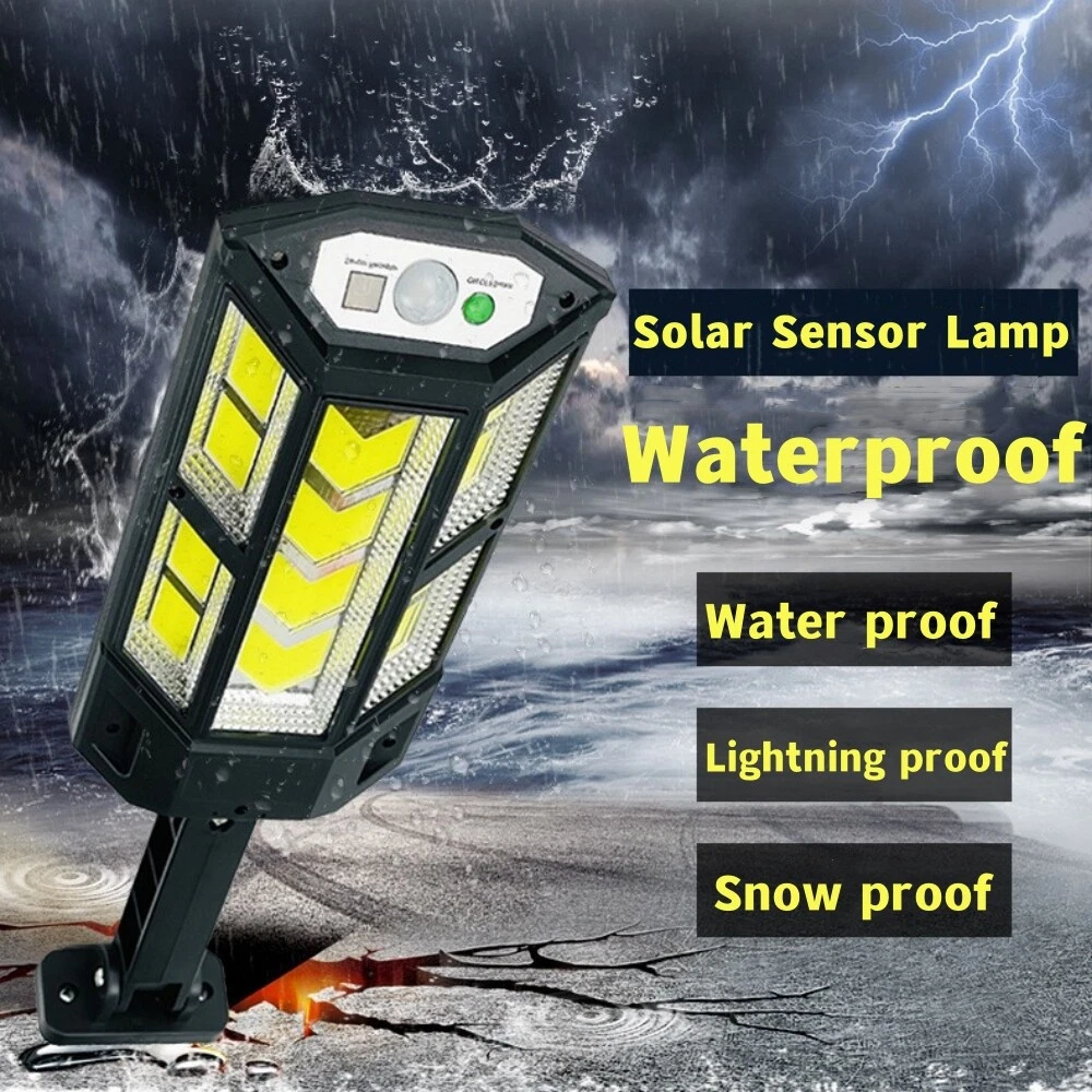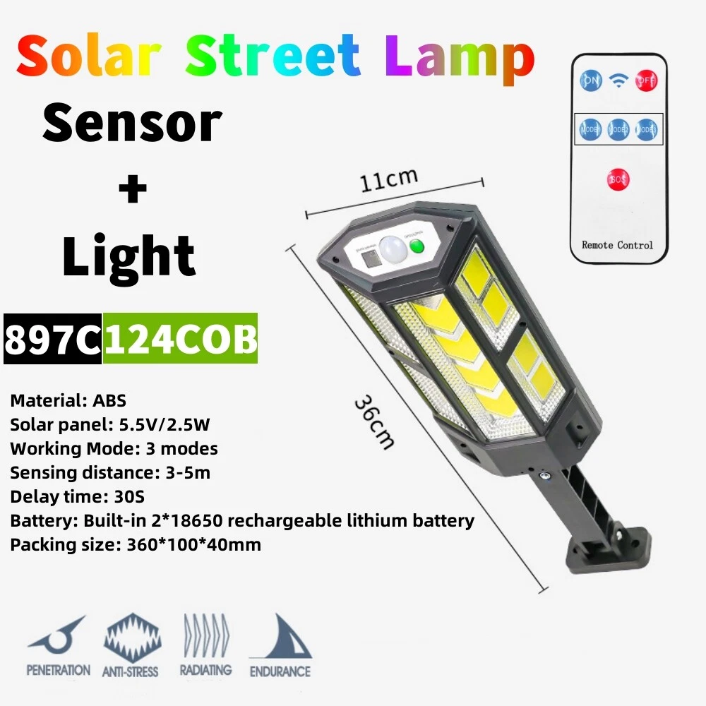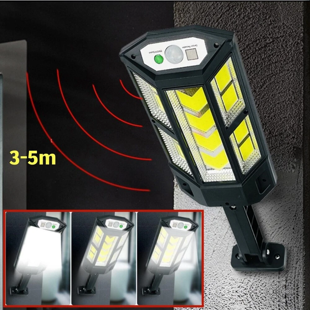 COB LED Solar Wall Light Commercial Dusk To Dawn Outdoor Garden Waterproof Road Street Lamp Flood Light with Motion Sensor Product Feature: Solar Powered: These solar light are made of more energy saving laminated solar panel and premium COB LED lights, which will be more durable and suitable for longer usage time. Build in 2200 mAh rechargeable lithium-ion battery and produce over 6000 lumens to allows the led solar lights to be continuously illuminated for 8-14 hours in bright mode to meet your lighting needs. 120° Wide-Angle Solar Lighting: The outdoor wall lights features high sensitivity and 180-degree adjustable bracket design, can sensitively sense moving objects in 10-15 FT with 120 degrees range, providing security and convenience for your home when night falls. 3 Lighting Modes + Remote Control: 3 Lighting modes are configured for this solar street lamp and a wireless remote control is provided. 1: Motion Sensor mode (Turn on when motion is detected, turn off after 20 seconds); 2: Smart Brightness Control mode (When there is no one, the light is weak, someone approaches and becomes strong light, but after 20 seconds, the light becomes weak); 3: Auto mode (Turns on automatically night and stay all night). Waterproof & Durable: This solar street lights outdoor is made of sturdy and durable ABS material, combined with IP65 waterproof and dustproof design to support the street lights solar powered can work in all kinds of harsh weather. Easy to Install: Compact joint design makes it is easy installed, it does not need any extra wire and special tools. The solar outdoor lights is water resistant and heat-resistant. A great solar security light for outdoor patio, garden, deck, yard, drive, streets, parking lots, basketball courts, outside wall, fence etc. Specification: Product Name: Solar Street Light Material: ABS Color: Black Light Color: Cold White 6500K Light Beads Quantity: 43LEDs/84LEDs/147LEDs/59COB/124COB/249COB Charging Method: Solar Powered Solar Panel: 5.5V 2.5W Power Capacity: Built-in 1200mAh 18650 rechargeable lithium battery. Working Mode: Three working modes Induction Distance: 3-5m Control Method: Button + Remote Control Waterproof Level: IP65 Lamp Body Size: As shown Charging Time: 6-8 hrs Working Time: 8-14hrs Please Note: All mode works only from dark to dawn, Please cover the solar panel during daytime testing Please allow 0.5-1cm error due to manual measurement. pls make sure you do not mind before you bid. Due to the difference between different monitors, the picture may not reflect the actual color of the item. Thank you! If you still have any issues during installation, defective items, replacements or refund, please contact our customer service e-mail for a prompt solution, we will get it resolved within 24 hours. Please rest assured that we always get your back whenever you are in need of assistance. Package Included: 4 x Solar Street Light Wall Light 4 x Remote Control