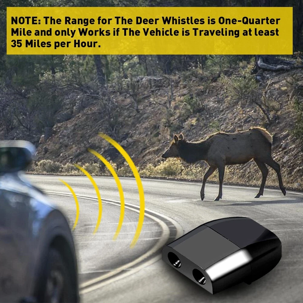 Specifications: Color: Black Material: ABS Suitable for: Universal Features: *Function These deer car whistles devices make a sound automatically while the car speed reaches 35km/h to drive animals away over a distance of several kilometers, which helps to avoid accidents caused by animals crossing the road. *Easy installation 1. Clean and dry the surface where you want to install the deer horns on your car 2. Tear off the double-sided tape 3. Press on it firmly for several seconds. *Special appearance design The deer whistle device with its small size can be attached to all types of bumper or grill, which is hard to notice and won't affect the appearance of your car. *Durable Made of superior ABS quality with excellent craftsmanship to ensure its long service life and durability. Packaging include: Deer Whistles*4