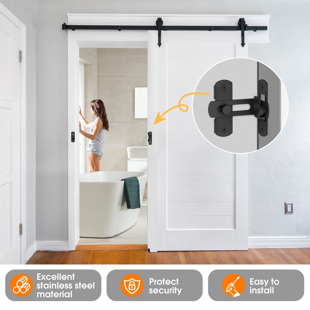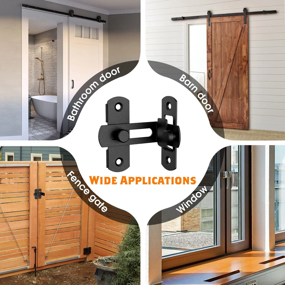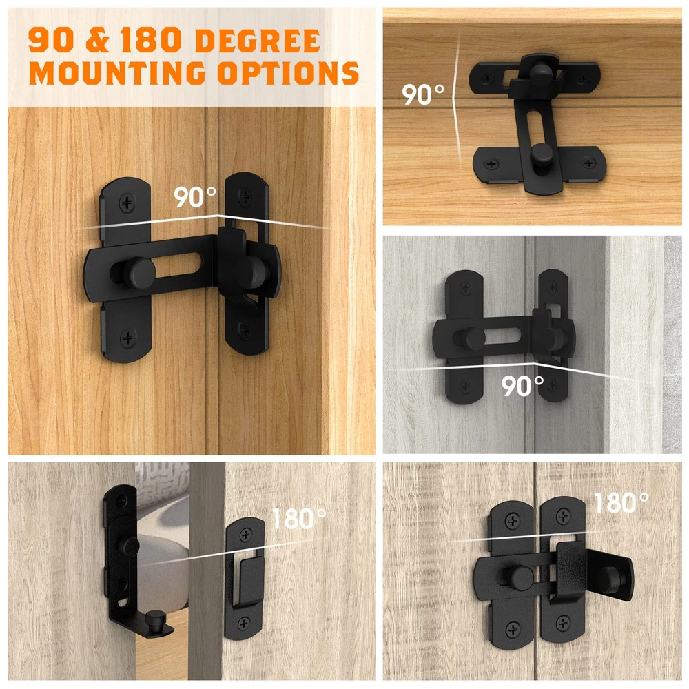 90 Degree Flip Barn Door Lock Latches, Matte Black Stainless Steel Flip Gate Latch Security Door Latch Lock for Barn Door, Pet Door, Bathroom, Cabinet Closet, Window, Sliding Door latch 90/180 Degree Door Lock: The 90/180 Degree barn door lock can be mounted at 90° right angles, also can be mounted at 180 degree angles for even more space-saving use. Ideal for family doors, bathrooms, gates, sheds, cabins, windows, cabinets, kitchens, offices, barn door latchs and more Reliable Material: The right angle door lock is made of stainless steel, multi-layer plating and corrosion resistance, ensuring durability and reliability Can be Installed at Various Angles: 90 degree right angle door latch buckle comes with mounting screws for attachment to wood or other flat surfaces, it's very easy to install, you just need to use a screwdriver to screw the 4 mounting screws to fix it. But you need to pay attention to the distance of the rotation card, if the distance is wrong, it will not work properly Safety & Privacy: Do not worry about people accidentally breaking in and compromising the privacy you need in your space. Barn door locks specifically designed for bathroom doors ensure your privacy Wide Applications: A safer way to lock your barn door, house door, sliding door, cabinet door and windows. Right-angle lock can be applied on family bedrooms, doors, gardens, bathrooms, cabinets, offices, etc Package List: 4* Black Barn Door Locks, 32* Screws, 16* Expansion Tubes