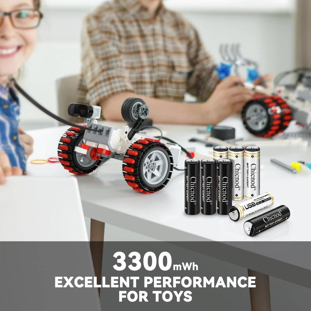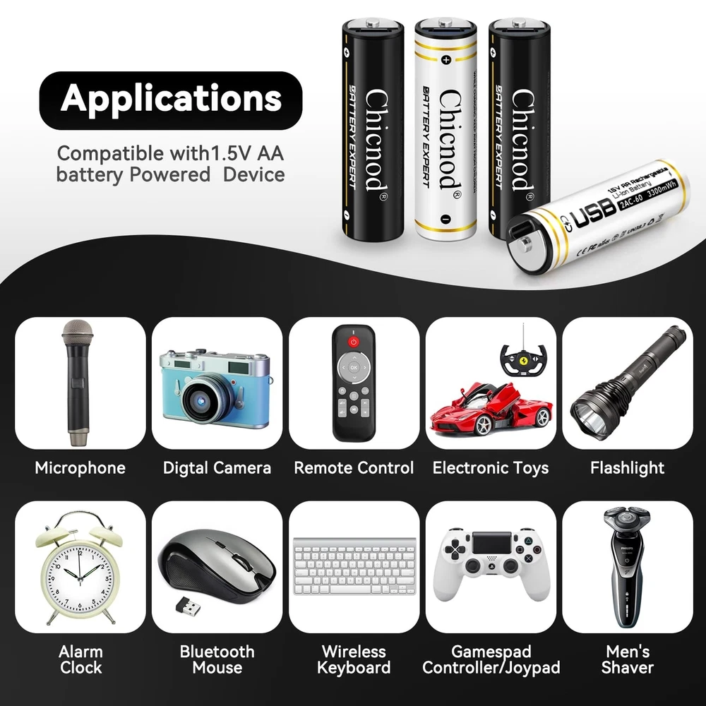 4Pack Rechargable AA Lithium Batteries, 3300mWh Double A Battery 1.5V Constant Output Lithium ion Double A Battery Long Lasting USB Fast Charging Product Details Number of Items: 4 Brand: CHICNOD MPN: 2AC-60 UPC: Does not apply EAN: Does not apply Number of Batteries: 2 A batteries required. (included) Brand: CHICNOD Battery Cell Composition: Lithium Ion Recommended Uses For Product: Toys Remote Control Flashlight, Gaming Controller Unit Count: 1.0 Count Product Dimensions: 3.94 x 3.7 x 0.79 inches Item Weight: 3.84 ounces Item model number: 2AC-60 Batteries: 2 A batteries required. (included) Date First Available: October 9, 2023 Manufacturer: Qinuo Dianzishangwu Shenzhen Youxiangongsi Country of Origin: China Lithium Batteries AA:High Capacity AA Li-ion batteries with 3300mWh Lithium ion battery,low self-discharge rate and long lasting use give you a better experience when playing electronic toys. Lithium ion battery has a better performance, it is lightweight and with a portable protective case very easy to storage. Quick Charge AA Batteries:Quick charge within 1.5hours and 2.5hours for standing charging speed. Comes with 2 usb to type c charging cord,1 black+ 1 in white. Do not need a battery charger, you can charge the batteries with any power source with USB port. Chicnod 4pack aa batteries can be fully charged within 1.5 hour for fast charging mode,2.5H by standard charging speed, comes with USB C 2 in 1 charge cable (1 Black,1 white),it not require any batteries charging adapter, it powered by USB power source like power-bank,power slot with USB bay ,DC or AC adapter or computer, laptop,easy to charge. Green led light indicates the charging is in processing ,and when it is green is fully charged. Safe Guarantee:Built-in PCB Protective Chip,to protect aa batteries from over-charge,over-discharge,over-heat and short-circuit. NOTE: DO NOT Use constantly for high current draw products, when the batteries discharge current higher than 2A it will be automatically shut off because of the over-current protection design. It is safe to use and charge. Precautions:1. Working condition:-20~60C Storage temperature:-10~25C 2. Please contact us if there anything need our help.