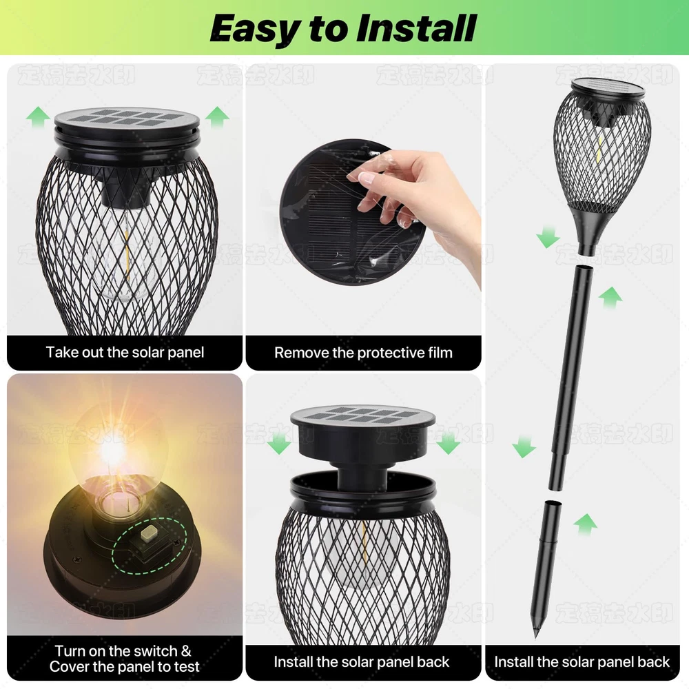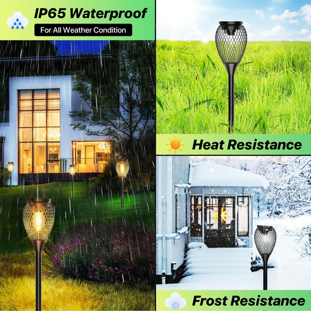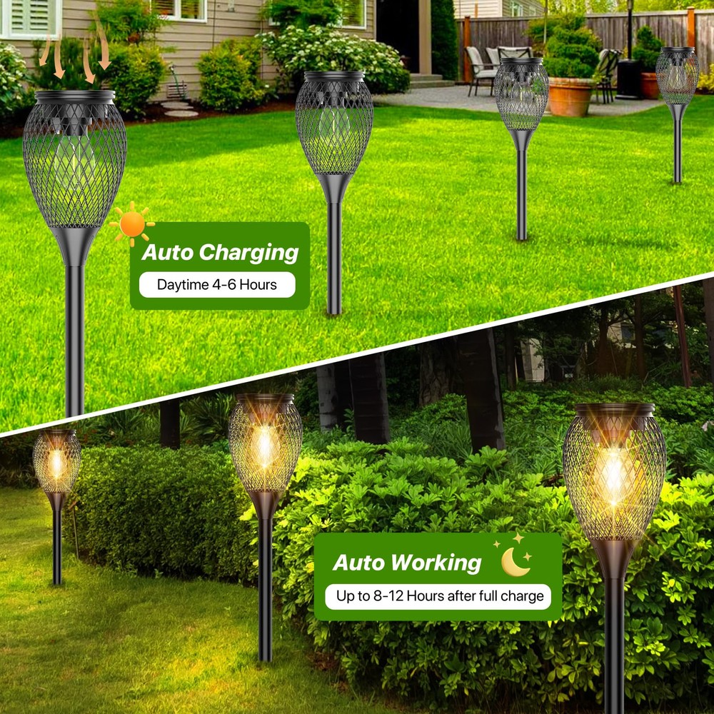 【Upgraded Brighter & More Durable】Upgraded bright solar pathway lights are made of metal material & tungsten bulbs & strong stakes, and thicker & more durable than other solar lights. The warm white outdoor solar lights are the perfect way to decorate your garden's landscape and light up your home. 【High Capacity & Longer Working Time】These solar path lights have a larger battery capacity of 1000mAh, while the others only 400mAh.The solar path lights provide 8-12 hour warm white illumination from dusk to dawn after a 4-6 hour charging time. The solar lights provide brighter lighting and work longer than other outdoor led solar pathway lights. The outdoor solar lights can automatically turn on at night and turn off at dawn by sensitively sensing the brightness. The solar lights can create a romantic atmosphere for your garden, lawn, driveway, pathway and yard. 【Easy to Install & 2 Adjustable Height】 No wiring or any tools are required to install these solar pathway lights. Just assemble and insert the solar landscape lights into the ground. Choose one pole or two for installation, adjustable height of the solar lights can greatly meet your different lighting and decoration needs. You can install these solar garden lights in your garden, yard, pathway, sidewalk, driveway etc. ★Note: Please make sure to turn ON the switch before charging. (switch is under the solar panel)★ 【Best Gift Choices】: The sidewalk solar lights can provide a perfect lighting atmosphere for any outdoor places, such as garden, yard, lawn, path, walkway, patio, porch, balcony, etc. The Solar stake lights outdoor decorative are great gift ideas for Holiday, Christmas, Birthday, Anniversary, Mother’s day, Party etc. The solar garden lights can bring more happiness & surprise for your family members and friends etc. 【Weatherproof & Warranty】The solar garden lights are waterproof IP65, which can withstand sunny, rainy, and snowy days. Besides, we provide 60 days replacement or risk-free refund warranty for our solar powered lights. If you have any questions about our landscape path lights, please contact us immediately and we will do our best to make you satisfied.