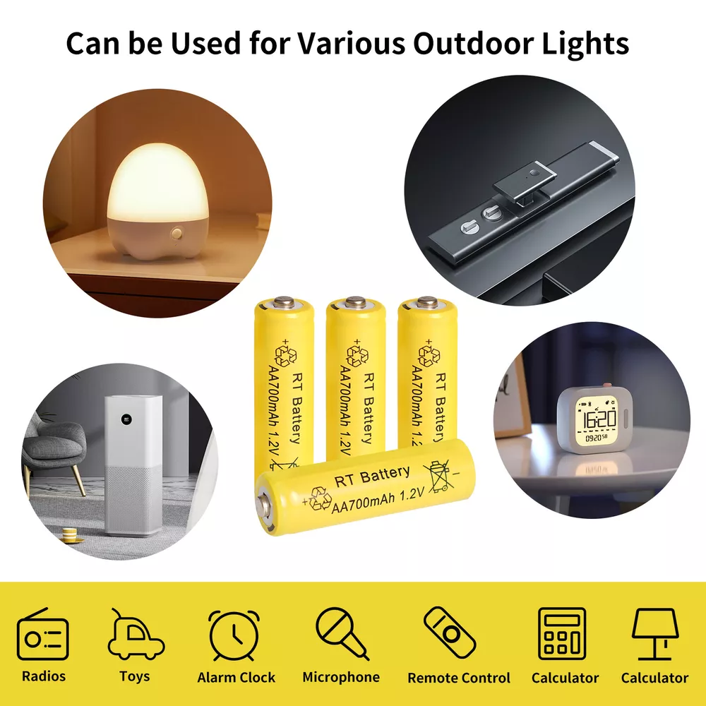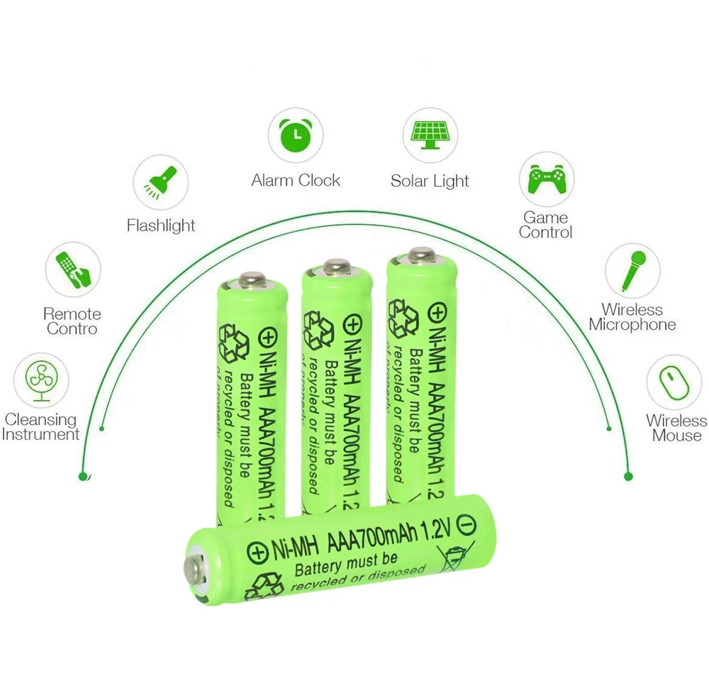 4Pcs AA & 4Pcs AAA Ni-MH Rechargeable Batteries 1.2v with 4 Slot Charger & Battery Plastic Storage Case Warm Tips: Before use, please remove the plastic packaging film of the battery. AA / AAA NiMH Battery 1.2v Features: 1.【Widely used】 The AA batteries rechargeable 1.2v is perfect for solar garden lights, landscape lights, lawn lights, etc.It can replace all disposable alkaline batteries for low power electronic products. 2.【Easy to Charge】 The AA rechargeable batteries Ni-MH can be charged by solar lights or standard charging devices. Better high-temperature performance than other types of batteries, can be used from -4℉ to 140℉, and can be charged from the sun even in the snow. 3.【Safe and Reliable】 The Ni-MH AA 1.2v rechargeable battery is very safe and reliable. For transportation safety, these Ni-MH AA batteries are only pre-charged to 30%, so please charge them before use for longer working time. 4.【Durable】 Our Ni-MH AA batteries rechargeable have a capacity of 700mAh and can be recharged at least 500 times continuously. Save you the cost of buying disposable alkaline batteries and reduce the harm to the environment. 5.【Suggestion】 Please charge the battery after each power exhaustion, otherwise it will affect the capacity and life. In addition, charge every 3 months to extend the life of the battery. NiMH AA Battery 1.2v Specification: Capacity: 700mAh Voltage: 1.2V Size: diameter 14mm*50 mm Terminal Type: Button Top Chemistry: Ni-MH (Nickel Metal Hydride) Rechargeable Times: Up to 1000 times No Memory Effect Note: Do not disassemble or modify the rechargeable battery NiMH AAA Battery 1.2v Specification: Capacity: 700mAh Voltage: 1.2V Size: diameter 10mm*44 mm Terminal Type: Button Top Chemistry: Ni-MH (Nickel Metal Hydride) Rechargeable Times: Up to 1000 times No Memory Effect Note: Do not disassemble or modify the rechargeable battery Package Included: 4X Ni-MH AA 1.2v Rechargeable Battery 700mAh 4X Ni-MH AAA 1.2v Rechargeable Battery 700mAh 2X Plastic Battery Storage Cases 1X AA AAA USB Universal Battery Charger 4-Slot Warm Tips: 1. Before use, please remove the plastic packaging film of the battery. 2. Please check the "+" and "—" directions of the battery before you charge the battery. 3. Do not put the product into fire, short circuit, dissassemble and extrude. 4. Do not mix charging with different type of batteries, which may explode or leak, causing personal injury. 5. Please use up the power each time, then recharge it otherwise it will affect its capacity and lifetime. 6. Please take out the battery if you won't use for a long time to avoid battery leakage. 7. Note:Please find us in first time when you find the parcel Broken/Scratch/Function Error/Miss Parts/Unwork/has not arrived etc, we always have more details and solutions, even duty for your order. On Dec 27, 2024 at 23:02:48 PST, seller added the following information: