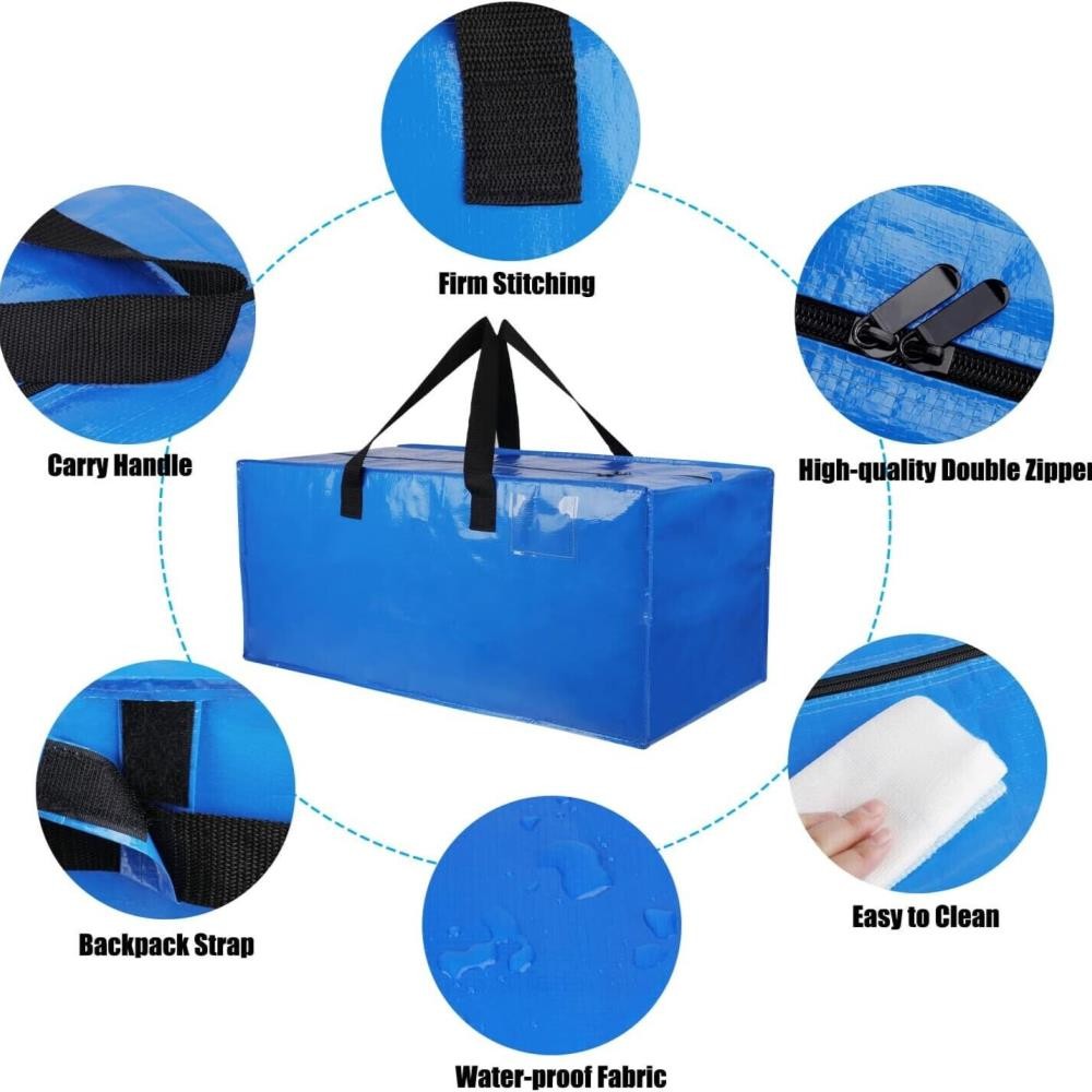 Key Features: ��� EXTRA LARGE CAPACITY: The 24.5 gallon moving bags with zipper, Size 29" X 15''X 13" H, blue packing bags with handles can hold plenty of clothes. Made by 180gsm PP material, thicker than others’ 120gsm or 150gsm, foldable to a small size when not use. ��� HEAVY DUTY HANDLES: The extra large moving bags feature wide and thick handles with multiple layers of reinforcement and strong nylon thread stitching, along with top quality zippers, largely enhanced the load-bearing possibility, this blue bags with handles can safety hold up to 80lbs. ��� CONVENIENT BACKPACK STRAPS: Designed the blue moving bags with handles and backpack straps, Upgraded shoulder strap allows for easy carrying on your shoulders, stylish and save effort, you can use it for moving to college dorm, new house freely, or as traveling backpack. ��� LARGE OPENING WITH ZIPPERS: Features a high-quality dual zippers closure that opens all the way down side, provides the heavy duty moving bags a LARGE OPENING when to pack and unpack. ��� VERSATILE MOVING & STORAGE: Alternative to moving boxes medium and large or plastic storage bins, the heavy duty storage bags is flexible for clothing storage, purses, shoes, extra beddings, blanket, comforters, pillows, wardrobe boxes, home organization, Christmas holiday decorations; moving to new house/department, college students dorm room essentials. Specifications: 1.Color: Blue 2.Size: 29*15*13 3.Material: PP 4.Special Feature: Foldable, Large Capacity, Handle 5.Load Capacity: 80 Pounds 6.Number of Items: 4