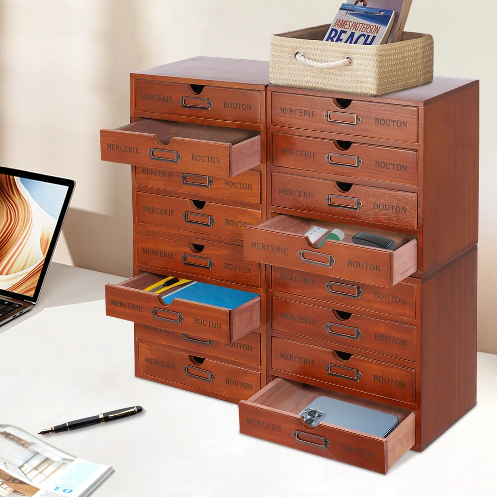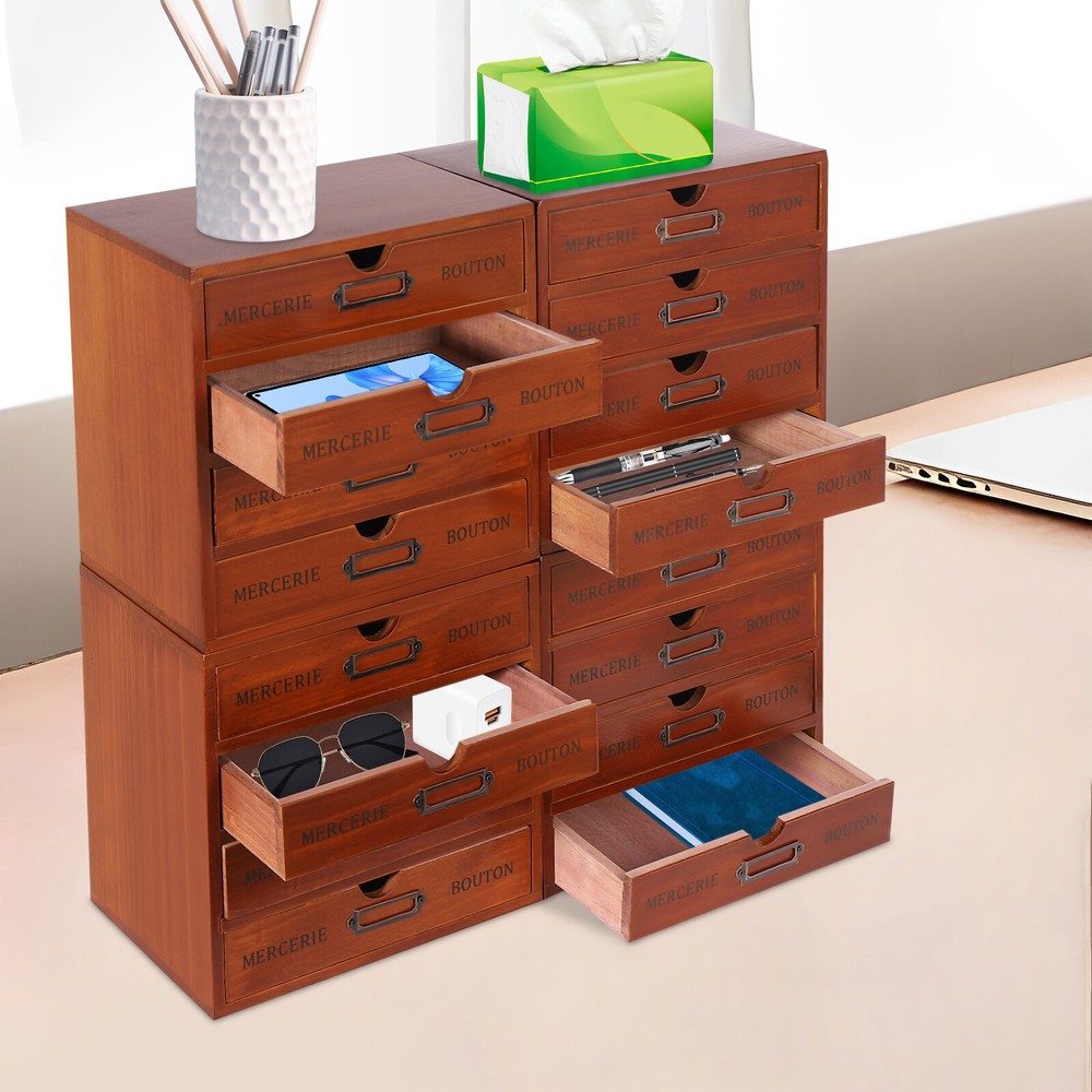 Specifications Style: Retro Color: Brown Material: Pine Wood, Iron Process: Spray Painting Shape: Rectangular Assembly Required: No Number of Drawers: 16 Number of Items: 4 Mount Type: Tabletop Each Drawer Max. Load-bearing Capacity: 1kg/2.2 lbs Total Max. Load-bearing Capacity: 16kg/35.27lbs Each Drawer Size: 21*15.5*3.81cm/8.25*6*1.5inch Each 4-tier Drawer Organizer Size: 24.5*17.5*24.5cm/9.6*7*9.6inch Overall Size of 4 Stacked Drawer Organizers: 49.8*17.5*49.8cm/19.6*6.89*19.6inch Package Size: 57*41*32cm/22.44*16.14*12.6inch Gross Weight: 10kg/22.05lbs Net Weight: 8.8kg/19.4lbs Package Included 4* Drawer Organizers 4Pcs Retro Drawer Organizers, Wooden Desktop Organizer, Wooden Storage Box Brown Description This drawer organizer set is a four-piece set, including 16 drawers. It is designed to make full use of space and achieves fine classification storage so that it will make your life and work more orderly. The retro style shows an antique charm, which can express a refined sense of fashion. This product has a small footprint and lots of storage space, making your life more organized and tidy, get it now. Key Features High-quality Material: The drawer organizer set is made of pine wood with a painting spraying process, which has good corr osion resistance, is sturdy and durable, and can be used for the long term. Vintage Appearance: The pleasing brown color, vintage metal label holder, rectangular structure, and smooth lines give it a retro style, adding beauty and vintage elements to your room. It plays a unique decorative role while using, bringing an old-world charm into your new-world home. Set of 4: Our package includes 4 pieces of organizers, including a total of 16 large-capacity drawers, which are enough to easily store jewelry, cosmetics, documents, and other small items, making your desktop cleaner . You can use these wooden storage boxes as a set or separately for different areas in your home. ' ' Excellent Load-bearing Capacity: Thanks to its thickened material and rectangular structure, each drawer can hold about 2.2 lbs of items, and this product can hold about 35.27 lbs in total, so you can use it with confidence. Space-saving: The size of a single drawer is 8.25*6*1.5inch , which occupies a small area and the multi-tier design uses vertical space rationally, so you get more space to store items without taking up too much desk spac e. Moreover, they are stackable for your convenience. Convenient to Use: Hollow-out handle on each drawer makes it easier to pull out and close the drawer, which not only provides convenience but also enhances the aesthetics of the entire product. Ready to Use: It does not need assembly, so you can directly use it after receiving and cleaning it, greatly saving time and effort. Easy to Clean: With a smooth surface and detachable drawers, it is very easy to clean with a damp cloth (not included). Ideal Gift: With a delicate outlook and practical storage function, it is a wonderful housewarming, wedding, or festival gift for your families, friends, or colleagues. Protective Package: Foam can effectively reduce the normal impact and ensure that it is fully delivered to you to the greatest extent. Details Iron Label Holders: They allow you to write the labels (not included) for each drawer to categorize, helping you quickly find desired items. Smooth Edges: Smooth and burr-free edges no t only increase the beauty of the product but also improve the safety of use. Application This product can be used in living rooms, bedrooms, study rooms, offices, dormitories, schools, and other places. It can be used to store cosmetics, files, books, letters, papers, magazines, tea bags, sugar packets, necklaces, earrings, bracelets, rings, perfumes, lipsticks, household medications, herbs, nutrition-related capsules, and other items. Specifications Style: Retro Color: Brown Material: Pine Wood, Iron Process: Spray Painting Shape: Rectangular Assembly Required: No Number of Drawers: 16 Number of Items: 4 Mount Type: Tabletop Each Drawer Max. Load-bearing Capacity: 1kg/ 2.2 lbs Total Max. Load-bearing Capacity: 16kg/35.27lbs Each Drawer Size: 21*15.5*3.81cm/8.25*6*1.5inch Each 4-tier Drawer Organizer Size: 24.5*17.5*24.5cm/9.6*7*9.6inch Overall Size of 4 Stacked Drawer Organizers: 49.8*17.5*49.8cm/ 19.6 *6.89* 19.6 inch Package Size: 57*41*32cm/ 22.44 * 16.14 * 12.6 inch Gross Weight: 10kg/ 22.05 lbs Net Weight: 8.8kg/ 19.4 lbs Package Included 4* Drawer Organizers Notes The material of the product is pine wood, so the surface may have some flaws, which is a normal phenomenon. Please check the quantity carefully after receiving the product. Please note that this product does not include other items shown in the picture. Please do not place it in a damp place or near an ignition source. Please allow the slight color difference caused by the shooting light and 1-3cm error due to manual measurement, and make sure you do not mind before you order. Payment Delivery details Terms of sales About us Contact us Payment We accept ebay payment 。 Fees such as import duties, taxes are not included in the item price or shipping costs. These charges are the buyer's responsibility. Delivery details Shipping: 2-9 working days to: USA Terms of sales We maintain high standards of excellence and strive for hundred percent customer satisfaction. Feedback is very important to us. We hope that you contact us immediately before you give neutral or negative feedback, so that we can address your concerns. It is impossible to address issues if we do not know about them! About us Your satis faction is our ultimate goal. We work hard to earn your trust and future business. Our certified technicians have tested each item before shipping. The unit comes with 1 year limited warranty on all manufacturing defects. a) If you receive a defective item, you may return it or ask for a discount. Please contact us within 14 days after you receive the package. b) What you returned must be intact and i