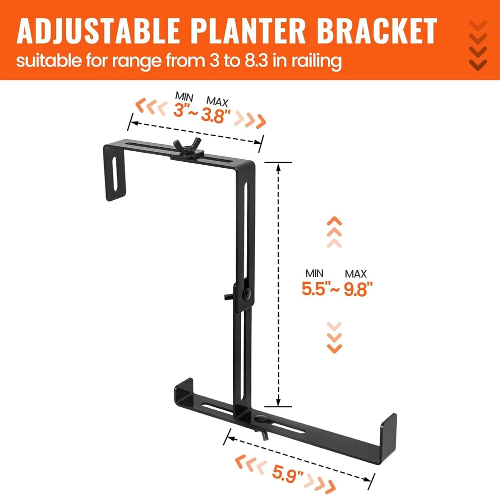 4Pcs Steel Window Box Brackets Adjustable Planter Box Brackets for Railings Details: 【Adjustable Planter Bracket】 The set of 4 window box brackets feature an adjustable top and middle design. The top width can be freely adjusted to accommodate your railing width, ranging from 3 to 8.3 inches, while the middle height can be adjusted from 5.5 to 9.8 inches, allowing you to customize the size to meet your specific needs. Enjoy the freedom to personalize your space with ease! 【Sturdy & Durable】 Made of high-quality steel with a 3mm/0.12in thickness and coated with a protective powder finish to prevent fading and corrosion. Featuring non-rusting, enduring carbon steel screws, guaranteed to provide great support for your planters. The maximum load capacity is up to 90 lbs. 【Excellent Design】 Are you still worried about the flower pots being too heavy or the railings being too thin and tilting? To prevent this issue, we've added a flexible support bar at the bottom. This component allows you to adjust it to your specific usage requirements, ensuring optimal positioning of your pot. 【No Drill Installation】 Say goodbye to drilling holes or damaging surfaces. These no-drill planter box brackets are easy to install without the need for any tools, saving you time and effort. You can set it up in minutes and enjoy its stability for years to come. 【Wide Application】 Our flower box brackets are ideal for indoor and outdoor use, and suitable for places where hanging flower pots are required, such as courtyard walls, balconies, terraces, railings, etc. Enjoy the freedom to hang your plant or flower pots wherever you'd like! Specifications: Material: Carbon Steel Quantity: 4 Pcs Color: Black Thickness: 3mm/0.12in Adjustable Top Width Range: 3 to 8.3 inches Adjustable Middle Height Range: 5.5 to 9.8 inches Net Weight: 4.4lb Package Included: 16 x Brackets 16 x screws 16 x nuts VICBAS 4 Pcs Adjustable Planter Window Box Brackets Sturdy & Durable, Simple Installation. Enhance the beauty of your outdoor space with the LFGUD 4 Pcs Window Box Brackets. These adjustable planter box brackets are designed to securely hold flower boxes, making it easier than ever to create a stunning display of vibrant blooms. The top width can be freely adjusted to accommodate your railing width, ranging from 3 to 8.3 inches, while the middle height can be adjusted from 5.5 to 9.8 inches Made of high-quality steel with a 3mm/0.12in thickness and coated with a protective powder finish to prevent fading and corrosion. The adjustable design allows you to easily customize the sizing to fit your specific needs, ensuring a perfect fit every time. To prevent this issue, we've added a flexible support bar at the bottom. This component allows you to adjust it to your specific usage requirements, ensuring optimal positioning of your pot. These no-drill planter box brackets are easy to install without the need for any tools, saving you time and effort. You can set it up in minutes and enjoy its stability for years to come. 16 x Brackets 16 x screws 16 x nuts Our flower box brackets are ideal for indoor and outdoor use, and suitable for places where hanging flower pots are required, such as courtyard walls, balconies, terraces, railings, etc. Enjoy the freedom to hang your plant or flower pots wherever you'd like! FAST SHIPPING WARRANTY EASY RETURNS CONTACT US FAST SHIPPING We only ship to US mainland 48 states and worldwide via ebay international shipping program. We don't offer direct international shipping. Consult us if you live in Hawaii, Alaska or Virgin Islands. Also we don't ship to any APO/FPO/PO BOX address. We offer FedEx Ground or Home delivery in optional which can make it faster, charge additional shipping fee. Delivery is any day from 1-5 business days (Monday through Friday, excluding weekends and holidays) WARRANTY This item is covered by our 12 months unlimited mileage warranty. Any customer may use the same outlets to facilitate a return or warranty claim. Any item must be returned within 30 days of the original purchase for refund; item(s) retaining a warranty may be returned beyond 30 days but within the remaining warranty period. Returns that are not subject to warranty may accrue a restocking fee and should be returned at the customers cost. We reserves the right to request proof of purchase and mechanical failure in the event of any warranty claim; any returns or claims that violate Ebay's Online Return policies will be reported. We holds no responsibility or liability for additional repairs, damages (punitive or non-punitive), loss of time, or any other extraneous circumstances created by a purchase made from said party. EASY RETURNS We understand that sometimes you need to make a return or an exchange. All we ask is you send it back in the same condition it was received - new and un-used. If the product you receive is not the one you ordered, please take photos of any visible of visual reference and contact us directly; photos must be CLEAR and VISIBLE. Logistical claims must be filed within 30 days of received the product; exchanges in these cases will be handled promptly and at?no cost to the customer. In order to process a return or exchange, please call us or send us a message through eBay and we will be happy to assist you immediately. However,any return that is NOT defective or NOT received in error, is the responsibility of the customer. We DO NOT cover any shipping costs and/or additional fees associated with the transaction. CONTACT US We are open Monday to Friday 8am to 5pm Mountain Standard Time, and Saturday 9am to 1pm MST. Our friendly staff are available during these hours. Please feel free to call us, or send us a message via eBay. We aim for complete customer satisfaction and repeat business; we will be more than happy to help you feel 100% comfortable with your purchase.