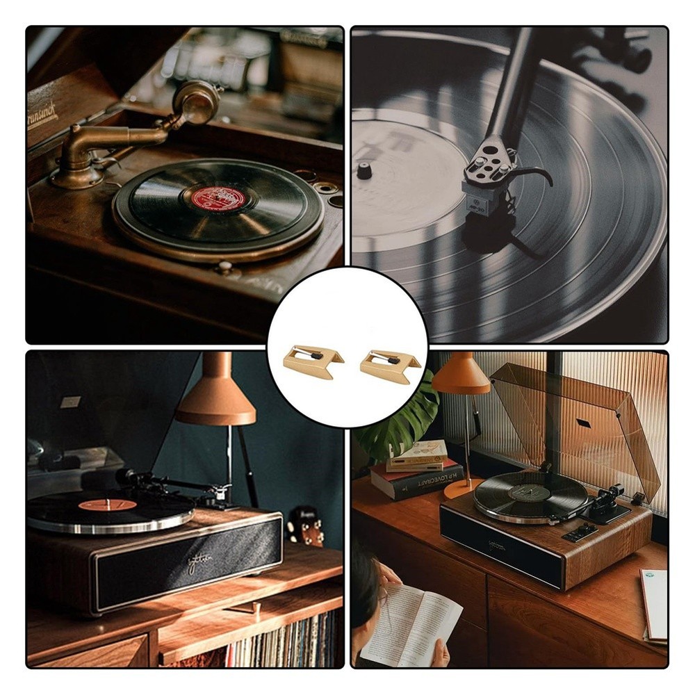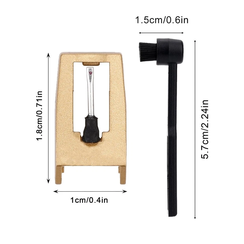 Record Player Needle Kit, 4Pcs Turntable Needles with 1Pcs Stylus Cleaning4282 This record needles and cleaning brush bundle is special for vinyl music lovers, 4pcs record player needles are perfect as replacement needles or as a backup for your old one. The quality stylus cleaning brush helps you regularly care for the needle to maintain its long work. With a standard conical needle tip, this record player needle can into the vinyl grooves by its strong tracking ability to give clear and smooth stereo tones. And more, this turntable needle 't skid and not harm your precious vinyl albums. Our turntable stylus can fit most portable-type record turntables in the market now. This record needle is easy to replace without any tools; It supports playing 16, 33,45rpm vinyl albums, and the record replacement stylus is easy to install without needing any tools. This record stylus can give a more pure and smoother sound and enjoy more delicate music when playing classical, rock, , jazz, or other music. Color: red+gold+black Material: plastic + aluminum Package Contents: 4 x Replacement Stylus 1 x Stylus Cleaning Brush