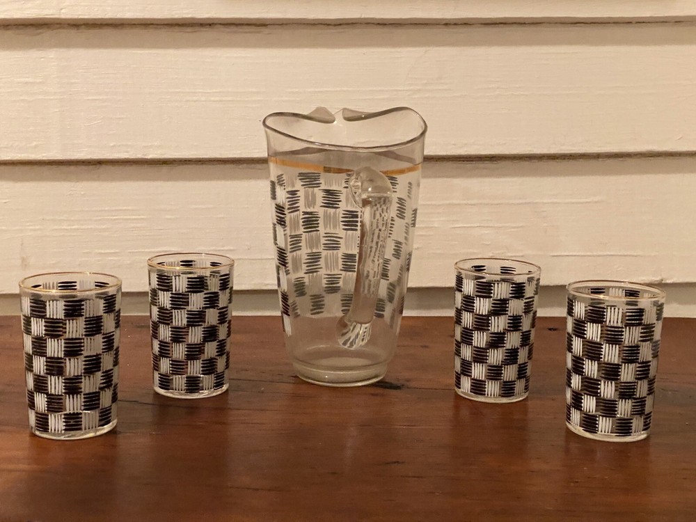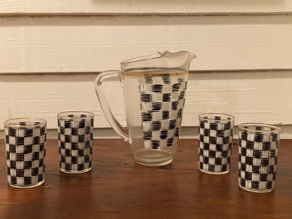 Set of four glass tumblers and a glass pitcher featuring a checkerboard design and gold trim. Good condition. Measurements: tumblers are 3 3/8” tall and 2 3/16” diameter; pitcher is 6 3/4” tall x 7” wide