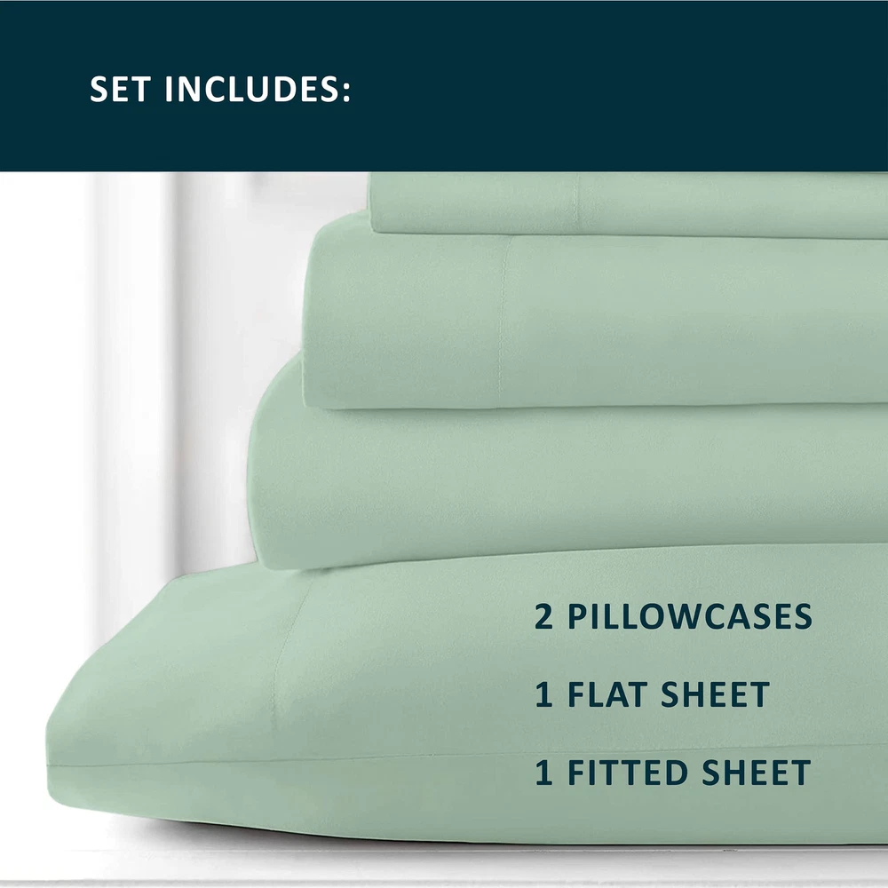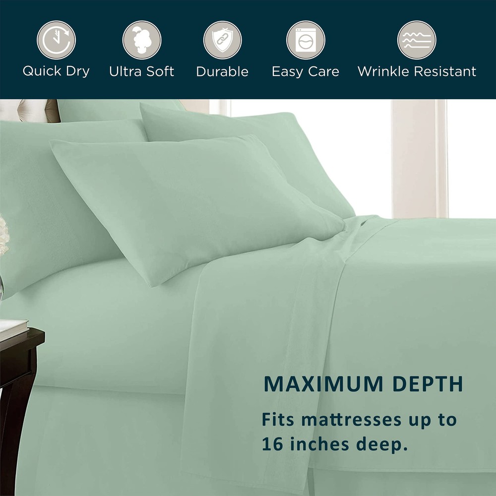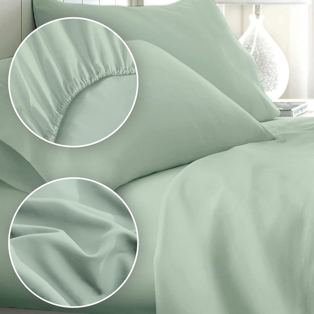 Every slumber will feel like a luxury escape with this (TM) Celadon 4-Piece Microfiber King Sheet Set adorning your mattress. The solid designer colors bring vibrant palette options to your bedroom decor, and the microfiber fabric is superior blended for an ultra-soft feel that cradles you in the bliss of a 5-star hotel experience. This unique material is strong, durable, and breathable, and the sheets are fade, stain, , and shrink resistant to retain their shape, so they always look and feel fresh and opulent. 4-piece king sheet set includes 78" x 80" x 14" fitted sheet (fits mattresses up to 16 inches deep), 108" x 102" flat sheet, and 20" x 40" king size pillowcases. Made of 100% microfiber. Machine washable in cold water and tumble dry quickly to save energy. LUXURY SLEEPING EXPERIENCE: sheets are made of microfiber that is superior blended for an ultra-soft feel that cradles you in comfort MICROFIBER FABRIC: strong, durable, breathable material is and shrink resistant to ensure sheets hold their shape DESIGNER COLORS: the palette options bring vibrance to your bedroom décor and the sheets are fade and stain resistant so they always look fresh and vivid 4-PIECE KING SHEET SET: includes 1 fitted sheet that fits mattresses up to 16 inches deep, 1 flat sheet, and 2 king size pillowcases EASY CARE: machine washable in cold water and tumble dry quickly to save energy
