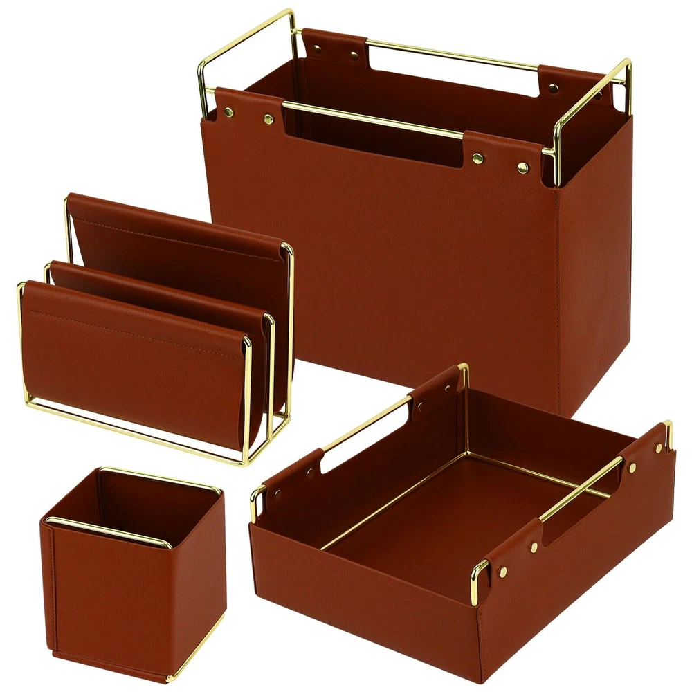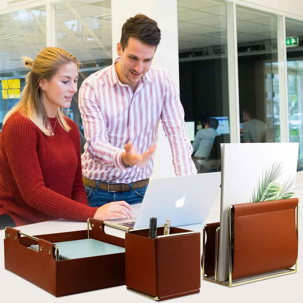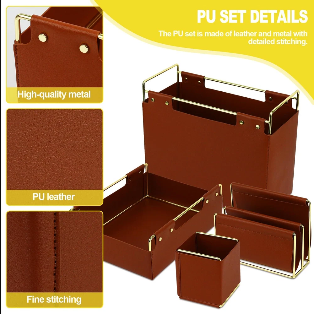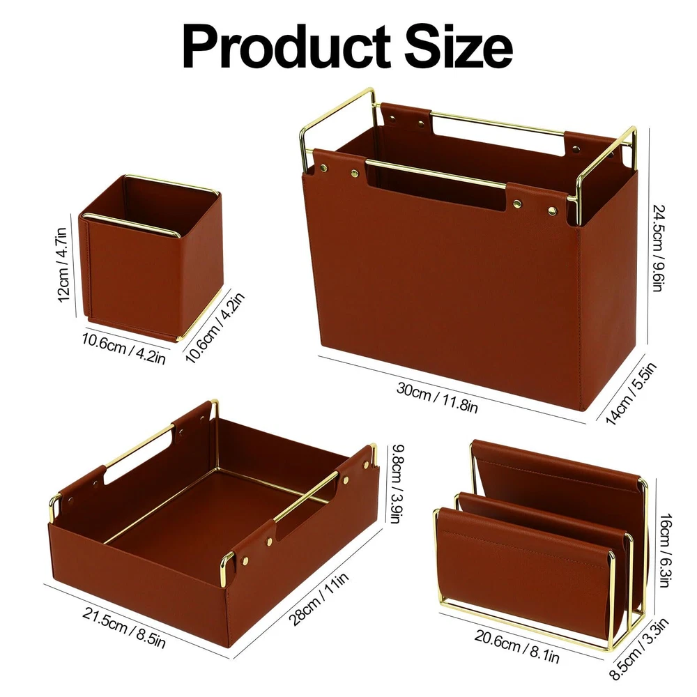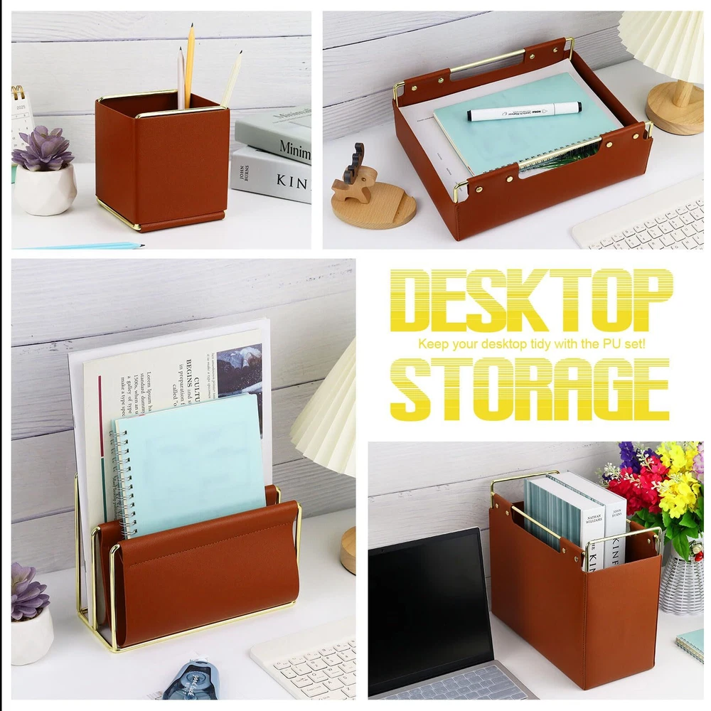 Introducing our Premium Leather Desktop Storage Organizer Set – the ultimate solution for decluttering and enhancing your workspace. Crafted with meticulous attention to detail and an unwavering commitment to quality, this organizer set is a stylish and functional addition to any professional or home office. Premium Quality Leather Craftsmanship: Crafted from durable and elegant genuine leather, our desk organizer set not only looks stunning but also withstands daily use, ensuring a timeless addition to your workspace. Versatile Organization Solutions: Designed to maximize your desk space, this set includes multiple compartments, trays, and pockets tailored for pens, notepads, business cards, documents, and small office essentials, keeping everything neatly in place. Enhances Professional Image: Elevate your work environment with a sophisticated leather organizer that reflects your professionalism and attention to detail. Impress clients and colleagues with a well-organized workspace. Easy Access & Quick Cleanup: With its thoughtful layout and smooth leather surfaces, accessing your items is effortless, while spills and dust are easily wiped away, maintaining a clean and professional look. Package:Include: 1*Pencil Cup, 1*Business Card Holder, 1*Letter Tray, 1*Files Holder