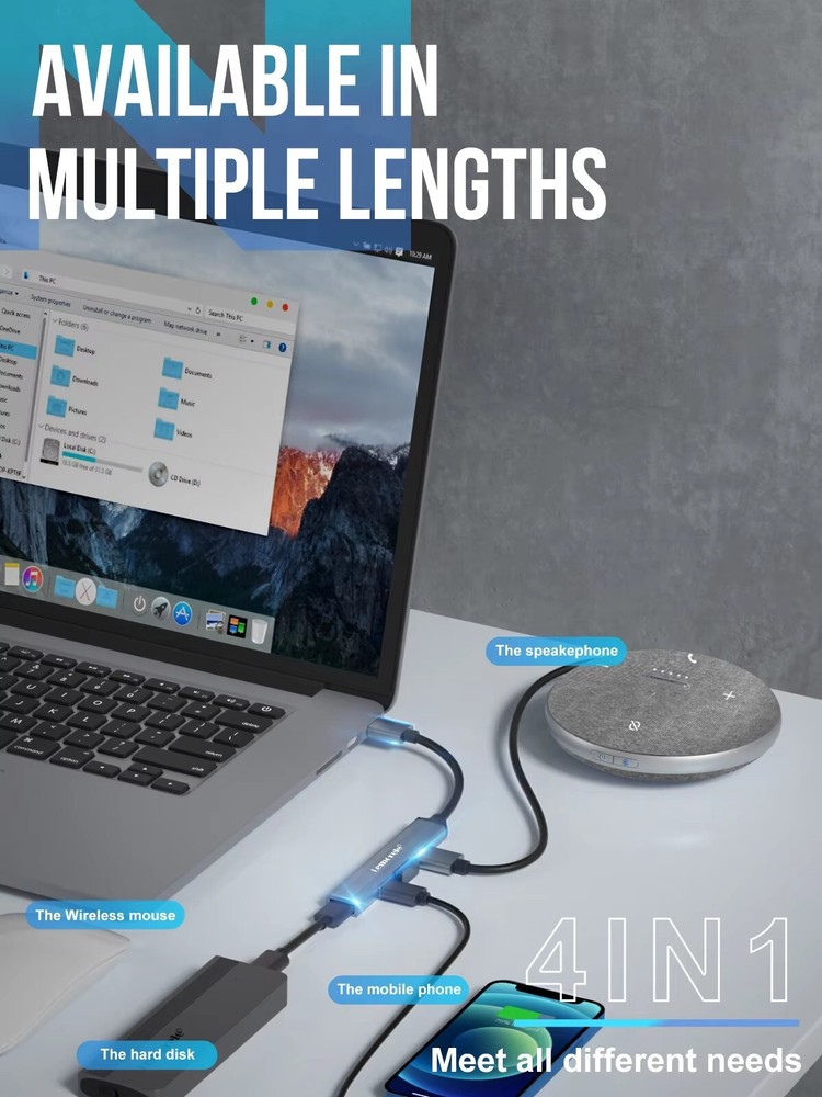 Product introduction: 1. USB-C 4-in-1 multi-function docking station, 3 USB2.0 ports, 1 USB3.0 interface, 2. Aluminum alloy material, anodizing dual process, excellent heat dissipation effect, perfect solution to the heating problem. 3. Compatible with more devices, suitable for Huawei, Lenovo, Dell, Asus... Computer with USB C interface 4. 20cm/60cm /120cmcable, more convenient to use