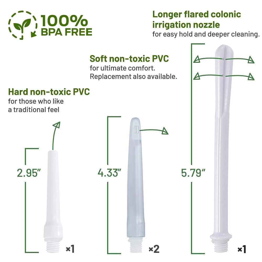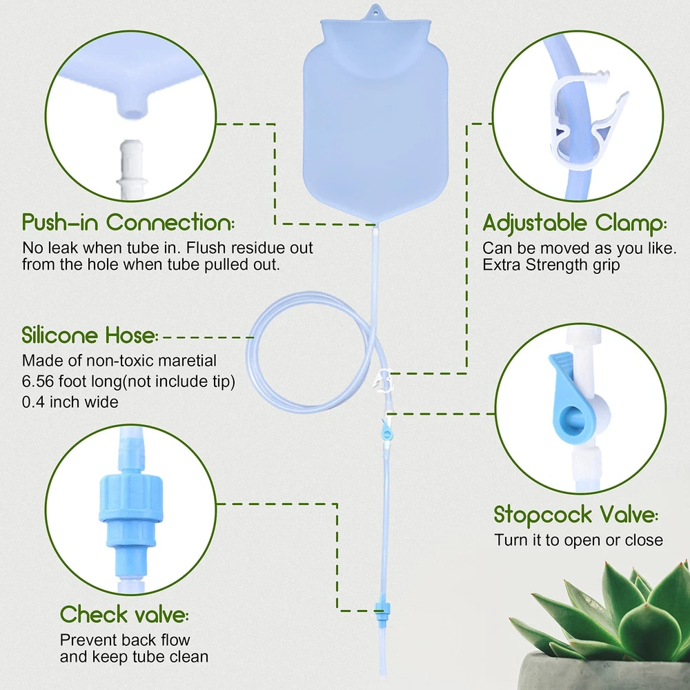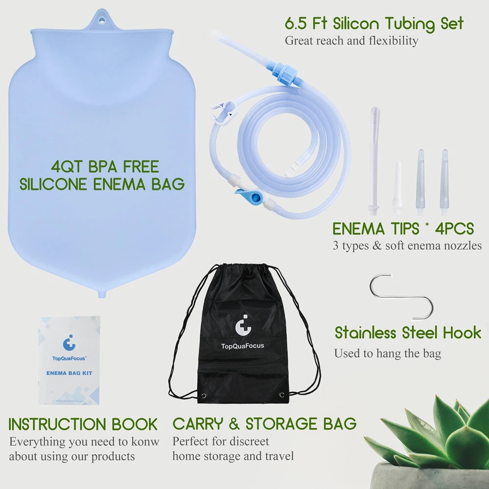 . What You Have In the Kit 1. Clear Non-Silicone Enema Bag*1PC 2. Sturdy Metal Hook*1PC 3. Stopcock Enema Valve*1PC 4. Strong Adjustable Clamps *1PC 5. 3.67" Soft Nozzle*2PCS 6. 5.3" Long Colonic Irrigation Nozzle*1PC 7. 2.4" Short Colonic Irrigation Nozzle*1PC 8. Non-Return Valve*1PC 9. 200cm(6.5FT)Silicone Hose*1PC 10. Black Storage Bag*1PC 11. Cleaning Brush*1PC for cleaning hose 12. Connector for enema bag Specification: Item name: Enema Stainless Bucket Uesd for: Man and women Material: Stainless steel Capacity: 4.0L Idea for: Constipation, Privacy Part Clean Enema Feather Improving An Age-Old Self-Care Ritual since ancient times, people all over the world have used enemas to douche and aid healing. The tools we use to conduct them have evolved, from mouth blown pipes, to bronze pumps, to todays enema colon cleansing kits that can be used at home. An enema kit for personal use - a basic colonic hydrotherapy session in the privacy of your own home. Beneficial for colon cleansing. Beneficial for weight loss support. Beneficial for constipation. Beneficial for elimination of accumulated fat, waste, toxins and parasites. Beneficial for fermentation and putrefaction in the gut. Important Notice: 1.Stopcock Enema Valve is closed When you receive the product. When start to use the enema bag, Please push the valve and keep the valve open, the liquid can flow into the tube. 2.When the Valve is closed, the liquid can not flow into the tube. 3.The non-return valve is black and white, please check it whether it is tight before use. 4.The Stopcock Enema Valve can pull out from the clear cross connector, it is designed for you to clean the tube. Please clean this blue part before use it. Why Choose Enema Bucket Kit Get the Product From the Manufactory, Get the Best Selling Service, Get the 90 Day ✅ Materials --- This colon cleansing enema bag is made of reusable silicone, odorless, BPA and phthalate-free. ✅Clear Enema Bag --- The Cleaning bag is fully transparent and visibility, you can know exactly how much liquid is in the bag. It’s very convenient to use. ✅ Easy Cleaning and Dry --- No worry about that there’s dirty things in the clear bag. Because the big top opening is very easy to fill and clean the bag. Even dry it quickly to avoid bacterial growth. ✅ 6.5FT Long Silicone Tube --- Comes with blue stopcock valve allows you can precisely control how fast or slow the enema solution flows, anti-back valve avoids water flowing back, making you get more comfortable and pleasant enema experience. ✅ Easy Change and Cleaning Shower Tips --- You can get 3 kinds & total 4 tips to give you option. All tips are soft, smooth and well for customer’s body. All the tip’s connect type is screw thread for easy changing and cleaning.